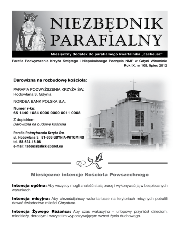 NIEZB¢DNIK PARAFIALNY Miesi´czny dodatek do parafialnego kwartalnika „Zacheusz” Parafia Podwy˝szenia Krzy˝a Âwi´tego i Niepokalanego Pocz´cia NMP w Gdyni Witominie Rok IX, nr 105, lipiec 2012 Darowizna na rozbudow´ koÊcioła: PARAFIA PODWY˚SZENIA KRZY˚A ÂW. Hodowlana 3, Gdynia NORDEA BANK POLSKA S.A. Numer r-ku: 65 1440 1084 0000 0000 0011 0008 Z dopiskiem: Darowizna na budow´ koÊcioła Parafia Podwy˝szenia Krzy˝a Âw. ul. Hodowlana 3, 81-606 GDYNIA-WITOMINO tel. 58-624-16-08 e-mail: [email protected] \ Miesi´czne intencje KoÊcioła Powszechnego Intencja ogólna: Aby wszyscy mogli znaleêç stałà prac´ i wykonywaç jà w bezpiecznych warunkach. Intencja misyjna: Aby chrzeÊcijaƒscy woluntariusze na terytoriach misyjnych potrafili dawaç Êwiadectwo miłoÊci Chrystusa. Intencja ˚ywego Ró˝aƒca: Aby czas wakacyjno – urlopowy przyniósł dzieciom, młodzie˝y, dorosłym i wszystkim wypoczywajàcym wzrost ˝ycia duchowego. Lipcowe zamyÊlenie Q Miesiàc lipiec, w który wkraczamy wprowadza nas w wydarzenia zbawcze zwiàzane z: pierwszà wakacyjnà niedzielà lipca, wspomnieniem NajÊwi´tszej Maryi Panny z Góry Karmel i duchowoÊci karmelitaƒskiej, łàcznie z tradycjà szkaplerza, wspomnieniem Êw. Jakuba Apostoła i Êw. Krzysztofa – patrona kierowców i wszystkich podró˝ujàcych, jak równie˝ rodziców NMP i dziadków Chrystusa – Âwi´tych Joachima i Anny. Miesiàc wycieczek i pielgrzymek, równie˝ tych pieszych, które podà˝ajà z Helu, Gdyni i Gdaƒska na Jasna Gór´. B´dziemy mogli włàczyç si´ równie˝ czynnie w t´ form´ pielgrzymowania, czy te˝ przychodzàc na apele pielgrzymkowe w dniu wyjÊcia Pieszej Gdyƒskiej Pielgrzymki na Jasnà Gor´. Na ten szczególny czas chrzeÊcijaƒskiego wypoczynku, podczas którego chcemy pami´taç o codziennej modlitwie i niedzielnej i Êwiàtecznej Eucharystii, wielu łask i Bo˝ego błogosławieƒstwa: Parafianom, Sympatykom naszej Parafii oraz Czytelnikom ˝yczy i zapewnia o modlitwie Redakcja wraz z ks. Tadeuszem Balickim – proboszczem PIERWSZA KOMUNIA ÂW. W NASZEJ WSPÓLNOCIE PARAFIALNEJ SOBOTA 12.05 GODZ. 10.00 – I GRUPA i 12.00 – II GRUPA W sobot´ – 12 maja nasza parafia prze˝yła przepi´knà uroczystoÊç Pierwszej Komunii Âwi´tej. Grupa 79. dzieci została podzielona na dwie grupy. Pierwsza z nich (kl. II A i II B ze SP nr 12) prze˝ywały swojà uroczystoÊç o godz. 10.00, druga grupa (kl. II C i II D o godz. 12.00. Dzieci przez rok katechezy, szkolnej i sakramentalnej przy parafii, przygotował ks. Waldemar Bajena, za co chcemy Mu w tym miejscu serdecznie podzi´kowaç. Poza zdobywanà wiedzà katechizmowà i naukà modlitw, dzieci wraz z rodzicami oraz bliskimi brały udział w Mszach Êw. niedzielnych, Êwiàtecznych i nabo˝eƒstwach okolicznoÊciowych. Aby dobrze prze˝yç Pierwszà Komuni´ Êw., w czasie rekolekcji wielkopostnych, dzieci przygotowujàce si´ do niej po raz pierwszy przystàpiły do Spowiedzi Êw., po raz drugi w tygodniu Pierwszej Komunii Êw. Sama uroczystoÊç była rzeczywiÊcie pi´knie przygotowana i przeprowadzona. Rozpocz´ła si´ przywitaniem dzieci przez ks. proboszcza przed koÊciołem oraz uroczystym błogosławieƒstwem rodziców. Po poÊwi´ceniu wodà Êwi´conà dzieci zostały uroczyÊcie wprowadzone do pi´knie przystrojonej Êwiàtyni parafialnej. Dzieci przywitały Pana Jezusa, ks. proboszcza, którego poprosiły o odprawienie Mszy Êw. w ich intencji. O to samo prosili rodzice dzieci pierwszokomunijnych, dzi´kujàc Bogu za dar ˝ycia swoich pociech oraz udzielenie im przez KoÊciół sakramentów Êw. tzw. inicjacji chrzeÊcijaƒskiej: chrztu Êw., ale te˝ sakramentu Pojednania i Komunii Êw. Dzieci przygotowały liturgi´ słowa (I i II czytanie) oraz psalm responsoryjny, dary ołtarza z pi´knie przygotowanym komentarzem do ka˝dego z nich. Prezentem dla parafii jest pi´kny orant, za który serdecznie dzi´kujemy. Bóg zapłaç. Msza Êw. była ubogacona pieÊniami przygotowanymi przez dzieci, które z ch´cià zwracały si´ nimi do Boga w formie modlitwy. W kazaniu ks. proboszcz, zwrócił uwag´ na nie zast´powalnoÊç rodziny w przekazywaniu prawd objawionych i potrzeby ˝ycia w nieustannej łàcznoÊci z Bogiem przez codziennà modlitw´, niedzielnà i Êwiàtecznà Eucharysti´, ˝ycie sakramentalne, a zwłaszcza cz´stà spowiedê i jak najcz´Êciej przyjmowanà Komuni´ Êw. – pokarmu na ˝ycie wieczne. Centralnym momentem uroczystoÊci było przeistoczenie, czyli przyjÊcie Chrystusa na ołtarz, którego bardzo uroczyÊcie przyj´ły dzieci, po raz pierwszy, do swoich serc. Po przyj´ciu Komunii Êw. był czas na dzi´kczynienie Panu Bogu, oraz podzi´kowania kiero- wane do: rodziców, ksi´˝y, nauczycieli i wychowawców - słowa podzi´kowania za ich obecnoÊç na czele z Panià dyrektor Alicjà Bajduszewskà, słu˝by liturgicznej, Panów: koÊcielnego i organisty oraz wszystkich, którzy swoja obecnoÊcià wspierali i uÊwietniali t´ szczególnà uroczystoÊç. Słowa szczególnej wdzi´cznoÊci kierujemy do wszystkim, którzy tak pi´knie przystroili koÊciół oraz Pani Basi, która zadbała o dekoracj´ kwiatowà Êwiàtyni. O godz. 18.00 dzieci spotkały si´ na nabo˝eƒstwie popołudniowym, poÊwieceniu i odebraniu pamiàtkowych obrazków oraz na wspólnym zdj´ciu. UroczystoÊci trwały jeszcze przez cały Biały Tydzieƒ, na który dzieci ch´tnie przychodziły. Po jego zakoƒczeniu w sobot´ (19.05) prze˝ywaliÊmy rocznic´ Pierwszej Komunii Êw., która te˝ była doniosłà i pi´knà uroczystoÊcià. W tym samym dniu nasza wspólnota parafialna była reprezentowana na Êwi´ceniach kapłaƒskich w Bazylice Mariackiej w Gdaƒsku z okazji przyj´cia przez naszego parafianina ks. Mateusza Lewickiego Êwi´ceƒ prezbiteratu. Dzi´kujmy Bogu, ˝e powołuje z naszych rodzin pasterzy do swojej winnicy, gdy˝ bez nich nie byłoby posługi sakramentalnej. ProÊmy aby nie zabrakło powołanych równie