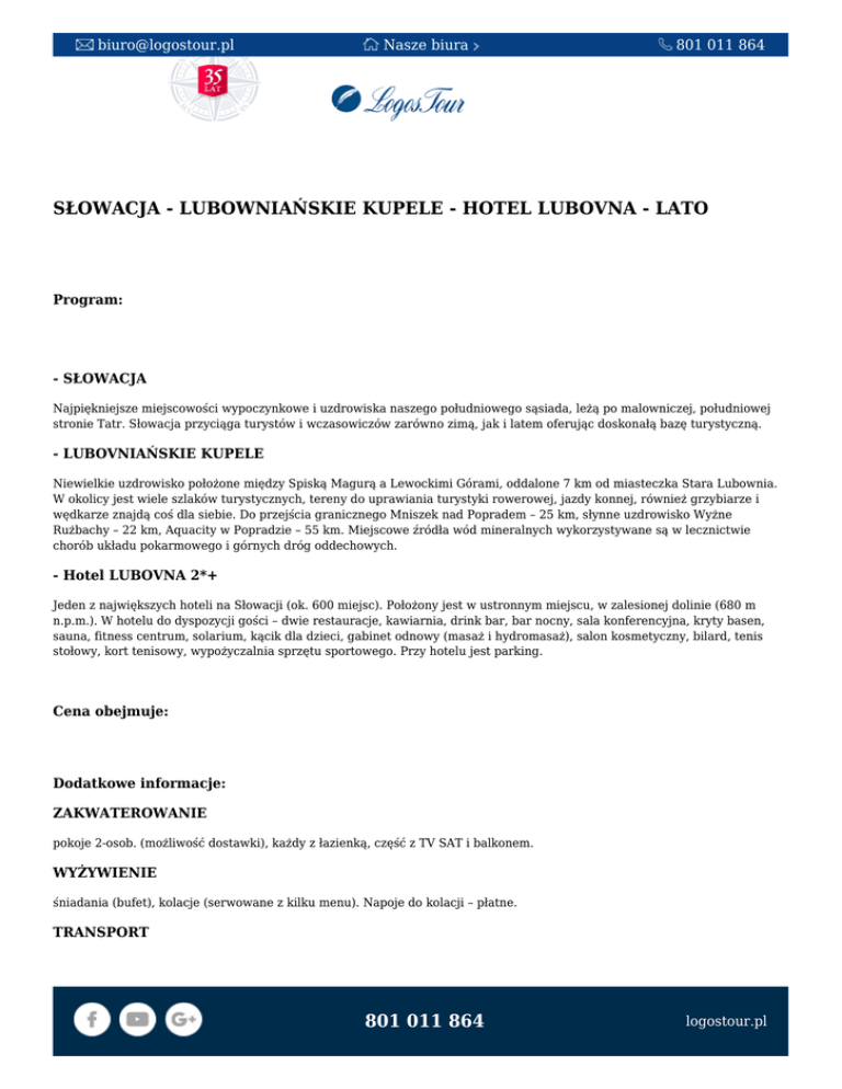 [email protected] Nasze biura 801 011 864 SŁOWACJA - LUBOWNIAŃSKIE KUPELE - HOTEL LUBOVNA - LATO Program: - SŁOWACJA Najpiękniejsze miejscowości wypoczynkowe i uzdrowiska naszego południowego sąsiada, leżą po malowniczej, południowej stronie Tatr. Słowacja przyciąga turystów i wczasowiczów zarówno zimą, jak i latem oferując doskonałą bazę turystyczną. - LUBOVNIAŃSKIE KUPELE Niewielkie uzdrowisko położone między Spiską Magurą a Lewockimi Górami, oddalone 7 km od miasteczka Stara Lubownia. W okolicy jest wiele szlaków turystycznych, tereny do uprawiania turystyki rowerowej, jazdy konnej, również grzybiarze i wędkarze znajdą coś dla siebie. Do przejścia granicznego Mniszek nad Popradem – 25 km, słynne uzdrowisko Wyżne Rużbachy – 22 km, Aquacity w Popradzie – 55 km. Miejscowe źródła wód mineralnych wykorzystywane są w lecznictwie chorób układu pokarmowego i górnych dróg oddechowych. - Hotel LUBOVNA 2*+ Jeden z największych hoteli na Słowacji (ok. 600 miejsc). Położony jest w ustronnym miejscu, w zalesionej dolinie (680 m n.p.m.). W hotelu do dyspozycji gości – dwie restauracje, kawiarnia, drink bar, bar nocny, sala konferencyjna, kryty basen, sauna, fitness centrum, solarium, kącik dla dzieci, gabinet odnowy (masaż i hydromasaż), salon kosmetyczny, bilard, tenis stołowy, kort tenisowy, wypożyczalnia sprzętu sportowego. Przy hotelu jest parking. Cena obejmuje: Dodatkowe informacje: ZAKWATEROWANIE pokoje 2-osob. (możliwość dostawki), każdy z łazienką, część z TV SAT i balkonem. WYŻYWIENIE śniadania (bufet), kolacje (serwowane z kilku menu). Napoje do kolacji – płatne. TRANSPORT 801 011 864 logostour.pl [email protected] Nasze biura 801 011 864 dojazd własny. TERMINY turnusy tygodniowe od soboty do soboty, w okresie od czerwca do września. CENA w PLN od osoby w pokoju 2-osob., za turnus tygodniowy. ZNIŻKI dziecko do 3 lat (bez świadczeń) – gratis, 1 dziecko do 8 lat (z 2 dorosłymi na dostawce) - gratis, dziecko 3-15 lat (na dostawce) – 50% zniżki ( 1 osoba dorosła + 2 dzieci), dziecko 3-15 lat (na łóżku) – 30% zniżki, dorosły (na dostawce) – 20% zniżki. DOPŁATY pokój 1-osob. i 1 osoba w pokoju 2-osob. – 70 PLN, opłata za zwierzęta – 7 EUR/noc, płatne w hotelu. WARUNKI PŁATNOŚCI 30% zaliczki przy podpisaniu umowy, dopłata do 100% na 21 dni przed wyjazdem. UWAGA Taksa klimatyczna płatna na miejscu 0,50 EUR/osoba/dzień. EXTRA wstęp do hotelowego basenu i fitness centrum, tenis stołowy, fitoterapia, dostęp do Wi-Fi, animacje. W okresie 27.06-01.09.16 – kącik dla dzieci, powitalny napój, 1 raz w turnusie wieczorek taneczny z grillowaniem, dzień z potrawami regionalnymi, wstęp do wellness centrum. UBEZPIECZENIE obowiązkowe Signal Iduna NW (7000 PLN), KL (15 000 EUR); dodatkowo płatne 25 PLN/osoba. Terminy: 801 011 864 logostour.pl