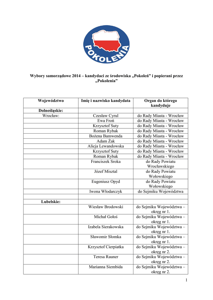Wybory samorządowe 2014 – kandydaci ze środowiska „Pokoleń” i popierani przez „Pokolenia” Województwo Dolnośląskie: Wrocław: Imię i nazwisko kandydata Organ do którego kandyduje Czesław Cyrul Ewa Froń Krzysztof Suty Roman Rybak Bożena Bamwenda Adam Żak Alicja Lewandowska Krzysztof Suty Roman Rybak Franciszek Sroka do Rady Miasta - Wrocław do Rady Miasta - Wrocław do Rady Miasta - Wrocław do Rady Miasta - Wrocław do Rady Miasta - Wrocław do Rady Miasta - Wrocław do Rady Miasta - Wrocław do Rady Miasta - Wrocław do Rady Miasta - Wrocław do Rady Powiatu Wrocławskiego do Rady Powiatu Wołowskiego do Rady Powiatu Wołowskiego do Sejmiku Województwa Józef Misztal Eugeniusz Opyd Iwona Włodarczyk Lubelskie: Wiesław Brodowski Michał Gołoś Izabela Sierakowska Sławomir Słomka Krzysztof Cierpiatka Teresa Rauner Marianna Siembida do Sejmiku Województwa – okręg nr 1. do Sejmiku Województwa – okręg nr 1. do Sejmiku Województwa – okręg nr 1. do Sejmiku Województwa – okręg nr 1. do Sejmiku Województwa – okręg nr 2. do Sejmiku Województwa – okręg nr 2. do Sejmiku Województwa – okręg nr 2. 1 Monika Siemion-Dudek Mirosław Złomaniec Bolesław Borysiuk Beata Korniluk Małgorzata Pieńko Michał Gołoś Zbigniew Mazurek Irena Kurzępa Mirosław Misztal do Sejmiku Województwa – okręg nr 2. do Sejmiku Województwa – okręg nr 2. do Sejmiku Województwa – okręg nr 3. do Sejmiku Województwa – okręg nr 3. do Sejmiku Województwa – okręg nr 3. do Sejmiku Województwa – okręg nr 4. do Sejmiku Województwa – okręg nr 4. do Sejmiku Województwa – okręg nr 5. do Sejmiku Województwa – okręg nr 5. Biała Podlaska Chełm Kraśnik Lublin Puławy Zamość Mieczysław Burdzicki Tadeusz Kochanowski Marek Światłowski Agata Fisz Maciej Baranowski Paweł Białas Zbigniew Grzesiak Mirosław Iwiński Artur Jędruszczak Kazimierz Mazurek Stanisław Mościcki Witold Radwański Marian Tywoniuk Wiesław Wróblewski Jarosław Czerw Jan Gąbka Stanisław Kieroński Józef Nowomiński Adam Osiński Marcin Przech Danuta Przybylska Iwona Świder Lucjan Tomaszewski Jerzy Nizioł Tadeusz Doszla Marek Klimek do Rady Miasta do Rady Miasta do Rady Miasta na Prezydenta Miasta Chełm do Rady Miasta do Rady Miasta do Rady Miasta do Rady Miasta do Rady Miasta do Rady Miasta do Rady Miasta do Rady Miasta do Rady Miasta do Rady Miasta na Burmistrza Kraśnika do Rady Miasta do Rady Miasta do Rady Miasta do Rady Miasta do Rady Miasta do Rady Miasta do Rady Miasta do Rady Miasta na Prezydenta Miasta Zamość do Rady Miasta do Rady Miasta Edward Fedko Kazimierz Pańtak do Sejmiku Województwa do Sejmiku Województwa Lubuskie: 2 Torzym Zielona Góra Urszula Wiśniewska Tomasz Frąckowiak Żagań Żary Ewa Adamczyk-Bryszewska Zbigniew Kornacki Franciszek Wołowicz do Sejmiku Województwa do Sejmiku Województwa do Sejmiku Województwa do Sejmiku Województwa do Sejmiku Województwa do Sejmiku Województwa na Burmistrza Babimost na wójta gminy Bogdaniec na Burmistrza Czerwieńska do Sejmiku Lubuskiego i na Prezydenta Gorzowa do Sejmiku Lubuskiego do Sejmik Lubuskiego do Rady Miasta do Rady Miasta do Rady Miasta do Rady Powiatu do Rady Powiatu na Burmistrza do Rady Gminy na wójta gmin y Kłodawa do Rady Powiatu Krosno Odrzańskie do Rady Miasta Łagów do Rady Powiatu Nowa Sól na Burmistrza Rzepina Do Rady Miasta Rzepin na wójta gminy Skąpe do Rady Powiatu Słubice do Rady Miasta Sulechów na Burmistrza Sulechowa na Burmistrza Sulęcina do Rady Miasta Szprotawa do Rady Powiatu Świebodzin do Rady Miasta Krosno Odrzańskie do Rady Powiatu Krosno Odrzańskie do Rady Miasta do Rady Powiatu Zielona Góra do Rady Miasta Żagań do Rady Miasta Żary na Burmistrza Żar Maria Dorota Woźniak Grzegorz Andrzej Adamski Wiesława Pankiewicz do Rady Gminy do Rady Gminy do Rady Gminy Babimost Bogdaniec Czerwieńsk Gorzów Wlkp. Gubin Kłodawa Krosno Łagów Nowa Sól Rzepin Skąpe Słubice Sulechów Sulęcin Szprotawa Świebodzin Zbigniew Cygański Alfred Owoc Tadeusz Tomasik Tomasz Wontor Beata Górska-Rabaczewska Izabela Kumor-Pilarczyk Bernard Radny Krystyna Pławska Piotr Iwanus Tadeusz Jędrzejczak Emilian Popławski Jan Kotzbach Jan Kaczanowski Jan Mokrzycki Jakub Derech-Krzycki Hieronim Aleksandrowicz Aleksandra Jasicka Zenon Turowski Marian Adamczyk Krzysztof Hurko Andrzej Zaborowicz Romuald Kuryta Henryk Radecki Stanisław Klejnorek Eugeniusz Piotrowski Zbigniew Woch Jerzy Glinka Zbigniew Kukwa Roman Rakowski Dariusz Ejchart Jan Kaniuk Bolesław Lewandowski Krzysztof Świłło Andrzej Cudak Łódzkie: Bedlno 3 Krośniewice: Kutno: Dorota Piotrowska Ireneusz Lewarski Roman Gajewski Dariusz Kafarski Wioletta Tomczak Andrzej Dąbrowicz Patrycja Łazińska Krzysztof Wojtera Agnieszka Tylak Jarosław Łuczak Leszek Uzdrowski Jerzy Badalewski Wojciech Kacprzak Jan Błaszczyk Aleksander Pietrzak Włodzimierz Ożarek Marcin Tomes Arkadiusz Marcinkowski Anna Maria-Wolska Zdzisław Pietrzykowski Bożena Józefa Wirska Daniel Artur Łukawski Aleksandra Helena Rucińska Mirosław Kowalczyk Krzysztof Wacław Dębski Aleksander Wiliński Beata Krukowska Magdalena Górska Maciej Wojciech Foczpaniak Włodzimierz Grzegorz Andrzejewski Stanisław Kazimierz Tyrański Janusz Krzysztof Śmietanka Witold Piotr Kaliński Marek Galus Aleksandra Koszada Mariusz Kacprowicz Marika Kierzkowska Jacek Sochacki do Rady Gminy do Rady Gminy do Rady Gminy do Rady Gminy do Rady Gminy na Burmistrza Krośniewic do Rady Miasta do Rady Miasta do Rady Miasta do Rady Miasta do Rady Miasta do Rady Miasta do Rady Miasta do Rady Miasta do Rady Miasta do Rady Miasta do Rady Miasta do Rady Miasta do Rady Miasta – okręg nr 1. do Rady Miasta – okręg nr 2. do Rady Miasta – okręg nr 3. do Rady Miasta – okręg nr 4. do Rady Miasta – okręg nr 5. do Rady Miasta – okręg nr 6. do Rady Miasta – okręg nr 7. do Rady Miasta – okręg nr 8. do Rady Miasta – okręg nr 9. do Rady Miasta – okrę