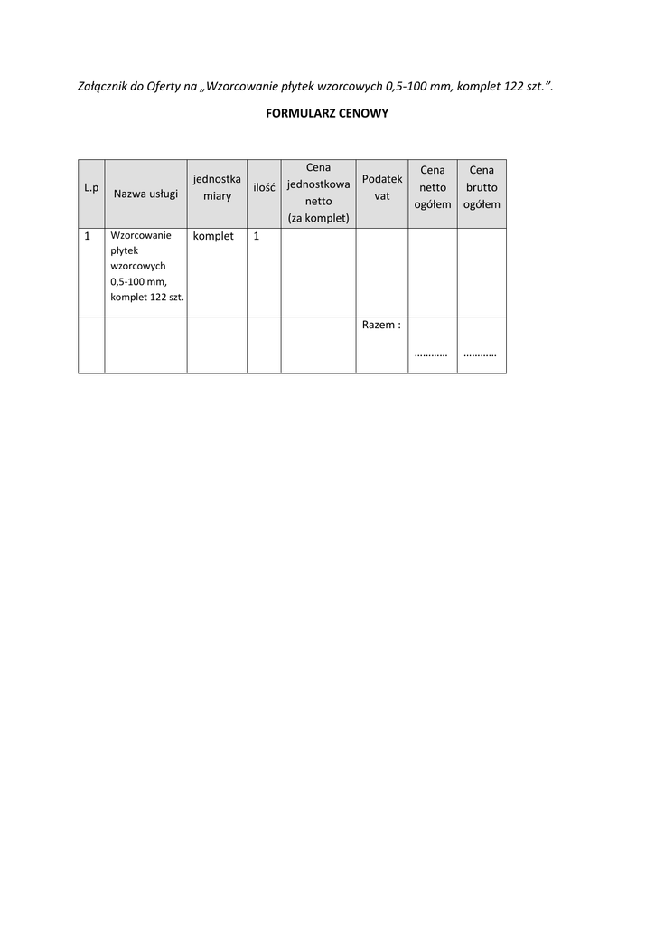 Załącznik do Oferty na „Wzorcowanie płytek wzorcowych 0,5-100 mm, komplet 122 szt.”. FORMULARZ CENOWY L.p 1 Nazwa usługi Wzorcowanie płytek wzorcowych 0,5-100 mm, komplet 122 szt. Cena Cena Cena jednostka Podatek jednostkowa netto brutto ilość miary vat netto ogółem ogółem (za komplet) komplet 1 Razem : ………… …………