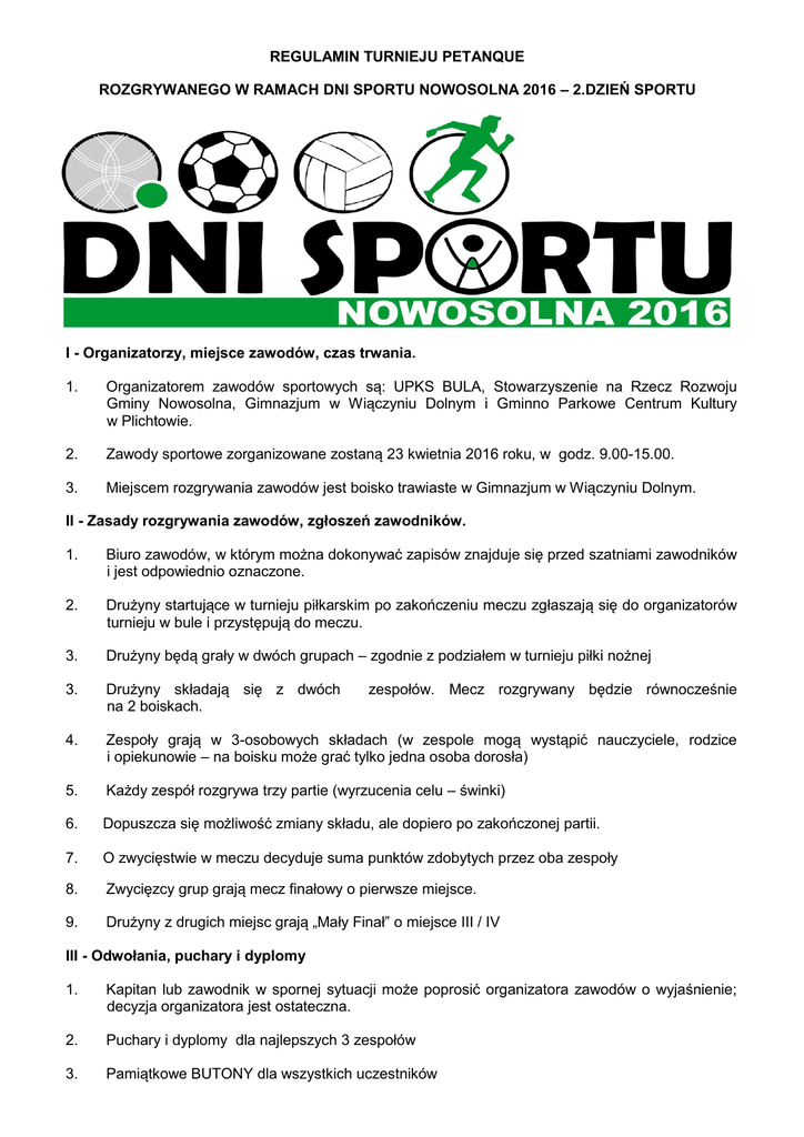 REGULAMIN TURNIEJU PETANQUE ROZGRYWANEGO W RAMACH DNI SPORTU NOWOSOLNA 2016 – 2.DZIEŃ SPORTU I - Organizatorzy, miejsce zawodów, czas trwania. 1. Organizatorem zawodów sportowych są: UPKS BULA, Stowarzyszenie na Rzecz Rozwoju Gminy Nowosolna, Gimnazjum w Wiączyniu Dolnym i Gminno Parkowe Centrum Kultury w Plichtowie. 2. Zawody sportowe zorganizowane zostaną 23 kwietnia 2016 roku, w godz. 9.00-15.00. 3. Miejscem rozgrywania zawodów jest boisko trawiaste w Gimnazjum w Wiączyniu Dolnym. II - Zasady rozgrywania zawodów, zgłoszeń zawodników. 1. Biuro zawodów, w którym można dokonywać zapisów znajduje się przed szatniami zawodników i jest odpowiednio oznaczone. 2. Drużyny startujące w turnieju piłkarskim po zakończeniu meczu zgłaszają się do organizatorów turnieju w bule i przystępują do meczu. 3. Drużyny będą grały w dwóch grupach – zgodnie z podziałem w turnieju piłki nożnej 3. Drużyny składają się z dwóch na 2 boiskach. 4. Zespoły grają w 3-osobowych składach (w zespole mogą wystąpić nauczyciele, rodzice i opiekunowie – na boisku może grać tylko jedna osoba dorosła) 5. Każdy zespół rozgrywa trzy partie (wyrzucenia celu – świnki) 6. Dopuszcza się możliwość zmiany składu, ale dopiero po zakończonej partii. 7. O zwycięstwie w meczu decyduje suma punktów zdobytych przez oba zespoły 8. Zwycięzcy grup grają mecz finałowy o pierwsze miejsce. 9. Drużyny z drugich miejsc grają „Mały Finał” o miejsce III / IV zespołów. Mecz rozgrywany będzie równocześnie III - Odwołania, puchary i dyplomy 1. Kapitan lub zawodnik w spornej sytuacji może poprosić organizatora zawodów o wyjaśnienie; decyzja organizatora jest ostateczna. 2. Puchary i dyplomy dla najlepszych 3 zespołów 3. Pamiątkowe BUTONY dla wszystkich uczestników HARMONOGRAM GIER GRUPOWYCH godzina 9:20 9:40 10:00 10:20 10:40 11:00 11:20 11:40 12:00 12:20 12:40 13:00 turniej w bule A1 A3 B1 B3 A1 A2 B1 B2 A1 A2 B1 B2 FINAŁ A mecz o pierwsze/drugie miejsce A2 A4 B2 B4 A3 A4 B3 B4 A4 A3 B4 B3 MAŁY FINAŁ mecz o trzecie/czwarte miejsce