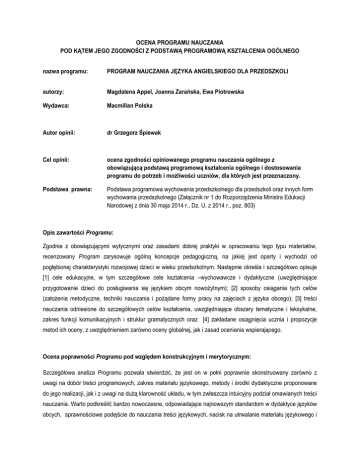 OCENA PROGRAMU NAUCZANIA POD KĄTEM JEGO ZGODNOŚCI Z PODSTAWĄ PROGRAMOWĄ KSZTAŁCENIA OGÓLNEGO nazwa programu: PROGRAM NAUCZANIA JĘZYKA ANGIELSKIEGO DLA PRZEDSZKOLI autorzy: Magdalena Appel, Joanna Zarańska, Ewa Piotrowska Wydawca: Macmillan Polska Autor opinii: dr Grzegorz Śpiewak Cel opinii: ocena zgodności opiniowanego programu nauczania ogólnego z obowiązującą podstawą programową kształcenia ogólnego i dostosowania programu do potrzeb i możliwości uczniów, dla których jest przeznaczony. Podstawa prawna: Podstawa programowa wychowania przedszkolnego dla przedszkoli oraz innych form wychowania przedszkolnego (Załącznik nr 1 do Rozporządzenia Ministra Edukacji Narodowej z dnia 30 maja 2014 r., Dz. U. z 2014 r., poz. 803) Opis zawartości Programu: Zgodnie z obowiązującymi wytycznymi oraz zasadami dobrej praktyki w opracowaniu tego typu materiałów, recenzowany Program zarysowuje ogólną koncepcje pedagogiczną, na jakiej jest oparty i wychodzi od pogłębionej charakterystyki rozwojowej dzieci w wieku przedszkolnym. Następnie określa i szczegółowo opisuje [1] cele edukacyjne, w tym szczegółowe cele kształcenia –wychowawcze i dydaktyczne (uwzględniające przygotowanie dzieci do posługiwania się językiem obcym nowożytnym); [2] sposoby osiągania tych celów (założenia metodyczne, techniki nauczania i pożądane formy pracy na zajęciach z języka obcego); [3] treści nauczania odniesione do szczegółowych celów kształcenia, uwzględniające obszary tematyczne i leksykalne, zakres funkcji komunikacyjnych i struktur gramatycznych oraz [4] zakładane osiągnięcia ucznia i propozycje metod ich oceny, z uwzględnieniem zarówno oceny globalnej, jak i zasad oceniania wspierającego. Ocena poprawności Programu pod względem konstrukcyjnym i merytorycznym: Szczegółowa analiza Programu pozwala stwierdzić, że jest on w pełni poprawnie skonstruowany zarówno z uwagi na dobór treści programowych, zakres materiału językowego, metody i środki dydaktyczne proponowane do jego realizacji, jak i z uwagi na dużą klarowność układu, w tym zwłaszcza intuicyjny podział omawianych treści nauczania. Warto podkreślić bardzo nowoczesne, odpowiadające najnowszym standardom w dydaktyce języków obcych, sprawnościowe podejście do nauczania treści językowych, nacisk na utrwalanie materiału językowego i zwłaszcza na techniki pracy z błędem językowym. Dzięki tym wszystkim cechom Programu nauczyciel zyskuje potencjalnie bardzo cenny punkt odniesienia w projektowaniu aktywności klasowych i ocenie ich efektywności. dr Grzegorz Śpiewak naczelny konsultant ds. metodyki nauczania, Wydawnictwo Macmillan Education