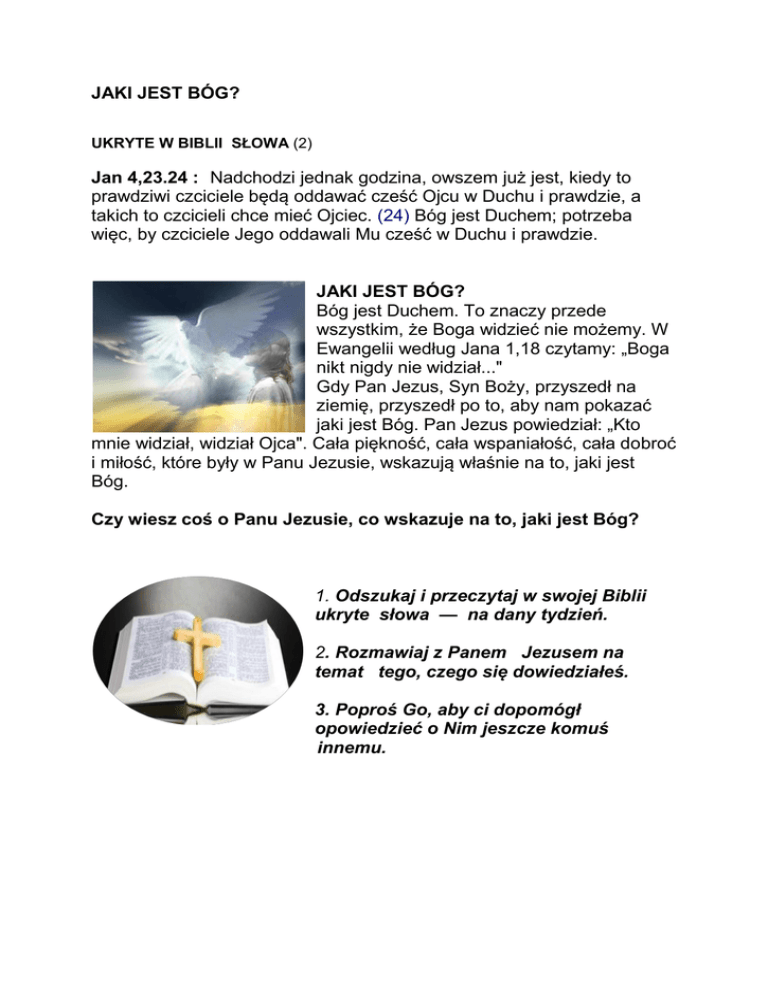 JAKI JEST BÓG? UKRYTE W BIBLII SŁOWA (2) Jan 4,23.24 : Nadchodzi jednak godzina, owszem już jest, kiedy to prawdziwi czciciele będą oddawać cześć Ojcu w Duchu i prawdzie, a takich to czcicieli chce mieć Ojciec. (24) Bóg jest Duchem; potrzeba więc, by czciciele Jego oddawali Mu cześć w Duchu i prawdzie. JAKI JEST BÓG? Bóg jest Duchem. To znaczy przede wszystkim, że Boga widzieć nie możemy. W Ewangelii według Jana 1,18 czytamy: „Boga nikt nigdy nie widział..." Gdy Pan Jezus, Syn Boży, przyszedł na ziemię, przyszedł po to, aby nam pokazać jaki jest Bóg. Pan Jezus powiedział: „Kto mnie widział, widział Ojca". Cała piękność, cała wspaniałość, cała dobroć i miłość, które były w Panu Jezusie, wskazują właśnie na to, jaki jest Bóg. Czy wiesz coś o Panu Jezusie, co wskazuje na to, jaki jest Bóg? 1. Odszukaj i przeczytaj w swojej Biblii ukryte słowa — na dany tydzień. 2. Rozmawiaj z Panem Jezusem na temat tego, czego się dowiedziałeś. 3. Poproś Go, aby ci dopomógł opowiedzieć o Nim jeszcze komuś innemu.