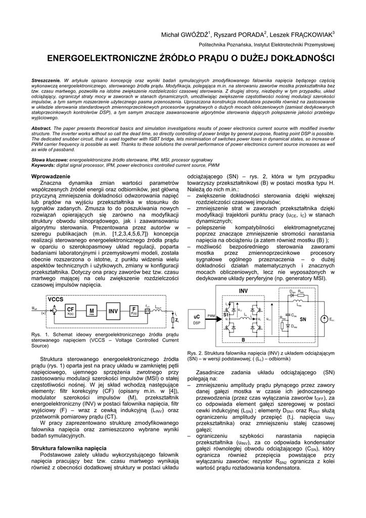 Michał GWÓŹDŹ1, Ryszard PORADA2, Leszek FRĄCKOWIAK3 Politechnika Poznańska, Instytut Elektrotechniki Przemysłowej ENERGOELEKTRONICZNE ŹRÓDŁO PRĄDU O DUŻEJ DOKŁADNOŚCI Streszczenie. W artykule opisano koncepcję oraz wyniki badań symulacyjnych zmodyfikowanego falownika napięcia będącego częścią wykonawczą energoelektronicznego, sterowanego źródła prądu. Modyfikacja, polegająca m.in. na sterowaniu zaworów mostka przekształtnika bez tzw. czasu martwego, pozwoliła na istotne zwiększenie rozdzielczości czasowej sterowania. Z drugiej strony, niezbędny w tym przypadku, układ odciążający, ograniczył straty mocy w zaworach w stanach dynamicznych, umożliwiając zwiększenie częstotliwości nośnej modulacji szerokości impulsów, a tym samym rozszerzenie użytecznego pasma przenoszenia. Uproszczona konstrukcja modulatora pozwoliła również na zastosowanie w układzie sterowania standardowych zmiennoprzecinkowych procesorów sygnałowych o dużych mocach obliczeniowych (zamiast dedykowanych stałoprzecinkowych kontrolerów DSP), a tym samym znaczące zaawansowanie algorytmów sterowania dających polepszenie jakości przebiegu wyjściowego. Abstract. The paper presents theoretical basics and simulation investigations results of power electronics current source with modified inverter structure. The inverter works without so call the dead time, so directly controlling of power bridge by general purpose, floating point DSP is possible. The dedicated snubber circuit, that is used together with IGBT bridge, lets minimisation of switches power loses in dynamical states, so increase of PWM carrier frequency is possible as well. Thanks to these solutions the overall performance of power electronics current source increases as well as wide of passband. Słowa kluczowe: energoelektroniczne źródło sterowane, IPM, MSI, procesor sygnałowy Keywords: digital signal processor, IPM, power electronics controlled current source, PWM Wprowadzenie Znaczna dynamika zmian wartości parametrów współczesnych źródeł energii oraz odbiorników, jest główną przyczyną zmniejszenia dokładności odwzorowania napięć lub prądów na wyjściu przekształtnika w stosunku do sygnałów zadanych. Zmusza to do poszukiwania nowych rozwiązań opierających się zarówno na modyfikacji struktury obwodu silnoprądowego, jak i zaawansowaniu algorytmu sterowania. Prezentowana przez autorów w szeregu publikacjach (m.in. [1,2,3,4,5,6,7]) koncepcja realizacji sterowanego energoelektronicznego źródła prądu w oparciu o szerokopasmowy układ regulacji, poparta badaniami laboratoryjnymi i przemysłowymi modeli, została obecnie rozszerzona o istotne, z punktu widzenia wielu aspektów technicznych i użytkowych, zmiany w konfiguracji przekształtnika. Dotyczy ona pracy zaworów bez tzw. czasu martwego mającej na celu zwiększenie rozdzielczości czasowej impulsów napięcia. odciążającego (SN) – rys. 2, która w tym przypadku towarzyszy przekształtnikowi (B) w postaci mostka typu H. Należą do nich m.in.: – zwiększenie dokładności sterowania dzięki większej rozdzielczości czasowej impulsów; – zmniejszenie strat w zaworach przekształtnika dzięki modyfikacji trajektorii punktu pracy (uCE, iC) w stanach dynamicznych; – polepszenie kompatybilności elektromagnetycznej poprzez znaczące zmniejszenie stromości narastania napięcia na obciążeniu (a zatem również mostku (B) ); – możliwość bezpośredniego sterowania zaworami mostka przez zmiennoprzecinkowe procesory sygnałowe ogólnego przeznaczenia – o dużej dokładności działań matematycznych i znacznych mocach obliczeniowych, lecz nie wyposażonych w dedykowane układy peryferyjne (np. generatory MSI). Rys. 1. Schemat ideowy energoelektronicznego źródła prądu sterowanego napięciem (VCCS – Voltage Controlled Current Source) Struktura sterowanego energoelektronicznego źródła prądu (rys. 1) oparta jest na pracy układu w zamkniętej pętli napięciowego, ujemnego sprzężenia zwrotnego przy zastosowaniu modulacji szerokości impulsów (MSI) o stałej częstotliwości nośnej. W jej skład wchodzą następujące elementy: filtr korekcyjny (CF) (opisany m.in. w [4]), modulator szerokości impulsów (M), przekształtnik energoelektroniczny (INV) w postaci falownika napięcia, filtr wyjściowy (F) – wraz z cewką indukcyjną (LINV) oraz przetwornik pomiarowy prądu (CT). W pracy zaprezentowano strukturę zmodyfikowanego falownika napięcia oraz zamieszczono wybrane wyniki badań symulacyjnych. Struktura falownika napięcia Podstawowe zalety układu wykorzystującego falownik napięcia pracujący bez tzw. czasu martwego wynikają również z obecności dodatkowej struktury w postaci układu Rys. 2. Struktura falownika napięcia (INV) z układem odciążającym (SN) – w wersji podstawowej; ( (LL) – odbiornik) Zasadnicze zadania układu odciążającego (SN) polegają na: – zmniejszeniu amplitudy prądu płynącego przez zawory danej gałęzi mostka w czasie ich jednoczesnego przewodzenia (przez czas wyłączania zaworów tOFF), za co odpowiada element gałęzi szeregowej w postaci cewki indukcyjnej (LSN) ; elementy DSN1 oraz RSN1 służą ograniczeniu amplitudy przepięć (t.j. napięcia uINV przekształtnika) oraz zmniejszeniu stałej czasowej gałęzi; – ograniczeniu szybkości narastania napięcia przekształtnika (uINV), za co odpowiada kondensator gałęzi równoległej obwodu odciążającego (CSN), który ogranicza również przepięcia powstające przy wyłączaniu zaworów; rezystor RSN2 ogranicza z kolei wartość prądu rozładowania kondensatora. Należy zwrócić uwagę na fakt, że rola typowych układów odciążających, towarzyszących np. zaworom w postaci tranzystorów bipolarnych (zapewniających pracę elementu w obszarze SOA – Safe Operating Area) uległa, wraz z pojawieniem się elementów IGBT, znacznemu ograniczeniu. Wynika to głównie z ograniczenia występowania