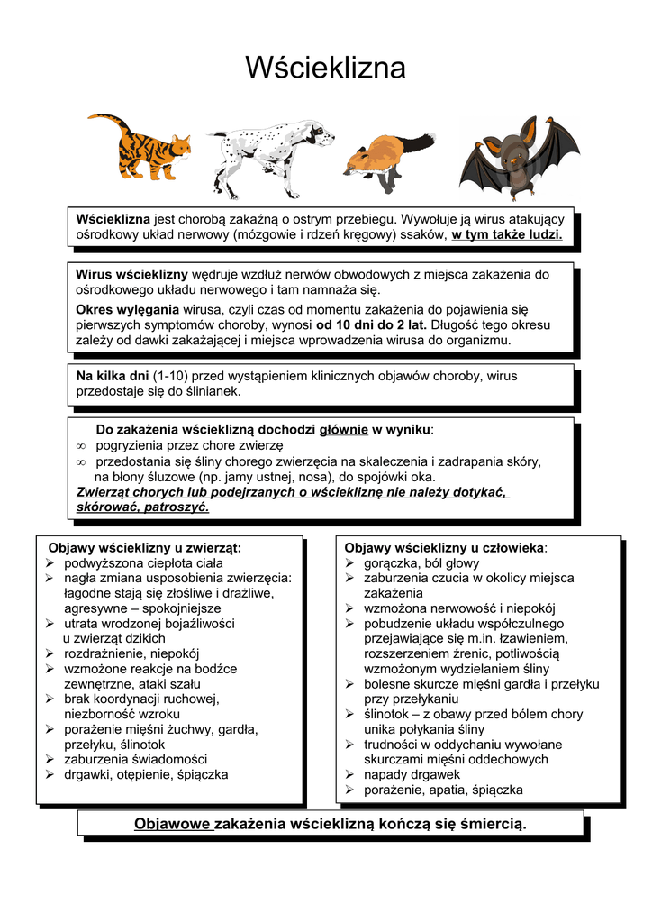Wścieklizna Wścieklizna jest chorobą zakaźną o ostrym przebiegu. Wywołuje ją wirus atakujący ośrodkowy układ nerwowy (mózgowie i rdzeń kręgowy) ssaków, w tym także ludzi. Wirus wścieklizny wędruje wzdłuż nerwów obwodowych z miejsca zakażenia do ośrodkowego układu nerwowego i tam namnaża się. Okres wylęgania wirusa, czyli czas od momentu zakażenia do pojawienia się pierwszych symptomów choroby, wynosi od 10 dni do 2 lat. Długość tego okresu . zależy od dawki zakażającej i miejsca wprowadzenia wirusa do organizmu. Na kilka dni (1-10) przed wystąpieniem klinicznych objawów choroby, wirus przedostaje się do ślinianek. Do zakażenia wścieklizną dochodzi głównie w wyniku: pogryzienia przez chore zwierzę przedostania się śliny chorego zwierzęcia na skaleczenia i zadrapania skóry, na błony śluzowe (np. jamy ustnej, nosa), do spojówki oka. Zwierząt chorych lub podejrzanych o wściekliznę nie należy dotykać, skórować, patroszyć. • • Objawy wścieklizny u zwierząt: podwyższona ciepłota ciała nagła zmiana usposobienia zwierzęcia: łagodne stają się złośliwe i drażliwe, agresywne – spokojniejsze utrata wrodzonej bojaźliwości u zwierząt dzikich rozdrażnienie, niepokój wzmożone reakcje na bodźce zewnętrzne, ataki szału brak koordynacji ruchowej, niezborność wzroku porażenie mięśni żuchwy, gardła, przełyku, ślinotok zaburzenia świadomości drgawki, otępienie, śpiączka Objawy wścieklizny u człowieka: gorączka, ból głowy zaburzenia czucia w okolicy miejsca zakażenia wzmożona nerwowość i niepokój pobudzenie układu współczulnego przejawiające się m.in. łzawieniem, rozszerzeniem źrenic, potliwością wzmożonym wydzielaniem śliny bolesne skurcze mięśni gardła i przełyku przy przełykaniu ślinotok – z obawy przed bólem chory unika połykania śliny trudności w oddychaniu wywołane skurczami mięśni oddechowych napady drgawek porażenie, apatia, śpiączka Objawowe zakażenia wścieklizną kończą się śmiercią. NIETOPERZE Objawy wścieklizny u nietoperzy: zmiana usposobienia zwierzęcia: aktywność dzienna porażenia: utrata zdolności lotu, może chodzić często jest brudne, wychudzone, ma posklejane futro, zdarza się, że ma w pyszczku ziemię nadpobudliwość na dotyk, hałas: po dotknięciu pałąkowato wygina grzbiet, mocno skrzeczy tendencja do przewracania się na grzbiet apatia, bezruch; zamknięte lub silnie przymknięte oczy początkowo próbuje jeść, pić, później nic nie połyka bywa, że rzuca się na pokarm bez gryzienia i połykania w końcowym etapie słabo reaguje na jakiekolwiek bodźce Wirus stwierdzany był najczęściej (ok. 90%) u mroczka późnego Wścieklizną od nietoperza można się zarazić w wyniku pogryzienia, kontaktu z jego śliną lub moczem i przedostania się wirusa przez uszkodzoną skórę lub błony śluzowe. Rzadko notowana droga aerogenna zakażenia aerozolem ich odchodów jest możliwa w środowisku gromadzących się nietoperzy, w ich noclegowniach (jaskinie). Wirus wścieklizny wykazuje stosunkowo dużą oporność na działanie czynników fizycznych i chemicznych oraz gnicie. W gnijących i podlegających autolizie zwłokach zwierząt zachowuje zakaźność przez kilka tygodni, w powierzchniowych warstwach ziemi przez 2-3 miesiące. Płynna ślina z wirusem może zakażać nawet po 24 godzinach, wysuszona po 14 godzinach. Wirus ginie w kwaśnym odczynie środowiska w pH 3 po 30 minutach, w pH 4 po 24 godzinach. Roztwory 2-5% zwykle stosowanych środków odkażających niszczą go w ciągu kilku minut. Wirus bardzo szybko ginie poza zarażonym organizmem: jest szczególnie wrażliwy na formalinę, ług sodowy, alkohol etylowy, roztwory mydła i wodę utlenioną, w przeciągu kilku godzin (po 2h) zabija go promieniowanie słoneczne. Jeśli żywy nietoperz wtargnie do pomieszczenia: należy umożliwić mu opuszczenie pomieszczenia najbliższej nocy, np. w następujący sposób: zamknąć drzwi do pozostałych pomieszczeń otworzyć szeroko okno lub drzwi zgasić światło i usunąć się z drogi nietoperza do otwartego okna lub drzwi upewnić się, że nietoperz opuścił pomieszczenie Nie należy się bać, nietoperz latający w ciemnościach nie atakuje człowieka Kontakt z I.W. Powiatowym Inspektoratem w Wałczu: Tel. (067) 2582316; 2581138 – 41 NIE POWINNO SIĘ CHWYTAĆ GOŁĄ RĘKĄ JAKICHKOLWIEK DZIKICH ZWIERZĄT, MOGĄ BYĆ ONE WEKTORAMI CHORÓB ZAKAŹNYCH – ZWŁASZCZA, JEŚLI WYGLĄDAJĄ NA CHORE! PAMIĘTAJ: