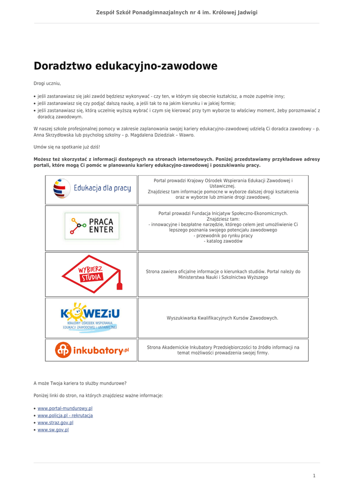 Zespół Szkół Ponadgimnazjalnych nr 4 im. Królowej Jadwigi Doradztwo edukacyjno-zawodowe Drogi uczniu, ● jeśli zastanawiasz się jaki zawód będziesz wykonywać - czy ten, w którym się obecnie kształcisz, a może zupełnie inny; ● jeśli zastanawiasz się czy podjąć dalszą naukę, a jeśli tak to na jakim kierunku i w jakiej formie; ● jeśli zastanawiasz się, którą uczelnię wyższą wybrać i czym się kierować przy tym wyborze to właściwy moment, żeby porozmawiać z doradcą zawodowym. W naszej szkole profesjonalnej pomocy w zakresie zaplanowania swojej kariery edukacyjno–zawodowej udzielą Ci doradca zawodowy – p. Anna Skrzydłowska lub psycholog szkolny – p. Magdalena Dziedziak – Wawro. Umów się na spotkanie już dziś! Możesz też skorzystać z informacji dostępnych na stronach internetowych. Poniżej przedstawiamy przykładowe adresy portali, które mogą Ci pomóc w planowaniu kariery edukacyjno-zawodowej i poszukiwaniu pracy. Portal prowadzi Krajowy Ośrodek Wspierania Edukacji Zawodowej i Ustawicznej. Znajdziesz tam informacje pomocne w wyborze dalszej drogi kształcenia oraz w wyborze lub zmianie drogi zawodowej. Portal prowadzi Fundacja Inicjatyw Społeczno-Ekonomicznych. Znajdziesz tam: - innowacyjne i bezpłatne narzędzie, którego celem jest umożliwienie Ci lepszego poznania swojego potencjału zawodowego - przewodnik po rynku pracy - katalog zawodów Strona zawiera oficjalne informacje o kierunkach studiów. Portal należy do Ministerstwa Nauki i Szkolnictwa Wyższego Wyszukiwarka Kwalifikacyjnych Kursów Zawodowych. Strona Akademickie Inkubatory Przedsiębiorczości to źródło informacji na temat możliwości prowadzenia swojej firmy. A może Twoja kariera to służby mundurowe? Poniżej linki do stron, na których znajdziesz ważne informacje: ● www.portal-mundurowy.pl ● www.policja.pl - rekrutacja ● www.straz.gov.pl ● www.sw.gov.pl 1