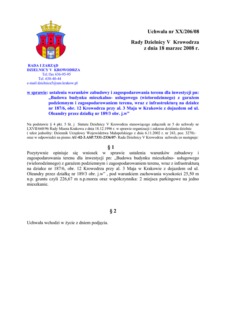Uchwała nr XX/206/08 Rady Dzielnicy V Krowodrza z dnia 18 marzec 2008 r. RADA I ZARZĄD DZIELNICY V KROWODRZA Tel./fax 636-95-95 Tel. 638-40-44 e-mail [email protected] w sprawie: ustalenia warunków zabudowy i zagospodarowania terenu dla inwestycji pn: „Budowa budynku mieszkalno- usługowego (wielorodzinnego) z garażem podziemnym i zagospodarowaniem terenu, wraz z infrastrukturą na działce nr 187/6, obr. 12 Krowodrza przy al. 3 Maja w Krakowie z dojazdem od ul. Oleandry przez działkę nr 189/3 obr. j.w” Na podstawie § 4 pkt. 5 lit. j Statutu Dzielnicy V Krowodrza stanowiącego załącznik nr 5 do uchwały nr LXVII/660/96 Rady Miasta Krakowa z dnia 18.12.1996 r. w sprawie organizacji i zakresu działania dzielnic ( tekst jednolity: Dziennik Urzędowy Województwa Małopolskiego z dnia 6.11.2002 r. nr 243, poz. 3278)– oraz w odpowiedzi na pismo AU-02-3.ASP.7331-2336/07- Rada Dzielnicy V Krowodrza uchwala co następuje: §1 Pozytywnie opiniuje się wniosek w sprawie ustalenia warunków zabudowy i zagospodarowania terenu dla inwestycji pn: „Budowa budynku mieszkalno- usługowego (wielorodzinnego) z garażem podziemnym i zagospodarowaniem terenu, wraz z infrastrukturą na działce nr 187/6, obr. 12 Krowodrza przy al. 3 Maja w Krakowie z dojazdem od ul. Oleandry przez działkę nr 189/3 obr. j.w” , pod warunkiem zachowania wysokości 25,50 m n.p. gruntu czyli 226,67 m n.p.morza oraz współczynnika: 2 miejsca parkingowe na jedno mieszkanie. §2 Uchwała wchodzi w życie z dniem podjęcia.