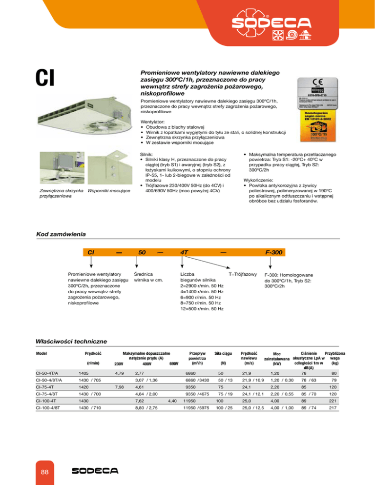 CI Promieniowe wentylatory nawiewne dalekiego zasięgu 300ºC/1h, przeznaczone do pracy wewnątrz strefy zagrożenia pożarowego, niskoprofilowe 0370-CPD-0715 Promieniowe wentylatory nawiewne dalekiego zasięgu 300ºC/1h, przeznaczone do pracy wewnątrz strefy zagrożenia pożarowego, niskoprofilowe Wentylator: • Obudowa z blachy stalowej • Wirnik z łopatkami wygiętymi do tyłu ze stali, o solidnej konstrukcji • Zewnętrzna skrzynka przyłączeniowa • W zestawie wsporniki mocujące Zewnętrzna skrzynka Wsporniki mocujące przyłączeniowa Silnik: • Silniki klasy H, przeznaczone do pracy ciągłej (tryb S1) i awaryjnej (tryb S2), z łożyskami kulkowymi, o stopniu ochrony IP-55, 1- lub 2-biegowe w zależności od modelu • Trójfazowe 230/400V 50Hz (do 4CV) i 400/690V 50Hz (moc powyżej 4CV) • Maksymalna temperatura przetłaczanego powietrza: Tryb S1: -20ºC+ 40ºC w przypadku pracy ciągłej, Tryb S2: 300ºC/2h Wykończenie: • Powłoka antykorozyjna z żywicy poliestrowej, polimeryzowanej w 190ºC po alkalicznym odtłuszczaniu i wstępnej obróbce bez udziału fosforanów. Kod zamówienia CI 50 Promieniowe wentylatory nawiewne dalekiego zasięgu 300ºC/2h, przeznaczone do pracy wewnątrz strefy zagrożenia pożarowego, niskoprofilowe 4T Średnica wirnika w cm. Liczba biegunów silnika 2=2900 r/min. 50 Hz 4=1400 r/min. 50 Hz 6=900 r/min. 50 Hz 8=750 r/min. 50 Hz 12=500 r/min. 50 Hz F-300 T=Trójfazowy F-300: Homologowane do 300ºC/1h, Tryb S2: 300ºC/2h Właściwości techniczne Model Prędkość (r/min) Maksymalne dopuszczalne natężenie prądu (A) 690V 230V 400V Przepływ powietrza (m3/h) Siła ciągu (N) Prędkość nawiewu (m/s) 21,9 Przybliżona Ciśnienie Moc zainstalowana akustyczne LpA w waga (kg) odległości 1m w (kW) dB(A) 1,20 78 80 CI-50-4T/A 1405 4,79 2,77 6860 50 CI-50-4/8T/A 1430 /705 3,07 /1,36 6860 /3430 50 /13 21,9 /10,9 1,20 / 0,30 78 /63 CI-75-4T 1420 4,61 9350 75 24,1 2,20 85 120 120 7,98 CI-75-4/8T 1430 /700 4,84 /2,00 CI-100-4T 1430 7,62 CI-100-4/8T 1430 /710 8,80 /2,75 88 4,40 9350 /4675 75 /19 79 24,1 /12,1 2,20 / 0,55 85 /70 11950 100 25,0 4,00 89 221 11950 /5975 100 /25 25,0 /12,5 4,00 / 1,00 89 /74 217 CI Wymiary w mm Model A B C V2 V1 X1 X2 Kxn 1275,5 956 282,5 575 727 504 504 12x26 CI-75 1377 1065,5 351 620,5 783 557,5 559,5 12x26 CI-100 1800 389 975 846 627,5 581 12x26 CI-50/A 1161 Akcesoria Patrz rozdział dotyczący akcesoriów INT IAT CABLE BOX C2V AET AR CENTRAL CO RFT P-400 R RI 89
