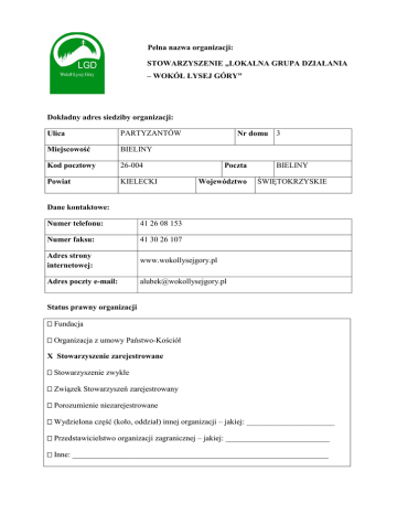 Pełna nazwa organizacji: STOWARZYSZENIE „LOKALNA GRUPA DZIAŁANIA – WOKÓŁ ŁYSEJ GÓRY” Dokładny adres siedziby organizacji: Ulica PARTYZANTÓW Miejscowość BIELINY Kod pocztowy 26-004 Powiat KIELECKI Nr domu Poczta Województwo 3 BIELINY ŚWIĘTOKRZYSKIE Dane kontaktowe: Numer telefonu: 41 26 08 153 Numer faksu: 41 30 26 107 Adres strony internetowej: www.wokollysejgory.pl Adres poczty e-mail: [email protected] Status prawny organizacji Fundacja Organizacja z umowy Państwo-Kościół X Stowarzyszenie zarejestrowane Stowarzyszenie zwykłe Związek Stowarzyszeń zarejestrowany Porozumienie niezarejestrowane Wydzielona część (koło, oddział) innej organizacji – jakiej: ______________________ Przedstawicielstwo organizacji zagranicznej – jakiej: __________________________ Inne: ________________________________________________________________ Dane identyfikacyjne: Rok rejestracji: 2006 Nr REGON: 260081103 Nr KRS 0000252759 Nr NIP 657-269-35-04 Numer konta organizacji*: BRE Bank S.A. Oddział Korporacyjny Kielce 15 1140 2020 0000 5130 5300 1001 – podstawowy Imiona i nazwiska osób, wchodzących w skład zarządu organizacji, z wyszczególnieniem funkcji: 1. Anna Łubek – Prezes Zarządu 2. Bogusław Kurkowski – Wiceprezes Zarządu 3. Paweł Wikło – Wiceprezes Zarządu 3. Joanna Skrzyniarz – Skarbnik Zarządu 4. Wojciech Fąfara – Sekretarz Zarządu 5. Wojciech Nagłowski – Członek Zarządu 6. Stanisław Kania – Członek Zarządu Ogólna liczba zarejestrowanych członków organizacji: - 132 członków - osób fizycznych i prawnych Informacje dotyczące rodzajów prowadzonej działalności: Stowarzyszenie „Lokalna Grupa Działania – Wokół Łysej Góry” jest Lokalną Grupą Działania w rozumieniu terminologii podejścia LEADER Unii Europejskiej, gromadzi przedstawicieli trzech sektorów: administracji publicznej, przedsiębiorców i rolników oraz organizacji pozarządowych z siedmiu gmin z powiatu kieleckiego: Bielin, Bodzentyna, Górna i Masłowa; powiatu skarżyskiego: Łącznej oraz Suchedniowa oraz powiatu starachowickiego: Wąchocka. Stowarzyszenie skupia około 132 członków - osób fizycznych i prawnych, w tym 7 gmin członkowskich. Zgodnie ze Statutem Stowarzyszenia (w brzmieniu obowiązującym od 8 XII 2007 r.) LGD ma na celu działanie na rzecz rozwoju obszarów wiejskich i integracji europejskiej, a w szczególności: a) Opracowanie i realizację Lokalnej Strategii Rozwoju (LSR), w rozumieniu ustawy z dnia 7 marca 2007 r. o wspieraniu rozwoju obszarów wiejskich z udziałem środków Europejskiego Funduszu Rolnego na rzecz Rozwoju Obszarów Wiejskich, przepisów wykonawczych do tej ustawy oraz przepisów Programu Rozwoju Obszarów Wiejskich 20072013, dla obszaru gmin Bieliny, Bodzentyn, Górno, Łączna, Masłów, Suchedniów, Wąchock (obszar działania LGD);, b) Promocję obszarów wiejskich położonych w gminach, o których mowa w pkt a, c) Mobilizowanie ludności do wzięcia udziału w procesie zrównoważonego rozwoju obszarów wiejskich położonych w gminach, o których mowa w pkt a, d) Upowszechnianie i wymianę informacji o inicjatywach związanych z aktywizacją ludności na obszarach wiejskich położonych w gminach, o których mowa w pkt a, e) Podejmowanie inicjatyw i działań mających na celu pobudzenie aktywności społeczności lokalnych oraz ich czynny udział w opracowywaniu i realizacji LSR, f) Propagowanie działań na rzecz realizacji LSR w obszarze działania LGD, pozyskiwanie partnerów i źródeł finansowania LSR, w tym z programów pomocowych, g) Udzielanie wsparcia mieszkańcom obszaru objętego LSR w zakresie przygotowania projektów i pozyskiwania środków na ich realizację, w tym z programów pomocowych, h) Podejmowanie inicjatyw i działań mających na celu: rozwój produktów regionalnych, turystyki, przedsiębiorczości, zasobów ludzkich, społeczeństwa obywatelskiego i informacyjnego, poprawę estetyki miejscowości na obszarze działania LGD i bezpieczeństwa mieszkańców, edukację estetyczną-artystyczną mieszkańców, aktywizację gospodarczą i zawodową, przeciwdziałanie wykluczeniu społecznemu i cyfrowemu, przeciwdziałanie patologiom społecznym, propagowanie zdrowego trybu życia oraz zachowanie dziedzictwa kulturowego na obszarze działania LGD, i) Promocję idei integracji europejskiej w kraju i za granicą, j) Kreowanie lokalnych produktów i usług, w szczególności turystycznych, tworzenie infrastruktury turystycznej, k) Promocję i organizację wolontariatu. Liczba osób, objętych pomocą (wsparciem) w skali roku oraz doświadczenia i osiągnięcia: LGD Wokół Łysej Góry obejmuje swą działalnością mieszkańców siedmiu gmin: Bieliny, Bodzentyn, Górno, Masłów, Łączna, Suchedniów i Wąchock. Osiągnięcia i doświadczenia: Stowarzyszenie „Lokalna Grupa Działania - Wokół Łysej Góry” przez szereg lat swojej działalności zdobyło wiele nagród i wyróżnień. Były to między innymi: 1. W roku 2008 Stowarzyszenie zostało laureatem prestiżowej nagrody „Wędrowiec Świętokrzyski” oraz przyznane przez Zarząd Województwa świętokrzyskiego w kategorii „Organizacja turystyczna”. Kapituła Konkursu doceniła działalność organizacji z zakresu informacji turystycznej, działalność wydawniczą, a także dotyczącą organizacji imprez kulturalnych i turystycznych czy przygotowanie 3 koncepcji architektonicznych produktów turystycznych. 2. Również w 2008 roku w telewizji TVP 1 został wyemitowany program "Dzień dobry w sobotę", który pokazał reportaż o działalności LGD Wokół Łysej Góry. Program nakręcono w Bielinach, Hucie Szklanej, Ciekotach i na Świętym Krzyżu. Członkowie Stowarzyszenia zaprezentowali całe spektrum działań realizowanych i planowanych, w szczególności dotyczących Krainy Legend Świętokrzyskich, Osady Średniowiecznej w Hucie Szklanej oraz Szklanego Domu w Ciekotach. 3. W roku 2009, podczas targów Agrotrave