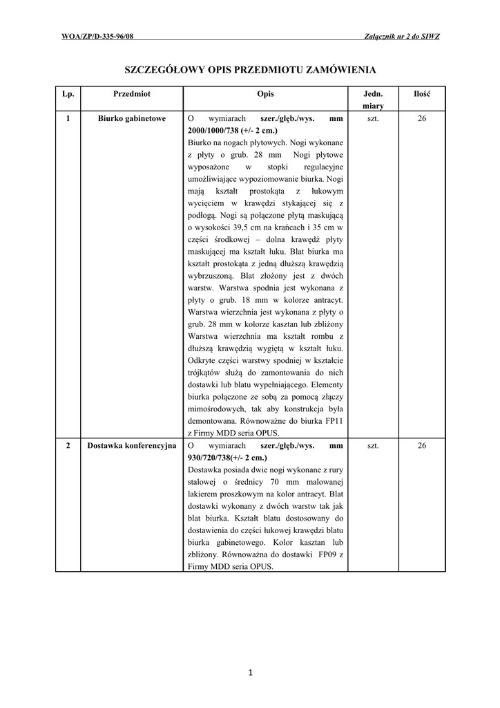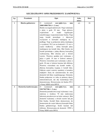 WOA/ZP/D-335-96/08 Załącznik nr 2 do SIWZ SZCZEGÓŁOWY OPIS PRZEDMIOTU ZAMÓWIENIA Lp. Przedmiot Opis 1 Biurko gabinetowe 2 Dostawka konferencyjna O wymiarach szer./głęb./wys. mm 2000/1000/738 (+/- 2 cm.) Biurko na nogach płytowych. Nogi wykonane z płyty o grub. 28 mm Nogi płytowe wyposażone w stopki regulacyjne umożliwiające wypoziomowanie biurka. Nogi mają kształt prostokąta z łukowym wycięciem w krawędzi stykającej się z podłogą. Nogi są połączone płytą maskującą o wysokości 39,5 cm na krańcach i 35 cm w części środkowej – dolna krawędź płyty maskującej ma kształt łuku. Blat biurka ma kształt prostokąta z jedną dłuższą krawędzią wybrzuszoną. Blat złożony jest z dwóch warstw. Warstwa spodnia jest wykonana z płyty o grub. 18 mm w kolorze antracyt. Warstwa wierzchnia jest wykonana z płyty o grub. 28 mm w kolorze kasztan lub zbliżony Warstwa wierzchnia ma kształt rombu z dłuższą krawędzią wygiętą w kształt łuku. Odkryte części warstwy spodniej w kształcie trójkątów służą do zamontowania do nich dostawki lub blatu wypełniającego. Elementy biurka połączone ze sobą za pomocą złączy mimośrodowych, tak aby konstrukcja była demontowana. Równoważne do biurka FP11 z Firmy MDD seria OPUS. O wymiarach szer./głęb./wys. mm 930/720/738(+/- 2 cm.) Dostawka posiada dwie nogi wykonane z rury stalowej o średnicy 70 mm malowanej lakierem proszkowym na kolor antracyt. Blat dostawki wykonany z dwóch warstw tak jak blat biurka. Kształt blatu dostosowany do dostawienia do części łukowej krawędzi blatu biurka gabinetowego. Kolor kasztan lub zbliżony. Równoważna do dostawki FP09 z Firmy MDD seria OPUS. 1 Jedn. miary szt. Ilość szt. 26 26 WOA/ZP/D-335-96/08 3 Dostawka do biurka 4 Blat wypełniający do biurka Załącznik nr 2 do SIWZ O wymiarach szer./głęb./wys. mm 600/1580/738(+/-2cm.) Blat dostawki wykonany z dwóch warstw, warstwy wierzchniej o grub. 28 mm oraz warstwy spodniej o grub 18 mm. Blat dostawki przystosowany do dostawienia do trójkątnego wycięcia w blacie biurka gabinetowego. Dostawka posiada nogę płytową wykonaną z dwóch elementów połączonych ze sobą pod kątem prostym. W nodze są stopki regulowane służące do wypoziomowania dostawki. Kolor kasztan lub zbliżony. Równoważna do dostawki FP15 lub FP14 z Firmy MDD seria OPUS. Blat wykonany z płyty o grub. 28 mm w kształcie trójkąta prostokątnego o bokach przyprostokątnych o dług. 59,7 cm oraz 69,7 cm. Blat służy do wypełnienia lewej części blatu głównego biurka gabinetowego. Równoważny do blatu FP12 lub FP13 z Firmy MDD seria OPUS. 2 szt. 26 szt. 26 WOA/ZP/D-335-96/08 5 Kontener Załącznik nr 2 do SIWZ O wymiarach szer./głęb./wys. mm(434/600/580)(+/-2cm.) Kontener mobilny wykonany z płyty wiórowej w klasie higieny E-1 laminowanej w kolorze kasztan lub zbliżony. Blat kontenera wykonany z płyty grubości, co najmniej 28 mm, korpus również z płyty o grubości, co najmniej 18mm Krawędzie wieńców, czoła szuflad oklejone obrzeżem 2 mm lub grubszym w celu zabezpieczenia krawędzi przed uderzeniem. Pozostałe krawędzie muszą być oklejone obrzeżem PCV o grubości, co najmniej 0,5 mm. Ściana tylna wykonana z płyty laminowanej grubości co najmniej 18 mm. Kontener powinien być wyposażony w trzy szuflady wykonane z tworzywa sztucznego. Szuflady zamocowane na prowadnicach kulkowych o nośności 35kg. Kontener powinien posiadać centralny zamek z blokadą drugiej szuflady oraz łamany klucz.. Kontener posadowiony na czterech kółkach w tym dwa z kółek z hamulcem. Korpus kontenera trwale sklejony w celu zapewnienia długotrwałej, precyzyjnej pracy kontenera bez dodatkowych regulacji. Wieniec górny i dolny nakładany. W czołach szuflad zamocowane metalowe uchwyty dwupunktowe gwarantujące trwałość oraz wygodę użytkowania. Kontener równoważny do kontenera KW13 z Firmy MDD. 3 szt. 26 WOA/ZP/D-335-96/08 6 Szafa Załącznik nr 2 do SIWZ O wymiarach szer./głęb./wys. mm (802/432/1833) (+/-2cm.) Wykonana z płyty wiórowej w klasie higieny E-1, laminowanej w kolorze kasztan. Wieniec górny wykonany z płyty 28mm. Krawędzie frontowe oklejone obrzeżem PVC 2mm, pozostałe PCV 0,5mm. Korpus wykonany z płyty 18mm, krawędzie oklejone obrzeżem PVC 0,5mm. Ściana tylnia-płyta grubości 18mm. Front (drzwi) wykonane z płyty o grubości 18mm, krawędzie oklejone obrzeżem PVC 2MM. Lewe skrzydło uzbrojone w elastyczną listwę przymykową. Półki w szafach muszą być mocowane za pomocą złączy zabezpieczających przed przypadkowym wysunięciem oraz zwiększających sztywność konstrukcji szafy,, krawędzie półek oklejone obrzeżem PVC 0,5mm. Stopki, w jakie wyposażone są szafy powinny mieć możliwość regulacji od wewnątrz szafy. Szafa powinna posiadać zamek patentowy z kluczem w 100 000 kombinacji. W części zamkniętej szafy znajdują się dwie przestrzenie segregatorowe natomiast w części otwartej trzy. Szafa równoważna do szafy A5404 z Firmy MDD. 4 szt. 26 WOA/ZP/D-335-96/08 7 Kontener do biurka Załącznik nr 2 do SIWZ O wymiarach szer./głęb./wys. mm 434/600/740 (+/-2cm.) Kontener wykonany z płyty wiórowej w klasie higieny E-1 laminowanej w kolorze jasna grusza. Blat kontenera wykonany z płyty grubości, co najmniej 28 mm, korpus z płyty o grubości, co najmniej 18mm. Ściana tylna wykonane z płyty laminowanej gr., co najmniej 18 mm. Krawędzie frontów oklejone powinny być obrzeżem PCV 2mm, natomiast krawędzie korpusów obrzeżem PCV 0,5mm Kontener powinien być wyposażony w cztery szuflady wykonane z tworzywa sztucznego, pierwsza z szuflad z piórnikiem nakładką. Szuflady zamocowane na prowadnicach kulkowych o nośności 35kg. Kontener wyposażony w centralny zamek z blokadą drugiej szuflady oraz łamany klucz.. Korpus kontenera trwale sklejony w celu zapewnienia długotrwałej, precyzyjnej pracy kontenera bez dodatkowych regulacji. Wieniec górny i dolny nakładany. K