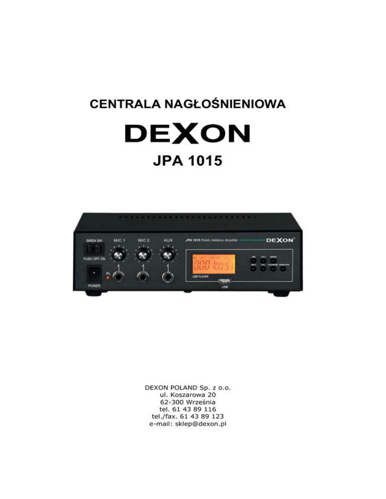 CENTRALA NAGŁOŚNIENIOWA JPA 1015 DEXON POLAND Sp. z o.o. ul. Koszarowa 20 62-300 Września tel. 61 43 89 116 tel./fax. 61 43 89 123 e-mail: [email protected] JPA 1015 - centrala nagłośnieniowa Środki ostrożności. Prosimy o uważne zapoznanie się z treścią tej instrukcji przed podłączeniem urządzenia. Postępowanie zgodnie z podanymi zasadami umożliwi pełne wykorzystanie jego zalet oraz zapewni długotrwałą eksploatację. Szczególnie istotne jest przestrzeganie zasad bezpiecznego użytkowania. UWAGA! Urządzenie zasilane jest zasilane niebezpiecznym dla życia napięciem zmiennym 230V. Aby uniknąć porażenia elektrycznego nie wolno otwierać urządzenia. Jego naprawą powinien zajmować się tylko przeszkolony personel. Samodzielne otwieranie spowoduje wygaśnięcie gwarancji. Urządzenia są przeznaczone tylko do użytku wewnątrz pomieszczeń. Należy chronić przed dostaniem się jakiejkolwiek cieczy do środka urządzeń, dużą wilgotnością oraz ciepłem (temperatura otoczenia powinna wynosić od 0-40°C). Nie wolno używać urządzenia lub natychmiast odłączyć główną wtyczkę zasilającą z gniazda: 1. Jeśli występują widoczne uszkodzenia urządzenia lub kabla zasilającego. 2. Uszkodzenie urządzenia może wystąpić w wyniku upadku lub innego podobnego zdarzenia. 3. Jeśli urządzenie działa nieprawidłowo. W takim przypadku naprawą urządzenia powinien zajmować się tylko przeszkolony personel. Do czyszczenia obudowy należy używać tylko suchej, miękkiej ściereczki. Nie wolno używać wody ani żadnych środków chemicznych. Nie ponosi się odpowiedzialności za wynikłe uszkodzenia sprzętu lub obrażenia użytkownika w przypadku, gdy urządzenie jest wykorzystywane w innych celach niż to się przewiduje lub jeśli jest nieodpowiednio zainstalowane, podłączane, użytkowane lub naprawiane. Aby nie zaśmiecać środowiska po całkowitym zakończeniu eksploatacji urządzenia należy je oddać do punktu recyklingu. Strona 2 z 6 JPA 1015 - centrala nagłośnieniowa 1. Opis ogólny. Uniwersalny wzmacniacz o mocy 15 W z wyjściem nisko impedancyjnym. Możliwość podłączenia 2 mikrofonów oraz wejście AUX. Wbudowany odtwarzacz MP3 - USB. 2. Elementy użytkowe i złącza. Panel przedni i tylny. 1. Włącznik zasilania. 2. Włącznik syreny. 3. MIC 1 - regulacja głośności wejścia mikrofonowego. 4. MIC 2 - regulacja głośności wejścia mikrofonowego. 5. AUX - regulacja głośności wejścia AUX. 6. Odtwarzacz USB. 7. Wskaźnik zasilania. 8. Gniazdo wejściowe MIC 1. 9. Gniazdo wejściowe MIC 2. 10. Gniazdo wejściowe AUX. 11. Gniazdo USB. 12. Zaciski przyłączeniowe głośników 4-16 Ω. 13. Zacisk przyłączeniowy zasilania DC 12V. Uwaga. Zachować właściwą polaryzację. 14. Przewód zasilający AC 230 V/50 Hz. 15. Gniazdo bezpiecznika. Wymieniać na zgodny z opisem 3. Opis funkcji odtwarzacza USB. 1. Pamięć USB sformatowana: FAT16, FAT32. 2. Format plików audio: tylko MP3. 3. Kolejność odtwarzania plików: Sekwencja odtwarzana: A-B-C-D-E-F-G-H-I-J Maksimum 7 podfolderów. Maksimum 32 foldery. Maksymalnie 256 plików MP3 w jednym folderze. Uwaga. Maksymalna pojemność pamięci 4 GB. Strona 3 z 6 JPA 1015 - centrala nagłośnieniowa 4. Panel USB. PRE - odtwarzanie poprzedniego utworu NEXT - odtwarzanie następnego utworu VOL+ - zwiększenie głośności VOL- - zmniejszenie głośności REPEAT: powtarzanie jednego utworu, wszystkich utworów PLAY/PAUSE: włączenie i zatrzymanie odtwarzania POWER/STOP: zatrzymuje odtwarzanie, naciśnięcie i przytrzymanie powyżej 3 sekund wyłącza lub włącza odtwarzacz 5. Wskazania wyświetlacza. gdy odtwarzacz nie ma podłączanej pamięci USB, będzie wyświetlany komunikat: gdy odtwarzacz ma podłączaną pamięć USB, a odtwarzanie jest wyłączone będzie wyświetlany komunikat: gdy odtwarzacz przeszukuje pamięć USB będzie wyświetlony komunikat: 6. Typowa instalacja. Strona 4 z 6 JPA 1015 - centrala nagłośnieniowa 7. Podłączenie głośników. 8. Dane techniczne. moc 15 W RMS, 4 Ω 2 wejścia mikrofonowe Jack 6,3 niesymetryczny 1 wejście AUX Jack 6,3 niesymetryczny THD < 1% S/N > 70 dB / AUX pasmo przenoszenia 80 - 12 000 Hz / ± 3 dB regulacja głośności każdego z wejść zasilanie AC 230 V / 50 Hz, DC 12 V wymiary 280 x 92 x 285 mm masa 2,7 kg Strona 5 z 6 Karta gwarancyjna