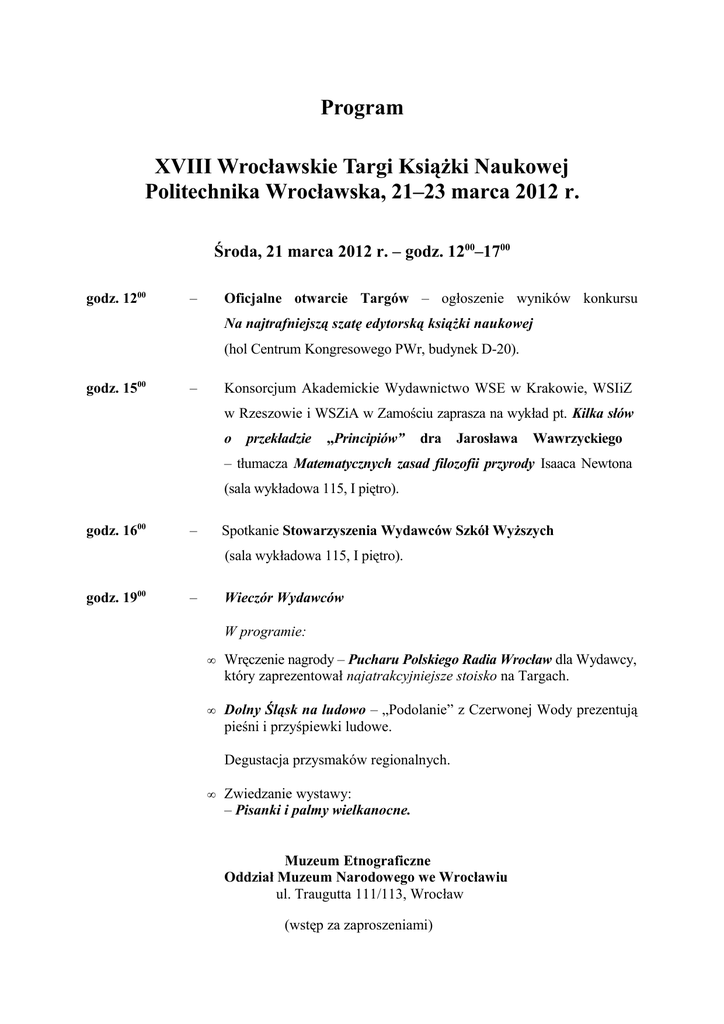 Program XVIII Wrocławskie Targi Książki Naukowej Politechnika Wrocławska, 21–23 marca 2012 r. Środa, 21 marca 2012 r. – godz. 1200–1700 godz. 1200 – Oficjalne otwarcie Targów – ogłoszenie wyników konkursu Na najtrafniejszą szatę edytorską książki naukowej (hol Centrum Kongresowego PWr, budynek D-20). godz. 1500 – Konsorcjum Akademickie Wydawnictwo WSE w Krakowie, WSIiZ w Rzeszowie i WSZiA w Zamościu zaprasza na wykład pt. Kilka słów o przekładzie „Principiów” dra Jarosława Wawrzyckiego – tłumacza Matematycznych zasad filozofii przyrody Isaaca Newtona (sala wykładowa 115, I piętro). godz. 1600 – Spotkanie Stowarzyszenia Wydawców Szkół Wyższych (sala wykładowa 115, I piętro). godz. 1900 – Wieczór Wydawców W programie: • Wręczenie nagrody – Pucharu Polskiego Radia Wrocław dla Wydawcy, który zaprezentował najatrakcyjniejsze stoisko na Targach. • Dolny Śląsk na ludowo – „Podolanie” z Czerwonej Wody prezentują pieśni i przyśpiewki ludowe. Degustacja przysmaków regionalnych. • Zwiedzanie wystawy: – Pisanki i palmy wielkanocne. Muzeum Etnograficzne Oddział Muzeum Narodowego we Wrocławiu ul. Traugutta 111/113, Wrocław (wstęp za zaproszeniami) Czwartek, 22 marca 2012 r. – godz. 900–1800 godz. 1100 Dlaczego ekonomiści tak często nie mają racji? Wykład poprowadzi prof. Grzegorz Kołodko z Akademii Leona Koźmińskiego w Warszawie (sala kongresowa 10D). Profesor Grzegorz Kołodko na stoisku Wydawnictwa Prószyński Media będzie podpisywał swoje książki Wędrujący świat i Świat na wyciągnięcie myśli (hol Centrum Kongresowego PWr, bud. D-20). godz. 1200–1400 – Wydawnictwo NORTOM zaprasza na spotkanie z ks. Janem Kurdybelskim – autor będzie podpisywał książkę pt. Biskup Wincenty Urban 1911–1983 (stoisko Wydawnictwa). godz. 1530 Współczesna polszczyzna w tekstach naukowych (humanistycznych i technicznych) w kontekście obcych wpływów językowych. Zwalczać je czy akceptować? Wykład prof. Jana Miodka z Uniwersytetu Wrocławskiego (sala kongresowa 10D). Profesor Jan Miodek na stoisku Wydawnictwa MARINA będzie podpisywał swoją książkę Słownik polsko@polski z Miodkiem. Rozmowy profesora Jana Miodka o języku polskim z telewidzami z kraju i ze świata (hol Centrum Kongresowego PWr, bud. D-20). Piątek, 23 marca 2012 r. – godz. 900–1700 godz. 1100 – Spotkanie z prof. Jackiem Suchodolskim i promocja jego najnowszej książki pt. Regionalna architektura zajazdów i schronisk na ziemi wałbrzyskiej (stoisko Oficyny Wydawniczej Politechniki Wrocławskiej). godz. 1300 – Ogłoszenie wyników i losowanie nagród w konkursie czytelniczym (hol bud. D-20). godz. 1330 – Toast pożegnalny dla uczestników XVIII WTKN (sala 114, I piętro). KSIĄŻKA NA KAŻDĄ KIESZEŃ Wyjątkowo atrakcyjną cenowo ofertę przygotowało CENTRUM TANIEJ KSIĄŻKI , WNT i Księgarnia DROPS.PL Plakat dla Studenta w promocyjnych cenach oferuje firma ONE POSTER.PL RAFAŁ LEŚNIAK Wszelkie informacje o XVIII WTKN są dostępne na stronie internetowej www.oficyna.pwr.wroc.pl