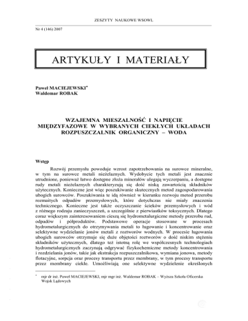 ZESZYTY NAUKOWE WSOWL Nr 4 (146) 2007 ARTYKUŁY I MATERIAŁY Paweł MACIEJEWSKI Waldemar ROBAK WZAJEMNA MIESZALNOŚĆ I NAPIĘCIE MIĘDZYFAZOWE W WYBRANYCH CIEKŁYCH UKŁADACH ROZPUSZCZALNIK ORGANICZNY – WODA Rozwój przemysłu powoduje wzrost zapotrzebowania na surowce mineralne, w tym na surowce metali nieżelaznych. Wydobycie tych metali jest znacznie utrudnione, ponieważ łatwo dostępne złoża minerałów ulegają wyczerpaniu, a dostępne rudy metali nieżelaznych charakteryzują się dość niską zawartością składników użytecznych. Konieczne jest więc poszukiwanie skutecznych metod zagospodarowania ubogich surowców. Poszukiwania te idą również w kierunku rozwoju metod przerobu rozmaitych odpadów przemysłowych, które dotychczas nie miały znaczenia technicznego. Konieczne jest także oczyszczanie ścieków przemysłowych i wód z różnego rodzaju zanieczyszczeń, a szczególnie z pierwiastków toksycznych. Dlatego coraz większym zainteresowaniem cieszą się hydrometalurgiczne metody przerobu rud, odpadów i półproduktów. Podstawowe operacje stosowane w procesach hydrometalurgicznych do otrzymywania metali to ługowanie i koncentrowanie oraz selektywne wydzielanie jonów metali z roztworów wodnych. W procesie ługowania ubogich surowców otrzymuje się duże objętości roztworów o dość niskim stężeniu składników użytecznych, dlatego też istotną rolę we współczesnych technologiach hydrometalurgicznych zaczynają odgrywać fizykochemiczne metody koncentrowania i rozdzielania jonów, takie jak ekstrakcja rozpuszczalnikowa, wymiana jonowa, metody flotacyjne, sorpcja oraz procesy transportu przez membrany, w tym procesy transportu przez membrany ciekłe. Umożliwiają one selektywne wydzielenie określonych - - Wstęp - - - mjr dr inż. Paweł MACIEJEWSKI, mjr mgr inż. Waldemar ROBAK – Wyższa Szkoła Oficerska Wojsk Lądowych Paweł MACIEJEWSKI Waldemar ROBAK składników i stanowią pośredni etap chemicznego przerobu ubogich surowców, bądź zanieczyszczonych wód. Rozwój i doskonalenie metod koncentrowania i rozdzielania jonów metali z roztworów wodnych determinuje dalszy rozwój hydrometalurgii. Procesy tego typu mają również zastosowanie w wojskach inżynieryjnych podczas oczyszczania i uzdatniana wody, jak również w wojskach chemicznych w akcjach likwidacji skażeń po zdarzeniach typu ROTA NUC, np. z użyciem broni radiologicznej. Celem artykułu jest wprowadzenie czytelnika w problematykę oraz prezentacja aktualnych osiągnięć w zakresie modelowania najczęściej spotykanych w hydrometalurgii ciekłych układów dwufazowych, tj. układów rozpuszczalnik organiczny (S) - woda (W). Autorzy zamierzają w kolejnych artykułach podjąć próbę modelowania bardziej złożonych układów, aby ostatecznie opisać rzeczywiste układy dwufazowe w procesach technologicznych. 1. Modelowanie układów dwufazowych rozpuszczalnik organiczny - woda W ustalonej temperaturze stan równowagi w ciekłych układach dwufazowych charakteryzuje stała wartość napięcia międzyfazowego, 12, oraz wzajemne nasycenie obydwu faz. Napięcie międzyfazowe oraz stan wzajemnego nasycenia w tych układach zależy wyłącznie od temperatury. Do najczęściej spotykanych ciekłych układów dwufazowych należą układy rozpuszczalnik organiczny (S) - woda (W) lub rozpuszczalnik organiczny -wodne roztwory elektrolitów, ponieważ mają one duże znaczenie praktyczne dla różnych procesów stosowanych w hydrometalurgii, technologii chemicznej i biotechnologii (ekstrakcja rozpuszczalnikowa), przeróbce kopalin (aglomeracja olejowa) i ochronie środowiska (ciekłe membrany w technologii wody i ścieków) [1,2,3-5]. Stan wzajemnego nasycenia fazy wodnej rozpuszczalnikiem i fazy organicznej wodą wyraża się zazwyczaj odpowiednimi ułamkami molowymi, xW,S i xS,W [6,7]. Należy podkreślić, że właściwości fizyczne każdej z obydwu faz, np. gęstość, lepkość, napięcie powierzchniowe, różnią się od właściwości czystej wody i czystego rozpuszczalnika organicznego. Wielkością zależną od wzajemnej rozpuszczalności w ciekłych układach dwufazowych jest napięcie międzyfazowe. W układach rozpuszczalnik organiczny woda napięcie międzyfazowe opisuje ilościowo, znana od dawna, korelacja Donahue–Bartella [8]: 12 a b log( xS ,W xW , S ) (1) Inna korelacja, sformułowana i sprawdzona w pracy [9], ma postać: - (2) Jeśli obydwie fazy w układach rozpuszczalnik organiczny - woda są wzajemnie nasycone, to po ich rozdzieleniu uzyskuje się dwie serie roztworów: nasycone roztwory wody w rozpuszczalnikach organicznych oraz nasycone roztwory rozpuszczalników w wodzie. W obydwu seriach uzyskanych roztworów dwuskładnikowych logarytmiczne wartości ułamków molowych xS,W i xW,S można skorelować z parametrami modelu Kamleta-Tafta. - - - 12 a b1 log xS ,W b2 log xW , S 6 WZAJEMNA MIESZALNOŚĆ I NAPIĘCIE MIĘDZYFAZOWE W WYBRANYCH… Ogólną postać modelu Kamleta-Tafta przedstawia równanie (3): Y f ( , , , H2 ) (3) gdzie: π* - bezwymiarowy parametr efektów polaryzacji/polaryzowalności, α - bezwymiarowy parametr zdolności rozpuszczalnika do donacji wiązania wodorowego, β - bezwymiarowy parametr zdolności rozpuszczalnika do akceptacji (β) wiązania wodorowego, H2 - kwadrat parametru rozpuszczalności Hildebranda. W przypadku serii roztworów lub ciekłych układów dwufazowych zawierających substancje rozpuszczone należące do tego samego szeregu homologicznego należy model (3) zmodyfikować, wprowadzając takie deskryptory, które pozwalają te substancje odróżnić od siebie. W wielu przypadkach zadowalające wyniki uzyskuje się, stosując objętość molową McGowana (Vx) i bilans hydrofilowohydrofobowy (HLB) [10]. Modyfikację modelu Kamleta-Tafta stosowaną przez autorów dla potrzeb niniejszej pracy przedstawia równanie (4): Y f ( , , , H2 ,Vx , HLB ) (4) gdzie: Vx - objętość molowa McGowana, HLB - bilans hydrofilowo-hydrofob