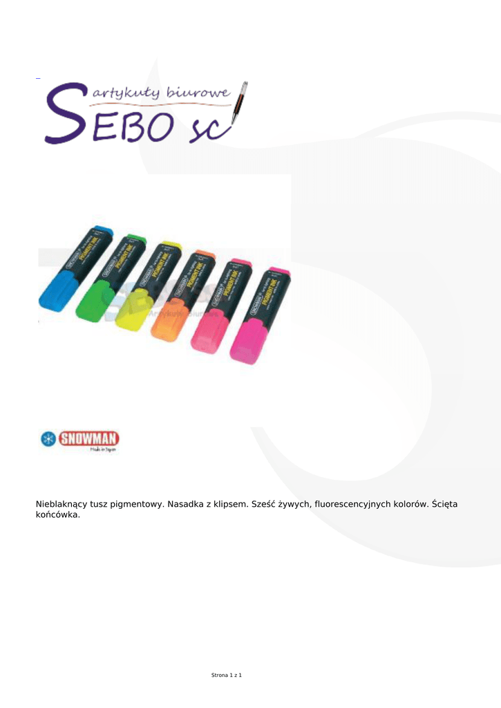 Nieblaknący tusz pigmentowy. Nasadka z klipsem. Sześć żywych, fluorescencyjnych kolorów. Ścięta końcówka. Strona 1 z 1