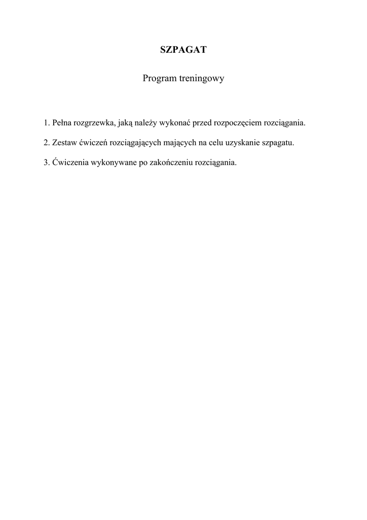 SZPAGAT Program treningowy 1. Pełna rozgrzewka, jaką należy wykonać przed rozpoczęciem rozciągania. 2. Zestaw ćwiczeń rozciągających mających na celu uzyskanie szpagatu. 3. Ćwiczenia wykonywane po zakończeniu rozciągania. Każdy trening należy rozpocząć od rozgrzewki, powinna ona trwać minimum 15 minut, aby nasze ciało, mięśnie i stawy zostały dostatecznie rozgrzane. Dzięki temu unikniemy nabawienia się kontuzji, które zdarzają się bardzo często w przypadku zaniedbania rozgrzewki i przejścia od razu do intensywnych ćwiczeń fizycznych jak i rozciągania (mięśnie, stawy i ścięgna są zastygłe i nie rozgrzane). 1. Rozgrzewkę zaczynamy od wykonania następujących ćwiczeń: - bieg w truchcie, stopniowo przechodzący w szybszy bieg. Celem tego jest rozruszanie wszystkich partii mięśni, zwiększenie przepływu krwi w celu lepszego dotlenienia oraz rozgrzanie organizmu. Podczas truchtu unosimy kolana jak najwyżej, następnie unosimy („uderzamy”) pięty do pośladków. - krążenie głową w lewą i prawą stronę, przechylanie na boki, skręty głowy na boki maksymalnie do tyłu, odchylenie głowy maksymalnie do tyłu (patrzymy za siebie) i nachylenie do przodu (staramy się dotknąć podbródkiem do klatki piersiowej). - wykonujemy pajacyki na boki i po skosie. - wykonujemy podskoki podnosząc stopy do góry do środka i na zewnątrz (wykonujemy to w lekkim biegu - trucht), dotykając stopą do dłoni. - krążenia dłoni w nadgarstkach. - krążenia ramion w stawach barkowych (do przodu i do tyłu). - silne i energiczne wymachy rękami na boki. - krążenia przedramion w stawach łokciowych (do wewnątrz, na zewnątrz i na boki). - krążenie bioder w rozkroku na szerokość bioder (w lewą, prawą stronę i na boki) – należy się starać aby nie wykonywać ruchów głową a jedynie samymi biodrami. - obszerne krążenie tułowiem (w lewą i prawą stronę). Po solidnym i rzetelnym wykonaniu tych ćwiczeń nasze ciało będzie już w pełni rozgrzane i przygotowane do rozpoczęcia treningu mającego na celu zrobienie szpagatu. 2. Rozpoczynamy zasadniczą część naszego treningu. Każde z poniższych ćwiczeń powinno być wykonywane przez co najmniej kilka sekund. Podczas tych ćwiczeń należy się jak najbardziej rozluźnić - psychicznie - stres powoduje sztywnienie mięsni, a co za tym idzie uniemożliwia rozciągnięcie mięśni. Jest to spowodowane tym, że mięśnie pracują wówczas w przeciwnym kierunku (napinanie) niż podczas rozciągania. Tych ćwiczeń nie powinno się wykonywać w momencie, gdy jest się zdenerwowanym, aktualnie (w danej chwili) pod wpływem stresu. Najlepszym momentem na wykonanie tych ćwiczeń jest stan relaksu. Same ćwiczenia zwiększają komfort psychiczny i pomagają w fizycznym odprężeniu. - wymachy okrężne nóg na zewnątrz (wykonujemy lewą i prawą nogą) - należy starać się robić wymachy wyprostowaną nogą nie zginając jej w stawie kolanowym. Wykonujemy tak jak wymachy w przód (patrz na koniec – ćwiczenia robione w seriach) tyle, że wykonujemy ruchy okrężne. - wymach okrężne nóg do wewnątrz (wykonujemy lewą i prawą nogą) - należy starać się robić wymachy wyprostowaną nogą nie zginając jej w stawie kolanowym. Wykonujemy tak jak wymachy w przód (patrz na koniec – ćwiczenia robione w seriach) tylko wykonujemy ruchy okrężne. - przysiad obunóż na palcach, następnie wyprost i stanie na piętach wykonując nacisk dłoni na kolana. - zrobienie wykroku do przodu uginając przednie kolano o kąt 90 stopni i jednocześnie podnosząc do góry piętę tylnej nogi (wykonujemy na prawą i lewą stronę). - zrobienie wykroku do przodu uginając przednie kolano o kąt 90 stopni i jednocześnie trzymając wyprostowaną nogę bokiem, cała stopa musi przylegać do podłoża. - skłony głową do kolan (obie stopy złączone a kolana wyprostowane, staramy się przyciągać klatkę piersiową a nie głowę). - skręty tułowia w lekkim rozkroku dotykamy na przemian prawą ręką do lewej nogi i odwrotnie lewą do prawej. - w szerokim rozkroku w staniu głęboki skłon w przód a następnie skłony do prawej i do lewej nogi, następnie wyprost tułowia i wychylenie w tył z wypchnięciem bioder w przód. - skłony przód w siadzie płaskim z wyprostowanymi nogami, starać się wykonywać skłony klatką piersiową do kolan a nie głową, gdyż skłony głową powodują tylko wyginanie pleców a nie rozciąganie ścięgien nóg. - siad płaski, stopy złączone razem (podciągnięte jak najbliżej do pośladków), a kolana skierowane na zewnątrz (tzw. Motylek). Kolana dociskamy łokciami do podłoża, można skorzystać także z pomocy partnera, który wykona to ćwiczenie stojąc za naszymi plecami. W przypadkach szczególnych, aby docisk kolan do podłoża był lepszy partner może stanąć nogami na nasze kolana. - w pozycji opisanej wyżej wykonujemy skłony głową (klatką piersiową) do stóp, pomagając sobie rękami (ręce przyciągają stopy). - skłony w siadzie płotkarskim – jedna noga wyprostowana, a druga zgięta w kolanie i odstawiona maksymalnie do tyłu (staramy się uzyskać jak największy kąt między nogą wyprostowaną a zgiętą w kolanie). Wykonujemy skłony do nogi wyprostowanej, następnie do środka i na zewnątrz do nogi ugiętej. - wykonujemy maksymalny rozkrok, a następnie powoli siadamy nie skracając tego rozkroku i wykonujemy skłony do środka oraz do prawej i lewej nogi (staramy się dociskać klatkę piersiową). - rozciąganie z partnerem przy ścianie – stajemy przy ścianie opierając się plecami aby sylwetka była wyprostowana, a partner unosi naszą nogę do góry aż do oporu, robiąc to z wyczuciem aby nie wykonać tego za mocno. Rozciąganie wykonujemy tak jak jest to robione w ćwiczeniach wykonywanych w seriach (patrz niżej). Rozciągamy nogi najpierw stojąc przodem, następnie rozciągamy w bok, a na koniec rozciągamy mięśnie