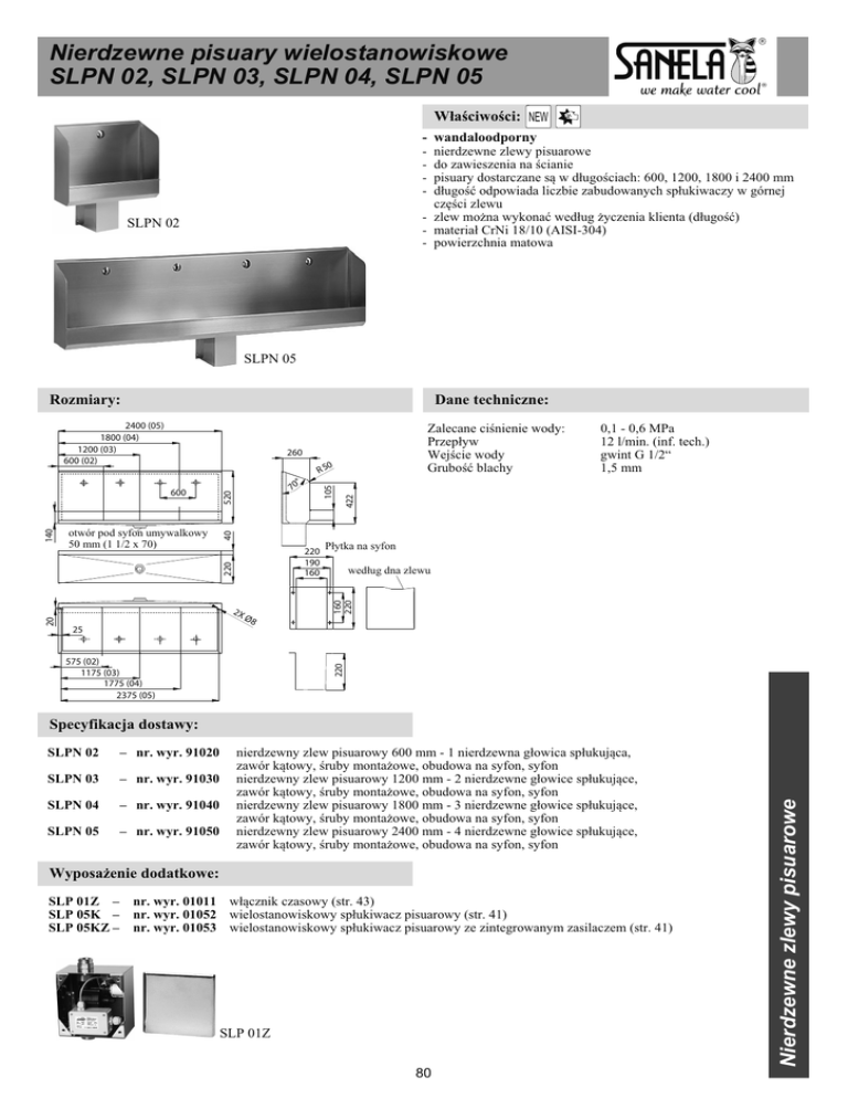 Nierdzewne pisuary wielostanowiskowe SLPN 02, SLPN 03, SLPN 04, SLPN 05 Waciwoci: NEW - wandaloodporny - nierdzewne zlewy pisuarowe do zawieszenia na cianie pisuary dostarczane s w dugociach: 600, 1200, 1800 i 2400 mm dugo odpowiada liczbie zabudowanych spukiwaczy w górnej czci zlewu - zlew mona wykona wedug yczenia klienta (dugo) - materia CrNi 18/10 (AISI-304) - powierzchnia matowa SLPN 02 SLPN 05 Dane techniczne: Rozmiary: 2400 (05) 1800 (04) 1200 (03) 600 (02) 260 105 422 520 220 190 160 Pytka na syfon wedug dna zlewu 160 220 2X Ø 25 0 R5 0,1 - 0,6 MPa 12 l/min. (inf. tech.) gwint G 1/2“ 1,5 mm 40 otwór pod syfon umywalkowy 50 mm (1 1/2 x 70) ° 70 220 140 600 20 Zalecane cinienie wody: Przepyw Wejcie wody Grubo blachy 8 220 575 (02) 1175 (03) 1775 (04) 2375 (05) SLPN 02 – nr. wyr. 91020 SLPN 03 – nr. wyr. 91030 SLPN 04 – nr. wyr. 91040 SLPN 05 – nr. wyr. 91050 nierdzewny zlew pisuarowy 600 mm - 1 nierdzewna gowica spukujca, zawór ktowy, ruby montaowe, obudowa na syfon, syfon nierdzewny zlew pisuarowy 1200 mm - 2 nierdzewne gowice spukujce, zawór ktowy, ruby montaowe, obudowa na syfon, syfon nierdzewny zlew pisuarowy 1800 mm - 3 nierdzewne gowice spukujce, zawór ktowy, ruby montaowe, obudowa na syfon, syfon nierdzewny zlew pisuarowy 2400 mm - 4 nierdzewne gowice spukujce, zawór ktowy, ruby montaowe, obudowa na syfon, syfon Wyposaenie dodatkowe: SLP 01Z – SLP 05K – SLP 05KZ – nr. wyr. 01011 wcznik czasowy (str. 43) nr. wyr. 01052 wielostanowiskowy spukiwacz pisuarowy (str. 41) nr. wyr. 01053 wielostanowiskowy spukiwacz pisuarowy ze zintegrowanym zasilaczem (str. 41) SLP 01Z 80 Nierdzewne zlewy pisuarowe Specyfikacja dostawy: