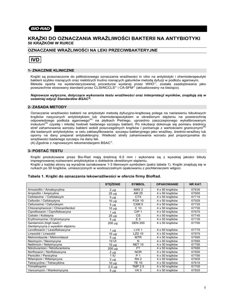 KRĄŻKI DO OZNACZANIA WRAŻLIWOŚCI BAKTERII NA ANTYBIOTYKI 50 KRĄŻKÓW W RURCE OZNACZANIE WRAŻLIWOŚCI NA LEKI PRZECIWBAKTERYJNE 1- ZNACZNIE KLINICZNE Krążki są przeznaczone do półilościowego oznaczania wrażliwości in vitro na antybiotyki i chemioterapeutyki bakterii szybko rosnących oraz niektórych trudno rosnących gatunków metodą dyfuzji w podłożu agarowym. Metoda oparta na wystandaryzowanej procedurze wydanej przez WHOc, została zaadoptowana jako powszechnie stosowany standard przez CLSI/NCCLSd i CA-SFMe (aktualizowany na bieżąco). Najnowsze wytyczne, dotyczące wykonania testu wrażliwości oraz interpretacji wyników, znajdują się w ostatniej edycji Standardów BSACf. 2- ZASADA METODY Oznaczanie wrażliwości bakterii na antybiotyki metodą dyfuzyjno-krążkową polega na naniesieniu bibułowych krążków nasyconych antybiotykiem lub chemioterapeutykiem w określonym stężeniu na powierzchnię odpowiedniego podłoża agarowego(A) na płytkach Petriego, uprzednio zaszczepionego wykalibrowanym inokulum(A) czystej i młodej hodowli badanego szczepu bakterii. Po inkubacji dokonuje się pomiaru średnicy (A) stref zahamowania wzrostu bakterii wokół poszczególnych krążków i porównuje z wartościami granicznymi dla badanych antybiotyków, w celu zaklasyfikowania szczepu bakteryjnego jako wrażliwy, średnio-wrażliwy lub oporny na dany preparat antybakteryjny. Wielkość strefy zahamowania wzrostu jest proporcjonalna do wrażliwości badanego szczepu na dany lek. (A) Zgodnie z najnowszymi rekomendacjami BSACf. 3- POSTAĆ TESTU Krążki produkowane przez Bio-Rad mają średnicę 6.5 mm i wykonane są z wysokiej jakości bibuły impregnowanej roztworami antybiotyków o dokładnie określonym stężeniu. Krążki z każdej strony są wyraźnie oznakowane 1-3 literowym symbolem (patrz tabela 1). Krążki znajdują się w rurkach po 50 krążków, umieszczonych w wodoszczelnym opakowaniu z pochłaniaczem wilgoci. Tabela 1. Krążki do oznaczania lekowrażliwości w ofercie firmy BioRad. Amoxicillin / Amoksycylina Ampicillin / Ampicylina Cefotaxime / Cefotaksym Cefoxitin / Cefoksytyna Cefuroxime / Cefuroksym Chloramphenicol / Chloramfenikol Ciprofloxacin / Ciprofloksacyna Colistin / Kolistyna Erythromycine / Erytromycyna Gentamicin (high load) / Gentamycyna o wysokim stężeniu Levofloxacin / Lewofloksacyna Linezolid / Linezolid Metronidazole / Metronidazol Neomycin / Neomycyna Netilmicin / Netylmycyna Nitrofurantoin / Nitrofurantoina Norfloxacin / Norfloksacyna Penicillin / Penicylina Rifampicin / Rifampicyna Tetracycline / Tetracyklina Trimethoprim Vancomycin / Wankomycyna STĘŻENIE SYMBOL OPAKOWANIE NR KAT. 2 μg 25 μg 5 μg 10 μg 5 μg 10 μg 1 μg 25 μg 5 μg 200 μg AMX 2 AM 25 CTX FOX 10 CXM 5 C 10 CIP 1 CS E5 GEN 200 4 x 50 krążków 4 x 50 krążków 4 x 50 krążków 4 x 50 krążków 4 x 50 krążków 4 x 50 krążków 4 x 50 krążków 4 x 50 krążków 4 x 50 krążków 4 x 50 krążków 67838 67668 67718 67928 67728 67758 67678 67748 67738 67768 1 μg 10 μg 5 μg 10 UI 10 μg 200 μg 2 μg 1 IU 2 μg 10 μg 2,5 μg 5 μg LVX 1 LZD 10 MTR N NET 10 FT NOR P1 RA 2 TE 10 TMP 2.5 VA 5 4 x 50 krążków 4 x 50 krążków 4 x 50 krążków 4 x 50 krążków 4 x 50 krążków 4 x 50 krążków 4 x 50 krążków 4 x 50 krążków 4 x 50 krążków 4 x 50 krążków 4 x 50 krążków 4 x 50 krążków 67778 67878 67898 67888 67798 67688 67698 67788 67808 67818 67708 67828 1 4- PRZECHOWYWANIE Podana data ważności odnosi się wyłącznie do krążków w nieotwieranym opakowaniu, przechowywanym zgodnie z zaleceniami producenta. Data ważności i numer serii znajdują się na etykiecie (na rurce z krążkami oraz na opakowaniu zewnętrznym). • Rurki z krążkami należy przechowywać w oryginalnym opakowaniu w temp. +2-8°C w suchym miejscu. • Przed otwarciem opakowanie z krążkami musi osiągnąć do temp. pokojową (18-30°C). Po wyjęciu potrzebnej liczby krążków, pozostałe schować do lodówki. • Nie używać krążków po upływie terminu przydatności. W przypadku krążków, które były pozostawione w temp. pokojowej (18-30°C) ponad 8 godzin, nastawić antybiogramy wzorcowe przed dalszym (5) użytkowaniem . • Krążki pozostające w dyspenserze powinny być przechowywane w temp. +2-8°C w suchym miejscu, z pochłaniaczem wilgoci wewnątrz. W otwartym opakowaniu lub w dyspenserze, krążki są stabilne przez 6 tygodni (przechowywane zgodnie z zaleceniami z pochłaniaczem wilgoci) za wyjątkiem krążków nasączonych antybiotykiem, oznaczonych symbolem , których okres stabilności, wyrażony w tygodniach, oznaczony jest we wnętrzu symbolu. 5- INNE NIEZBĘDNE MATERIAŁY • • • • • • Dyspenser krążków na 6 krążków nr kat. # 50271 na 8 krążków nr kat. # 50270 na 12-16 krążków nr kat. # 50295 Podłoża mikrobiologiczne zgodnie z najnowszymi zaleceniami BSACf Odczynniki Szczepy wzorcowe bakterii Wzorzec gęstości inokulum: 0.5 w skali McFarlanda Sprzęt laboratoryjny do oznaczania wrażliwości na antybiotyki metodą dyfuzyjno-krążkową 6- ZALECENIA DLA UŻYTKOWNIKA Należy postępować zgodnie z najnowszymi wytycznymi BSACf. Zawsze należy przestrzegać zasad bezpieczeństwa pracy z materiałem zakaźnym. Wykorzystane hodowle i wszystkie zanieczyszczone nimi materiały poddać sterylizacji. 7- PROCEDURA • Próbki: Testu wrażliwości nie należy wykonywać na podłożach z bezpośrednio wysianym materiałem klinicznym. Stosowane do testu inokulum bakterii powinno być przygotowane wg zaleceń BSACf z czystej, młodej hodowli. • Każdy etap oznaczenia wrażliwości na antybiotyki powinien być wykonywany zgodnie z instrukcjami BSACf: sporządzenie wystandaryzowanego inokulum, wysiew na płytki Petriego, dobór i układ na płytce odpowiednich krążków, temperatura i czas inkubacji oraz interpretacja wyników. Należy przestrzegać zasad Dobrej Praktyki Laboratoryjnej. 8- INTERPRETACJA WYNIKÓW • • •
