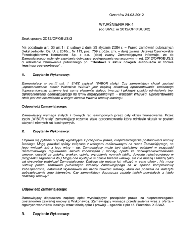Ozorków 24.03.2012 WYJAŚNIENIA NR 4 (do SIWZ nr 2012/OPK/BUS/2) Znak sprawy: 2012/OPK/BUS/2 Na podstawie art. 38 ust.1 i 2 ustawy z dnia 29 stycznia 2004 r. – Prawo zamówień publicznych (tekst jednolity: Dz. U. z 2010r., Nr 113, poz. 759 z późn. zm. – dalej zwana Ustawą) Ozorkowskie Przedsiębiorstwo Komunalne Sp. z o.o. (dalej zwany Zamawiającym) informuje, że do Zamawiającego wpłynęły zapytania dotyczące postępowania oznaczonym nr rej. 2012/OPK/BUS/2 o udzielenie zamówienia publicznego pn. ”Dostawa 2 sztuk nowych autobusów w formie leasingu operacyjnego” . 1. Zapytanie Wykonawcy: Zamawiający w par.III ust. 1 SIWZ zapisał: (WIBOR stały). Czy zamawiający chciał zapisać „oprocentowanie stałe? Wskaźnik WIBOR jest częścią składową oprocentowania zmiennego (oprocentowanie zmienne jest sumą elementu stałego (marzy) i jakiegoś punktu odniesienia (np. oprocentowania obowiązującego na rynku międzybankowym – wskaźnik WIBOR). Oprocentowanie stałe jest zaś niezmienne w całym okresie trwania umowy leasingu. Odpowiedź Zamawiającego: Zamawiający wymaga stałych i równych rat leasingowych przez cały okres finansowania. Przez zapis „WIBOR stały” zamawiający rozumie stałe oprocentowanie które odniesie skutek w postaci stałych i równych rat leasingowych. 2. Zapytanie Wykonawcy: Pojawia się pytanie o opłaty wynikające z przepisów prawa, nieprzestrzegania postanowień umowy leasingu. Mogą powstać opłaty związane z usługami realizowanymi na rzecz Zamawiającego, na jego wniosek lub z jego winy – np. Zamawiający może być obciążony oplatami w przypadki nieterminowego regulowania swoich zobowiązań ( monity, oplata za rozwiązanie/wznowienie umowy, odsetki za zwłokę, aneksy, opinie, wyrobienie nowych tablic, dowodu rejestracyjnego w przypadku zagubienia itp.) Mogą one wystąpić w czasie trwania umowy, ale nie muszą i zależą tylko od dyscypliny płatniczej Zamawiającego. Dlatego nie można ich wliczyć w cenę oferty . Na mocy ustawy prawo zamówień publicznych interesy Zamawiającego sa w sposób kompleksowy zabezpieczone, natomiast Wykonawca nie może zawrzeć umowy, która nie pozwala na należyte zabezpieczenie jego interesów. Czy zamawiający dopuszcza zapłatę takich powstałych z tytułu realizacji umowy? Odpowiedź Zamawiającego: Zamawiający dopuszcza zapłatę opłat wynikających przepisów prawa za nieprzestrzeganie postanowień zawartej umowy z Wykonawcą. Zamawiający wymaga przedstawienia wraz z ofertą – ogólnych warunków leasingu wraz tabelą opłat i prowizji – zgodnie z pkt 15. Rozdziału X SIWZ. 3. Zapytanie Wykonawcy: Czy zamawiający zgodzi się na zmianę wynagrodzenia w przypadku wzrostu stawek ubezpieczeniowych przy zachowaniu równych rat leasingowych przez cały okres trwania umowy leasingu? Odpowiedź Zamawiającego: Zamawiający wymaga aby koszty ubezpieczenia za cały okres umowy były wliczone do rat leasingowych które będą obowiązywały w niezmiennej wysokości przez cały okres umowy. 4. Zapytanie Wykonawcy: „Poszczególne raty leasingowe będą uiszczane na podstawie faktur VAT wystawianych przez Wykonawcę co miesiąc, w całym okresie trwania umowy”. ’ Płatność nastapi w terminie co najmniej 14 dni od daty wystawienia Zamawiającemu prawidłowo wystawionej faktury VAT, przelewem na rachunek bankowy Wykonawcy. Wykonawca niezwłocznie po wystawieniu Faktury wysyła ją faksem Zamawiającemu a następnie dostarczy oryginał” Prosimy o wykreślenie tych zapisów, gdyż podstawa płatności rat wynagrodzenia nie jest faktura, lecz harmonogram płatności rat leasingowych określony w umowie leasingu. Wykonawca może zobowiązać się jedynie do dostarczania fv np. 10 dni przed terminem wymagalności raty. Do dokonania płatności obliguje podpisana umowa leasingu a nie faktura. Czy zamawiający zgodzi się również na nie wysyłanie faxem faktur, gdy Leasingodawca dysponuje systemem, który pozwala Leasingobiorcy zalogowanie się do programu udostępniającego podgląd faktur? Odpowiedź Zamawiającego: Zamawiający nie zmienia zapisów SIWZ. PREZES ZARZĄDU