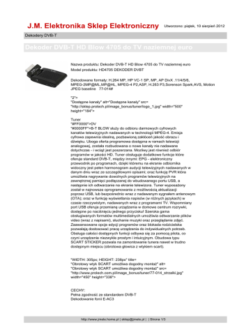 J.M. Elektronika Sklep Elektroniczny Utworzono: piątek, 10 sierpień 2012 Dekodery DVB-T Dekoder DVB-T HD Blow 4705 do TV naziemnej euro Nazwa produktu: Dekoder DVB-T HD Blow 4705 do TV naziemnej euro Model produktu: HD4705 DEKODER DVBT Dekodowane formaty: H.264 MP, HP VC-1 SP, MP, AP DivX .11/4/5/6, MPEG-2MP@ML,MP@HL, MPEG-4 P2,ASP, H.263 P3,Sorenson Spark,AVS, Motion JPEG baseline 77-014# "2"> "Dostępne kanaly" alt="Dostępne kanaly" src= "http://sklep.prolech.pl/image_bonus/tuner/logo_1.jpg" width="500" height="184"> Tuner "#FF0000">DV "#0000FF">B-T BLOW służy do odbioru darmowych cyfrowych kanałów telewizyjnych nadawanych w technologii MPEG-4. Emisja cyfrowa zapewnia idealną, pozbawioną zakłóceń jakość obrazu i dźwięku. Uboga oferta programowa dostępna w ramach telewizji analogowej, została rozbudowana o nowe kanały nie nadawane dotychczas - i wciąż jest poszerzana. Mozliwy jest również odbiór programów w jakości HD. Tuner obsługuje dodatkowe funkcje które oferuje standard DVB-T, między innymi: EPG - elektroniczny przewodnik po programach, dzięki któremu na ekranie odbiornika widoczny jest pełen harmonogram audycji telewizyjnych nadawanych w danym dniu wraz ze szczegółowymi opisami; oraz funkcję PVR która umożliwia nagrywanie dowolnych programów telewizyjnych na zewnętrznej pamięci podłączanej do wbudowanego portu USB, a następnie ich odtwarzanie na ekranie telewizora. Tuner wyposażony został w najnowsze oprogramowanie z możliwością aktualizacji poprzez USB, lub bezpośrednio wraz z nadawanym sygnałem antenowym (OTA); oraz w funkcję wyświetlania napisów (w różnych językach) w czasie rzeczywistym, nadawanych wraz z programami TV. Wspomniany port USB oferuje przemianę urządzenia w domowe centrum rozrywki, dostępne po naciśnięciu jednego przycisku! Szeroka gama obsługiwanych formatów multimedialnych umożliwia odtwarzanie plików video (wraz z napisami), słuchanie muzyki oraz przeglądanie zdjęć. Zaawansowane opcje edycji programów oraz blokada rodzicielska pozwalają dostosować pracę urządzenia do indywidualnych potrzeb. Obsługa całości dostępnych funkcji odbywa się za pomocą pilota, co czyni urządzenie niezwykle prostym i intuicyjnym. Obudowa typu SCART STICKER pozwala na zamontowanie tunera nawet w trudno dostępnym miejscu (obrotowa głowica z wtykiem scart). "WIDTH: 305px; HEIGHT: 238px" title= "Obrotowy wtyk SCART umożliwa dogodny montaż" alt= "Obrotowy wtyk SCART umożliwa dogodny montaż" src= "http://www.prolech.com.pl/image_bonus/tuner/77-014_strzalki.jpg" width="450" height="338"> CECHY: Pełna zgodność ze standardem DVB-T Dekodowanie fonii E-AC3 http://www.jmele.home.pl | [email protected] | | Strona 1/3 J.M. Elektronika Sklep Elektroniczny Utworzono: piątek, 10 sierpień 2012 Dekodery DVB-T Dekoder DVB-T HD Blow 4705 do TV naziemnej euro Odbiór kanałów HD i SD (wysokiej i standard. rozdzielczości) nadawanych w formatach MPEG-4, MPEG-2, AVC/H.264 Zakres częstotliwości : VHF:174~230MHz ; UHF:470~862MHz Rozdzielczość: 480i / 576i / 480p / 576p / 1080i / 1080p EPG - elektroniczny informator programowy ( do 7 dni) Wielojęzyczne menu ekranowe (OSD) Funkcja PVR ? możliwość zapisywania programów TV na dysku przenośnym Time-shift - funkcja nagrywania z opóźnieniem Wyjście: HDMI Odczyt Formatów: Video: AVI, MPEG 1/2/4, XViD Odczyt napisów: TXT, SRT, SUB, Odczyt Formatów Audio: MP3 Odczyt Formatów Foto: JPG, BMP Zasilanie: 5V 2A Dwa punkty swobody: obracana głowica z wtykiem (zakres 180 stopni), oraz regulacja orientacji samego wtyku (zakres 180 stopni) DANE TECHNICZNE: - Pamięć: 512Mb DDR2 800MHz - Napięcie: 5 VDC 2A - Moc (pobór prądu): Max 8 W, (standby: <1W) - Wymiary: 156mm X 830mm X 24mm - Waga: (w przybliżeniu) 126g. - Chipset: NT78310 - Dekodowane formaty: H.264 MP, HP VC-1 SP, MP, AP DivX 3.11/4/5/6,MPEG-2MP@ML,MP@HL, MPEG-4 P2,ASP, H.263 P3,Sorenson Spark,AVS, Motion JPEG baseline - Pamięć tunera: 950 kanałów TV i radio - Aktywna antena: możliwość zasilania aktywnej anteny 5V 400 mA - Procesor: 32-bit 333MHz RISC CPU, częstotliwość pamięci 800MHz - Pamięć FLASH: 32MB - Demodulator: TDA18219HN ZESTAW ZAWIERA: - Tuner DVB-T 4705HD - Pilot zdalnego sterowania - Przyłącze: odbiornik podczerwieni do pilota - Przyłącze: wtyk mini USB - gniazdo USB - Zasilacz sieciowy 5V 2000 mA - Instrukcja obsługi w języku polskim http://www.jmele.home.pl | [email protected] | | Strona 2/3 J.M. Elektronika Sklep Elektroniczny Utworzono: piątek, 10 sierpień 2012 Dekodery DVB-T Dekoder DVB-T HD Blow 4705 do TV naziemnej euro 2 Dostępność: Ten produkt został dodany do sklepu w dniu czwartek, 26 maj 2011 http://www.jmele.home.pl | [email protected] | | Strona 3/3