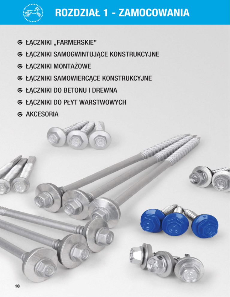 ROZDZIAŁ 1 - ZAMOCOWANIA ŁĄCZNIKI „FARMERSKIE” ŁĄCZNIKI SAMOGWINTUJĄCE KONSTRUKCYJNE ŁĄCZNIKI MONTAŻOWE ŁĄCZNIKI SAMOWIERCĄCE KONSTRUKCYJNE ŁĄCZNIKI DO BETONU I DREWNA ŁĄCZNIKI DO PŁYT WARSTWOWYCH AKCESORIA 18 SAMOWIERCĄCE I GWINTUJĄCE strona symbol nazwa ŁĄCZNIKI "FARMERSKIE" 36 36 37 37 38 38 39 39 40 40 41 GT F2 Z14 GTZ F2 S14 GTX FO2 S14 GTX F2 S14 GT FS Z14 GT F HD Z16 GT F2 P GTF P GTF 02 P Łączniki „farmerskie” z podkładką aluminiową (zszywka) Łączniki „farmerskie” z podkładką aluminiową Łączniki „farmerskie” z podkładką stalową Nierdzewne łączniki „farmerskie“ z podkładką nierdzewną Bimetaliczne łączniki „farmerskie“ nierdzewne z podkładką nierdzewną (zszywka) Bimetaliczne łączniki „farmerskie“ nierdzewne z podkładką nierdzewną Łączniki „farmerskie” z podkładką aluminiową bez wiertła Łączniki „farmerskie” z podkładką stalową Łączniki „farmerskie” bez podkładki do paneli dachowych Łączniki „farmerskie” typu: panhead z podkładką aluminiową Łączniki „farmerskie” z podkładką aluminiową (zszywka) ŁĄCZNIKI SAMOGWINTUJĄCE KONSTRUKCYJNE 42 42 GT A Z16 GT B Z16 Łączniki samogwintujące typ A z podkładką stalową Łączniki samogwintujące typ B z podkładką stalową ŁĄCZNIKI MONTAŻOWE 43 43 44 44 GM-S GMZ-S GM-B GM-K Łączniki montażowe wiercące Nierdzewne łączniki montażowe wiercące Łączniki montażowe samowiercące Łączniki montażowe samowiercące typu kombi ŁĄCZNIKI SAMOWIERCĄCE KONSTRUKCYJNE 45 45 46 46 47 47 48 48 49 49 50 50 51 51 52 52 53 54 54 55 55 56 56 GT O2 GT O2 Z14 GTR O2 GTR O2 A14 GT O3 FH GT 3 GT 3 Z14 GT 3 HD GT 3 HD Z14 GTR 3 GTR 3 A14 GTS-STAR GTX 3 GTX 3 S14 GT 5 FH GT 5 GT 5 Z14/Z16 GTR 5 GTR 5 A14 GTX 5 GTX 5 S14 GT 6 GT 6 Z16 Łączniki bez podkładki do mocowania blach na zakład (zszywka) Łączniki z podkładką do mocowania blach na zakład (zszywka) Łączniki bez podkładki do mocowania blach na zakład (zszywka) Łączniki z podkładką do mocowania blach na zakład (zszywka) Łączniki ze zintegrowanym kołnierzem dociskowym do łączenia blach na zakład (zszywka) Łączniki bez podkładki do mocowania blach Łączniki z podkładką do mocowania blach Łączniki bez podkładki do mocowania blach Łączniki z podkładką do mocowania blach Łączniki bez podkładki do mocowania blach Łączniki z podkładką do mocowania blach Łączniki do mocowania profili stalowych Bimetaliczne łączniki bez podkładki do mocowania blach Bimetaliczne łączniki z podkładką do mocowania blach Łączniki ze zintegrowanym kołnierzem dociskowym do łączenia blach Łączniki bez podkładki do mocowania blach Łączniki z podkładką do mocowania blach Łączniki bez podkładki do mocowania blach Łączniki z podkładką do mocowania blach Bimetaliczne łączniki nierdzewne bez podkładki do mocowania blach Bimetaliczne łączniki nierdzewne z podkładką do mocowania blach Łączniki bez podkładki do mocowania blach Łączniki z podkładką do mocowania blach 1 19 ROZDZIAŁ 1 - ZAMOCOWANIA strona symbol nazwa 57 57 58 58 59 59 60 60 61 61 62 62 63 63 64 Łączniki bez podkładki do mocowania blach Łączniki z podkładką do mocowania blach Łączniki bez podkładki do mocowania blach Łączniki z podkładką do mocowania blach Łączniki ze zintegrowanym kołnierzem dociskowym do mocowania blach Łączniki bez podkładki do mocowania blach Łączniki z podkładką do mocowania blach Łączniki bez podkładki do mocowania blach Łączniki z podkładką do mocowania blach Bimetaliczne łączniki nierdzewne z podkładką do mocowania blach Łączniki bez podkładki do mocowania blach Łączniki z podkładką do mocowania blach Bimetaliczne łączniki nierdzewne bez podkładki do konstrukcji aluminiowych Bimetaliczne łączniki nierdzewne z podkładką nierdzewną do konstrukcji aluminiowych Łączniki z podkładką do mocowania szklenia w systemach fasadowych GT 8 GT 8 Z14/Z16 GTR 8 GTR 8 A14/A16 GT 12 FH GT 12 GT 12 Z14/Z16 GTR 12 GTR 12 A14/A16 GTX 12 S14 GTR 16 GTR 16 A16 GTX 3 AL GTX 3 AL S14 GTZ 5 AGF S16 ŁĄCZNIKI DO BETONU I DREWNA 64 GTR W FH 65 65 GTR W GTR W A16 Łączniki ze zintegrowanym kołnierzem dociskowym do mocowania blach w podłożu betonowym i drewnianym Łączniki bez podkładki do mocowania blach w podłożu betonowym Łączniki z podkładką do mocowania blach w podłożu betonowym i drewnianym ŁĄCZNIKI DO PŁYT WARSTWOWYCH 66 67 68 69 70 71 72 GT 6 L Z19 GTR 6 SP A19 GTX 6 SP S19 S29 GTR 12 SP A19 GTX 12 SP S19 S29 GTR 16 SP A19 GTR W SP A19 AKCESORIA 73 73 74 75 76 77 77 78 78 79 79 80 80 81 81 20 KALOTY ULTRA NITY OTWARTE AL/FE NITY SZCZELNE AL/FE NITY OTWARTE AL/INOX NITY SZCZELNE AL/INOX KOŃCÓWKI DO WKRĘTAREK WIERTŁA KAPTURKI MASKUJĄCE FARBY FARBY KOŁNIERZE USZCZELNIAJĄCE USZCZELKI USZCZELKI PIANA MONTAŻOWA Łączniki do mocowania systemu blacha-wełna-blacha Łączniki z podkładką do mocowania płyt warstwowych Bimetaliczne łączniki nierdzewne z podkładką do mocowania płyt warstwowych Łączniki z podkładką do mocowania płyt warstwowych Bimetaliczne łączniki nierdzewne z podkładką do mocowania płyt warstwowych Łączniki z podkładką do mocowania płyt warstwowych Łączniki z podkładką do mocowania płyt warstwowych 1 Specjalistyczne podkładki aluminiowe do mocowania płyt warstwowych Koszulki rozporowe Nity otwarte aluminium – stal Nity szczelne aluminium – stal Nity otwarte aluminium – stal nierdzewna Nity szczelne aluminium – stal nierdzewna Końcówki do wkrętarek sześciokątne Wiertła do betonu Kolorowe kapturki maskujące Farby zaprawkowe w spray'u Farby zaprawkowe w sztyfcie Kołnierze uszczelniające Uszczelki uniwersalne Uszczelki do blachodachówki Piana montażowa pistoletowa SAMOWIERCĄCE I GWINTUJĄCE 21 DOBÓR OBÓR ŁĄCZNIKÓW ŁĄCZNIK K 1 1) poniższa klasyfikacja łączników do danej klasy korozyjności środowiska C1, C2, C3, C4 dotyc