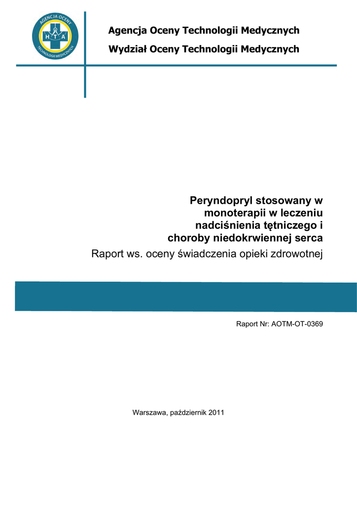 Agencja Oceny Technologii Medycznych Wydział Oceny Technologii Medycznych Peryndopryl stosowany w monoterapii w leczeniu nadciśnienia tętniczego i choroby niedokrwiennej serca Raport ws. oceny świadczenia opieki zdrowotnej Raport Nr: AOTM-OT-0369 Warszawa, październik 2011 Peryndopryl stosowany w monoterapii AOTM-OT-0369 w leczeniu nadciśnienia tętniczego i choroby niedokrwiennej serca W przygotowaniu oceny raportu ws. oceny świadczenia opieki zdrowotnej udział wzięli pracownicy Działu Raportów i Oceny Raportów Wydziału Oceny Technologii Medycznych AOTM : Osoby uczestniczące w pracach nad oceną świadczenia opieki zdrowotnej zadeklarowały brak konfliktu interesów. W toku prac występowano o opinię do następujących ekspertów klinicznych: Otrzymano opinie od ekspertów, których nazwiska są pogrubione. Do dnia zakończenia prac nad niniejszym opracowaniem nie otrzymano Deklaracji Konfliktu Interesów od żadnego z ekspertów. Zastosowane skróty: ACEI- inhibitory konwertazy angiotensyny (z ang. angiotensin-converting enzyme inhibitors) AMI/HYD- amiloryd w połączeniu z hydrochlorotiazydem ARB- bloker receptora angiotensyny (z ang. angiotensin receptor blockers) ASA- leki przeciwpłytkowe BP- ciśnienie krwi (z ang. blood pressure) CCB - bloker kanału wapniowego (z ang. calcium-channel blocker) CCS- Canadian Cardiovascular Society CHD- stabilna choroba wieńcowa (z ang. coronary heart disease) ChNS- stabilna choroba wieńcowa, stabilna dławica piersiowa (z ang. stable angina) CVD- choroba sercowo- naczyniowa (z ang. cardiovascular disease) Raport w sprawie oceny świadczenia opieki zdrowotnej 2/134 Peryndopryl stosowany w monoterapii AOTM-OT-0369 w leczeniu nadciśnienia tętniczego i choroby niedokrwiennej serca ENA- enalapryl ESC- The European Society of Cardiology ESH- European Society of Hypertension OZW- ostre zespoły wieńcowe PER- peryndopryl RAA- układ renina-angiotensyna-aldosteron Rozporządzenie – Rozporządzenie Ministra Zdrowia z dnia 22 grudnia 2009 r. w sprawie przygotowania raportu w sprawie oceny świadczenia opieki zdrowotnej i oceny raportu w sprawie oceny leku lub wyrobu medycznego (DZ.U. z 2009 r. nr 222 poz. 1773) Ustawa – Ustawa o zmianie ustawy o świadczeniach opieki zdrowotnej finansowanych ze środków publicznych oraz ustawy o cenach (Dz.U. z 2009 r. nr 118 poz. 989) Wytyczne – „Wytyczne oceny technologii medycznych” wprowadzone Zarządzeniem Prezesa AOTM nr 1/2010 z 4.01.2010 r., stanowiące podsumowanie uznawanych przez społeczność międzynarodową wymagań dotyczących przeprowadzania oceny świadczeń opieki zdrowotnej Raport w sprawie oceny świadczenia opieki zdrowotnej 3/134 Peryndopryl stosowany w monoterapii AOTM-OT-0369 w leczeniu nadciśnienia tętniczego i choroby niedokrwiennej serca Spis treści 1. Podstawowe informacje o wniosku ............................................................................................................ 6 2. Problem decyzyjny ................................................................................................................................... 10 2.1. Problem zdrowotny........................................................................................................................... 11 2.1.1. Skutki następstw choroby lub stanu zdrowia ...................................................................... 16 2.2. Opis świadczenia opieki zdrowotnej ................................................................................................ 18 2.2.1. Wpływ świadczenia na stan zdrowia obywateli ................................................................... 19 2.2.2. Opis świadczeń alternatywnych .......................................................................................... 19 2.2.3. Liczebność populacji wnioskowanej .................................................................................... 21 2.3. Interwencje wnioskowane i komparatory ......................................................................................... 23 2.3.1. Interwencje .......................................................................................................................... 23 2.3.1.1. Zagadnienia rejestracyjne ............................................................................................. 23 2.3.1.2. Wskazania zarejestrowane............................................................................................ 23 2.3.1.3. Wskazania, których dotyczy wniosek ............................................................................ 23 2.3.1.4. Wskazania, w których stosowanie technologii jest akceptowalne klinicznie ................. 24 2.3.1.5. Dotychczasowe postępowanie administracyjne w Polsce z technologią wnioskowaną 24 2.3.2. Komparatory ........................................................................................................................ 24 2.3.2.1. Interwencje stosowane obecnie w Polsce w danej chorobie, stanie zdrowia lub wskazaniu ............................................................................................................................ 26 2.3.2.2. Najtańsza interwencja stosowana w danej chorobie, stanie zdrowia lub wskazaniu w Polsce .................................................................................................................................. 26 2.3.2.3. Najskuteczniejsza interwencja stosowana w danej chorobie, stanie zdrowia lub wskazaniu w Polsce ............................................................................................................ 26 2.3.2.4. Interwencja rekomendowana w wytycznych postępowania klinicznego w danej chorobie, stanie zdrowia lub wskazaniu w Polsce .............................................................. 27 2.3.2.5. Interwencje podlegające wcześniej ocenie w Agencji, które wiążą się merytorycznie z dokonywaną oceną ............................................................................