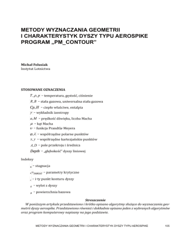 Metody wyznaczania geoMetrii i charakterystyk dyszy typu aerospike prograM „pM_contour” Michał Folusiak Instytut Lotnictwa StoSowane oznaczenia – temperatura, gęstość, ciśnienie – stała gazowa, uniwersalna stała gazowa – ciepło właściwe, entalpia – wykładnik izentropy – prędkość dźwięku, liczba Macha – kąt Macha – funkcja Prandtla-Meyera – współrzędne polarne punktów – współrzędne kartezjańskie punktów – pole przekroju i średnica – „głębokość” dyszy liniowej Indeksy – stagnacja – parametry krytyczne – i-ty punkt konturu dyszy – wylot z dyszy – powierzchnia bazowa Streszczenie W poniższym artykule przedstawiono i krótko opisano algorytmy służące do wyznaczania geometrii dyszy aerospike. Przedstawiono również i dokładnie opisano jeden z wybranych algorytmów oraz program komputerowy napisany na jego podstawie. Metody wyznaczania geoMetrii i charakterystyk dyszy typu aerospike 105 1. wStęp Program komputerowy „P-M contour” napisany został w międzyplatformowym, zintegrowanym środowisku programistycznym Lazarus (Cross platform IDE Lazarus) w języku programowania FreePascal[1][2]. Oprogramowanie, które posłużyło do stworzenia programu „P-M contour” jest niekomercyjnym, otwartym oprogramowaniem rozwijanym przez społeczność użytkowników. Program „P-M contour” skompilowany został na platformę Linux i Windows. 2. Metody wyznaczania konturów dySzy Geometria idealnej dyszy typu aerospike może być wyznaczona na dwa sposoby. Pierwszy z nich bazuje na metodzie Prandtla-Meyera, dlatego w ogólnym przypadku nie może być zastosowany dla dysz osiowosymetrycznych. Drugą metodą jest dobrze znana metoda charakterystyk. Metoda prandtla-Meyera Zastosowanie metody Prandtla-Meyera do wyznaczenia konturów dyszy aerospike zaproponowali niezależnie Angelino i Lee. Zakłada ona, że ekspansja Prandtla-Meyera w dyszy zachodzi wokół zewnętrznej krawędzi przekroju krytycznego (Rys. 1), a przepływ jest jednorodny. W przypadku liniowej dyszy aerospike, wachlarz fal rozrzedzeniowych kształtujących się wokół tego punktu(krawędzi) stanowi grupę prostych charakterystyk. Równania bilansowe wydatku masowego przepływu pozwalają określić na tych charakterystykach punkty opisujące kontur dyszy. Metoda opisana powyżej nadaje się do wyznaczania konturu dyszy płaskiej(liniowej), ale może zostać rozszerzona na przypadek osiowosymetryczny. Przybliżona metoda wyznaczania konturów osiowosymetrycznych dysz typu aerospike została opisana przez Angelino[3]. Zastosowanie tej metody jest oczywiście ograniczone poprzez założenie, że wyznaczane charakterystyki są liniami prostymi. Takiego przybliżenia nie można według autora stosować w przypadku: · dużego względnego skrócenia dyszy, niezależnie od liczby Macha w przekroju wylotowym; · dużych liczb Macha w przekroju wylotowym, niezależnie od względnego skrócenia dyszy. Metoda charakterystyk Druga z metod wyznaczania konturu dyszy opiera się na dobrze znanej metodzie charakterystyk. Jest ona właściwa zarówno dla dysz liniowych jak i osiowosymetrycznych. Metoda ta jest trudniejsza w implementacji od opisanej powyżej, ale jest również bardziej uniwersalna i nadaje się do obliczana bardziej wyrafinowanych przypadków w których przepływ w przekroju krytycznym nie jest jednorodny lub przypadków dysz w których zachodzi częściowe wewnętrzne rozprężanie. Szczegółowy opis metody i algorytmów postępowania przy wyznaczaniu konturów opisane zostały m.in. w [4]. 3. algorytM obliczeń Do dalszych rozważań wybrano metodę Prandtla-Meyera. Metoda ta posłuży do wyznaczania konturów i charakterystyk dysz liniowych i osiowosymetrycznych z użyciem zarówno idealnego jak i pół-idealnego modelu gazu. 106 prace instytutu Lotnictwa nr. 198 Model gazu Zastosowano model gazu wieloskładnikowego. Własności termodynamiczne składników gazu opisane są 9-współczynnikowymi funkcjami temperatury: gdzie: Współczynniki we wzorach określone są dla ponad 2000 substancji w przedziałach temperatur 200-1000, 1000-6000 i 6000-20000 K i podane w 9-współczynnikowym formacie danych termodynamicznych NASA (NASA thermo data file format) [5]. W zależności od wybranego modelu gazu, idealnego lub pół-idealnego, własności termodynamiczne przyjęte mogą być względem pewnej temperatury referencyjnej, lub jako funkcje temperatury. Przyjęcie liniowego przebiegu zmiany entalpii i stałej wartości ciepła właściwego obarczone jest dość dużym błędem[4], dlatego poleca się stosowanie modelu gazu pół-idealnego. Uogólnienie metody Prandtla-Meyera na dysze osiowosymetryczne[3] zostało również poszerzone o model gazu pół-idealnego przez autora tego artykułu. Funkcje termodynamiczne Zmiana entalpii względem entalpii spiętrzenia gazu wyraża się następującym wzorem: , stąd: Przy obliczeniach parametrów termodynamicznych wykorzystuje się następujące wzory: Wybrana metoda wymaga ponadto określenia wartości kąta Macha (µ) oraz funkcji PrandtlaMeyera. Funkcje te oblicza się na podstawie wzorów: , gdzie: Metody wyznaczania geoMetrii i charakterystyk dyszy typu aerospike 107 dane wejściowe Danymi wejściowymi do obliczeń geometrii dyszy aerospike są: · skład spalin i udział molowy składników (FROZEN); · T* – temperatura w przekroju krytycznym dyszy; · TE – temperatura w przekroju wylotowym dyszy; · p0 – ciśnienie w komorze spalania; · N – ilość punktów obliczeniowych na konturze dyszy; · TREF – temperatura referencyjna(w przypadku gazu idealnego); · A* – pole powierzchni przekroju krytycznego; Trzy pierwsze wartości można uzyskać z prostych obliczeń równowagi chemicznej, np. programem CEA[5]. Należy przy tym pamiętać, że opisana metoda zakłada niezmienność składu mieszaniny produktów spalania wzdłuż dyszy (FROZEN). inicjalizacja obliczeń Punktem wyjściowym do obliczeń jes