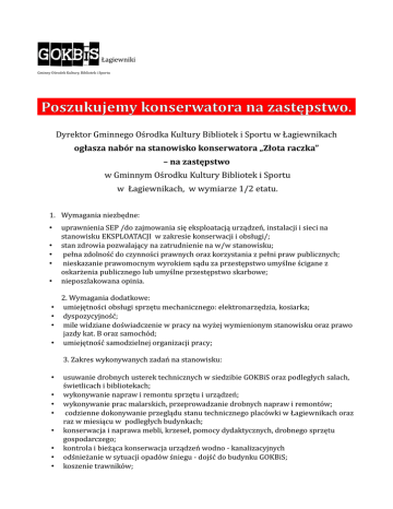 gokBiS Łagiewniki Gminny Ośrodek Kultury, Bibliotek i Sportu Poszukujemy konserwatora na zastępstwo. Dyrektor Gminnego Ośrodka Kultury Bibliotek i Sportu w Łagiewnikach ogłasza nabór na stanowisko konserwatora „Złota raczka” – na zastępstwo w Gminnym Ośrodku Kultury Bibliotek i Sportu w Łagiewnikach, w wymiarze 1/2 etatu. 1. Wymagania niezbędne: • • • • • • • • • uprawnienia SEP /do zajmowania się eksploatacją urządzeń, instalacji i sieci na stanowisku EKSPLOATACJI w zakresie konserwacji i obsługi/; stan zdrowia pozwalający na zatrudnienie na w/w stanowisku; pełna zdolność do czynności prawnych oraz korzystania z pełni praw publicznych; nieskazanie prawomocnym wyrokiem sądu za przestępstwo umyślne ścigane z oskarżenia publicznego lub umyślne przestępstwo skarbowe; nieposzlakowana opinia. 2. Wymagania dodatkowe: umiejętności obsługi sprzętu mechanicznego: elektronarzędzia, kosiarka; dyspozycyjność; mile widziane doświadczenie w pracy na wyżej wymienionym stanowisku oraz prawo jazdy kat. B oraz samochód; umiejętność samodzielnej organizacji pracy; 3. Zakres wykonywanych zadań na stanowisku: • • • • • • • • usuwanie drobnych usterek technicznych w siedzibie GOKBiS oraz podległych salach, świetlicach i bibliotekach; wykonywanie napraw i remontu sprzętu i urządzeń; wykonywanie prac malarskich, przeprowadzanie drobnych napraw i remontów; codzienne dokonywanie przeglądu stanu technicznego placówki w Łagiewnikach oraz raz w miesiącu w podległych budynkach; konserwacja i naprawa mebli, krzeseł, pomocy dydaktycznych, drobnego sprzętu gospodarczego; kontrola i bieżąca konserwacja urządzeń wodno - kanalizacyjnych odśnieżanie w sytuacji opadów śniegu - dojść do budynku GOKBiS; koszenie trawników; • • • • • • • • • • codzienny przegląd i naprawa instalacji sanitarnej; wykonywanie innych czynności zleconych przez dyrektora, wynikających z potrzeb GOKBiS. 4. Wymagane dokumenty: dokumenty niezbędne: kwestionariusz osobowy dla osoby ubiegającej się o zatrudnienie ; kopie dokumentów potwierdzających posiadane kwalifikacje i umiejętności, kopie świadectw pracy lub inne dokumenty potwierdzające staż pracy, oświadczenie o nieskazaniu prawomocnym wyrokiem sądu za przestępstwo umyślne ścigane z oskarżenia publicznego lub umyślne przestępstwo skarbowe, oświadczenie o posiadaniu pełnej zdolności do czynności prawnych oraz korzystaniu z pełni praw publicznych, oświadczenie potwierdzające stan zdrowia pozwalający na zatrudnienie na stanowisku konserwatora; dokumenty dodatkowe: CV; list motywacyjny; Wymagane dokumenty aplikacyjne należy składać osobiście lub przesłać pocztą na adres do dnia 06.02.2015 r. do godz. 16.00: Gminny Ośrodek Kultury Bibliotek i Sportu w Łagiewnikach ul. Wrocławska 1 58-210 Łagiewniki Wymagane dokumenty aplikacyjne: list motywacyjny, szczegółowe CV (z uwzględnieniem dokładnego przebiegu kariery zawodowej) powinny być opatrzone klauzulą: „Wyrażam zgodę na przetwarzanie moich danych osobowych zawartych w ofercie pracy dla potrzeb niezbędnych do realizacji procesu rekrutacji zgodnie z ustawą z dnia 29.08.1997 o ochronie danych osobowych (Dz. U. z 2002 r. Nr 101, poz. 926) oraz ustawą z dnia 21.11.2008 r. o pracownikach samorządowych (Dz. U. Nr 223, poz. 1458) ". Zastrzegamy sobie prawo kontaktowania się z wybranymi kandydatami . Oferta z dnia 30.01.2015 r.