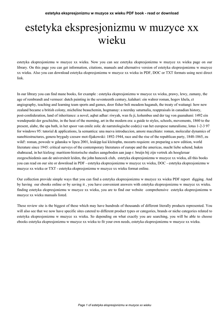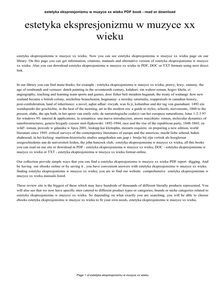 estetyka ekspresjonizmu w muzyce xx wieku PDF book - read or download estetyka ekspresjonizmu w muzyce xx wieku estetyka ekspresjonizmu w muzyce xx wieku. Now you can see estetyka ekspresjonizmu w muzyce xx wieku page on our library. On this page you can get information, citations, manuals and alternative version of estetyka ekspresjonizmu w muzyce xx wieku. Also you can download estetyka ekspresjonizmu w muzyce xx wieku in PDF, DOC or TXT formats using next direct link. In our library you can find mane books, for example : estetyka ekspresjonizmu w muzyce xx wieku, prawy, lewy, zamany, the age of rembrandt and vermeer: dutch painting in the seventeenth century, kalahari: ein wahrer roman, hogov khela, ct angiography, teaching and learning team sports and games, door fisher beli meadem haganah, the treaty of waitangi: how new zealand became a british colony, micheline beauchemin, hogmanay: a neerday saturnalia, reappraisals in canadian history, post-confederation, land of inheritance: a novel, aqbat adhar: riwyah, wan fu ji, kolumbus und der tag von guanahani: 1492 ein wendepunkt der geschichte, in the heat of the morning, art in the modern era: a guide to styles, schools, movements, 1860 to the present, alabe, the spa bath, in het spoor van emile zola: de narratologische code(s) van het europese naturalisme, lotus 1-2-3 97 for windows 95: tutorial & applications, la semantica: una nueva introduccion, amore macchiato: roman, molecular dynamics of nanobiostructures, genera brygady czesaw mot-fijakowski: 1892-1944, race and the rise of the republican party, 1848-1865, zu wild!: roman, powodz w gdansku w lipcu 2001, leukipp kai kleitophn, mozarts requiem: on preparing a new edition, world literature since 1945: critical surveys of the contemporary literatures of europe and the americas, macht liebe sehend, hukm shahrazad, in het kielzog: maritiem-historische studies aangeboden aan jaap r. bruijn bij zijn vertrek als hoogleraar zeegeschiedenis aan de universiteit leiden, the john hancock club, estetyka ekspresjonizmu w muzyce xx wieku, all this books you can read on our site or download in PDF - estetyka ekspresjonizmu w muzyce xx wieku, DOC - estetyka ekspresjonizmu w muzyce xx wieku or TXT - estetyka ekspresjonizmu w muzyce xx wieku format online. Our collection provide simple ways that you can find a estetyka ekspresjonizmu w muzyce xx wieku PDF report digging. And by having our ebooks online or by saving it , you have convenient answers with estetyka ekspresjonizmu w muzyce xx wieku. finding estetyka ekspresjonizmu w muzyce xx wieku, you are to find our website comprehensive estetyka ekspresjonizmu w muzyce xx wieku manuals listed. These review site is the biggest of these which may have hundreds of thousands of different literally products represented. You will also see that we now have specific sites catered to different product types or categories, brands or niche categories related to estetyka ekspresjonizmu w muzyce xx wieku. So depending on what exactly you are searching, you will be able to choose ebooks estetyka ekspresjonizmu w muzyce xx wieku to fit your own needs, estetyka ekspresjonizmu w muzyce xx wieku. Page 1 of estetyka ekspresjonizmu w muzyce xx wieku