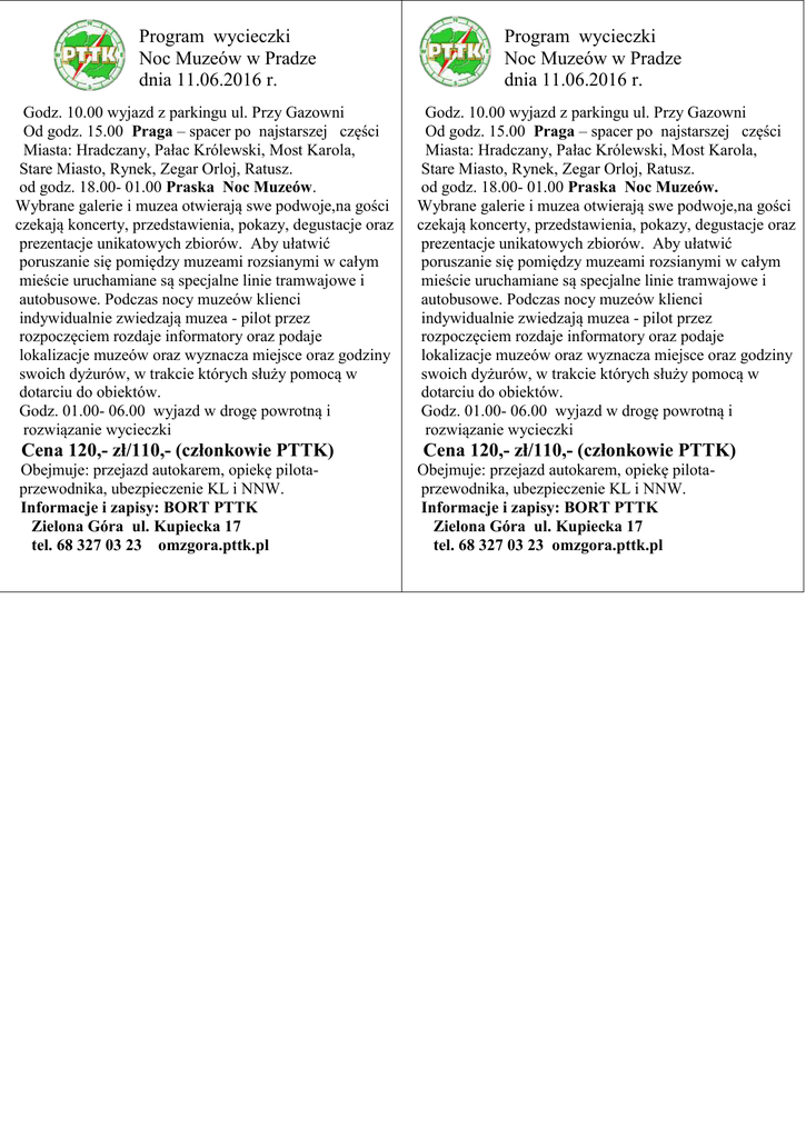Program wycieczki Noc Muzeów w Pradze dnia 11.06.2016 r. Godz. 10.00 wyjazd z parkingu ul. Przy Gazowni Od godz. 15.00 Praga – spacer po najstarszej części Miasta: Hradczany, Pałac Królewski, Most Karola, Stare Miasto, Rynek, Zegar Orloj, Ratusz. od godz. 18.00- 01.00 Praska Noc Muzeów. Wybrane galerie i muzea otwierają swe podwoje,na gości czekają koncerty, przedstawienia, pokazy, degustacje oraz prezentacje unikatowych zbiorów. Aby ułatwić poruszanie się pomiędzy muzeami rozsianymi w całym mieście uruchamiane są specjalne linie tramwajowe i autobusowe. Podczas nocy muzeów klienci indywidualnie zwiedzają muzea - pilot przez rozpoczęciem rozdaje informatory oraz podaje lokalizacje muzeów oraz wyznacza miejsce oraz godziny swoich dyżurów, w trakcie których służy pomocą w dotarciu do obiektów. Godz. 01.00- 06.00 wyjazd w drogę powrotną i rozwiązanie wycieczki Cena 120,- zł/110,- (członkowie PTTK) Obejmuje: przejazd autokarem, opiekę pilotaprzewodnika, ubezpieczenie KL i NNW. Informacje i zapisy: BORT PTTK Zielona Góra ul. Kupiecka 17 tel. 68 327 03 23 omzgora.pttk.pl Program wycieczki Noc Muzeów w Pradze dnia 11.06.2016 r. Godz. 10.00 wyjazd z parkingu ul. Przy Gazowni Od godz. 15.00 Praga – spacer po najstarszej części Miasta: Hradczany, Pałac Królewski, Most Karola, Stare Miasto, Rynek, Zegar Orloj, Ratusz. od godz. 18.00- 01.00 Praska Noc Muzeów. Wybrane galerie i muzea otwierają swe podwoje,na gości czekają koncerty, przedstawienia, pokazy, degustacje oraz prezentacje unikatowych zbiorów. Aby ułatwić poruszanie się pomiędzy muzeami rozsianymi w całym mieście uruchamiane są specjalne linie tramwajowe i autobusowe. Podczas nocy muzeów klienci indywidualnie zwiedzają muzea - pilot przez rozpoczęciem rozdaje informatory oraz podaje lokalizacje muzeów oraz wyznacza miejsce oraz godziny swoich dyżurów, w trakcie których służy pomocą w dotarciu do obiektów. Godz. 01.00- 06.00 wyjazd w drogę powrotną i rozwiązanie wycieczki Cena 120,- zł/110,- (członkowie PTTK) Obejmuje: przejazd autokarem, opiekę pilotaprzewodnika, ubezpieczenie KL i NNW. Informacje i zapisy: BORT PTTK Zielona Góra ul. Kupiecka 17 tel. 68 327 03 23 omzgora.pttk.pl