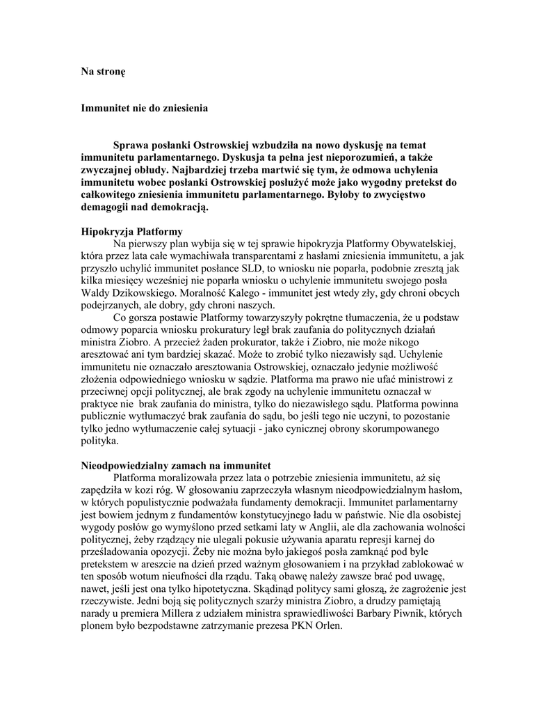 Na stronę Immunitet nie do zniesienia Sprawa posłanki Ostrowskiej wzbudziła na nowo dyskusję na temat immunitetu parlamentarnego. Dyskusja ta pełna jest nieporozumień, a także zwyczajnej obłudy. Najbardziej trzeba martwić się tym, że odmowa uchylenia immunitetu wobec posłanki Ostrowskiej posłużyć może jako wygodny pretekst do całkowitego zniesienia immunitetu parlamentarnego. Byłoby to zwycięstwo demagogii nad demokracją. Hipokryzja Platformy Na pierwszy plan wybija się w tej sprawie hipokryzja Platformy Obywatelskiej, która przez lata całe wymachiwała transparentami z hasłami zniesienia immunitetu, a jak przyszło uchylić immunitet posłance SLD, to wniosku nie poparła, podobnie zresztą jak kilka miesięcy wcześniej nie poparła wniosku o uchylenie immunitetu swojego posła Waldy Dzikowskiego. Moralność Kalego - immunitet jest wtedy zły, gdy chroni obcych podejrzanych, ale dobry, gdy chroni naszych. Co gorsza postawie Platformy towarzyszyły pokrętne tłumaczenia, że u podstaw odmowy poparcia wniosku prokuratury legł brak zaufania do politycznych działań ministra Ziobro. A przecież żaden prokurator, także i Ziobro, nie może nikogo aresztować ani tym bardziej skazać. Może to zrobić tylko niezawisły sąd. Uchylenie immunitetu nie oznaczało aresztowania Ostrowskiej, oznaczało jedynie możliwość złożenia odpowiedniego wniosku w sądzie. Platforma ma prawo nie ufać ministrowi z przeciwnej opcji politycznej, ale brak zgody na uchylenie immunitetu oznaczał w praktyce nie brak zaufania do ministra, tylko do niezawisłego sądu. Platforma powinna publicznie wytłumaczyć brak zaufania do sądu, bo jeśli tego nie uczyni, to pozostanie tylko jedno wytłumaczenie całej sytuacji - jako cynicznej obrony skorumpowanego polityka. Nieodpowiedzialny zamach na immunitet Platforma moralizowała przez lata o potrzebie zniesienia immunitetu, aż się zapędziła w kozi róg. W głosowaniu zaprzeczyła własnym nieodpowiedzialnym hasłom, w których populistycznie podważała fundamenty demokracji. Immunitet parlamentarny jest bowiem jednym z fundamentów konstytucyjnego ładu w państwie. Nie dla osobistej wygody posłów go wymyślono przed setkami laty w Anglii, ale dla zachowania wolności politycznej, żeby rządzący nie ulegali pokusie używania aparatu represji karnej do prześladowania opozycji. Żeby nie można było jakiegoś posła zamknąć pod byle pretekstem w areszcie na dzień przed ważnym głosowaniem i na przykład zablokować w ten sposób wotum nieufności dla rządu. Taką obawę należy zawsze brać pod uwagę, nawet, jeśli jest ona tylko hipotetyczna. Skądinąd politycy sami głoszą, że zagrożenie jest rzeczywiste. Jedni boją się politycznych szarży ministra Ziobro, a drudzy pamiętają narady u premiera Millera z udziałem ministra sprawiedliwości Barbary Piwnik, których plonem było bezpodstawne zatrzymanie prezesa PKN Orlen. Żaden odpowiedzialny polityk nie powinien dążyć do zniesienia immunitetu parlamentarnego. Także politykom Prawa i Sprawiedliwości to doradzam, żeby sami potem nie żałowali, chyba, że zamierzają sprawować swoją władzę wiecznie. Nie do przyjęcia jest też pomysł, żeby zachować immunitet ograniczony tylko do działalności parlamentarnej posła czy senatora. To rozróżnienie przecież już jest w konstytucji, mamy immunitet materialny, dotyczący spraw związanych z wykonywaniem mandatu, które są bezwzględnie wyłączone z jakiejkolwiek odpowiedzialności karnej. Poseł nie może nigdy odpowiadać na przykład za sposób swojego głosowania. Rzecz idzie o immunitet formalny, który dotyczy wszelkich innych przestępstw i który może być zawsze uchylony Immunitet to nie parawan Przez możliwość uchylenia immunitet w rzeczywistości nie jest żadnym parawanem chroniącym przed odpowiedzialnością karną. Przekonało się o tym już kilku posłów i senatorów, którym te immunitety uchylono, ze słynnym posłem Pęczakiem na czele. To powinna być niepisana zasada – zawsze, ilekroć chodzi o sprawę kryminalną, immunitet powinien być uchylony, chyba że w grę wchodzi obawa szykany politycznej. W przypadku posłanki Ostrowskiej nie ma podstaw do takiej obawy i dlatego immunitet powinien być uchylony, i to jednogłośnie. Nie powinna pozostać za parawanem nieodpowiedzialności i bezkarności. Być może sama zechce zza tego parawanu wyjść, dobrowolnie zrzekając się immunitetu. W obecnych realiach politycznych coraz trudniej jest jednak liczyć, że zdoła się utrwalić zasada automatycznego uchylania immunitetu w sprawach kryminalnych, nie mających cech represji politycznej. Bardziej prawdopodobna jest inna zasada – atakujemy przeciwników, a bronimy swoich. Uchylamy immunitety obcym, nie uchylamy naszym. Obawiam się, że to już wchodzi wszystkim w polityczną krew. A może Trybunał Konstytucyjny W takim razie może to nie Sejm powinien decydować o immunitecie zasiadających w nim posłów? W Sejmie o wszystkim rozstrzyga wszechobecna polityka, więc może trzeba szukać takiego sposobu rozstrzygania, który będzie wolny od politycznych rozgrywek. Może przekazać to Trybunałowi Konstytucyjnemu, który by decydował, czy w konkretnej sprawie uchylenie immunitetu powinno mieć miejsce. Trybunał mógłby obiektywnie oceniać, czy zarzuty wobec posła nie są elementem politycznej szykany. Wtedy nikt nie miałby podstaw do zarzutu, że oto posłowie bronią swojego kolegę przed sprawiedliwością. Oczywiście do tego niezbędna byłaby zmiana konstytucji. Proponuję zacząć myślenie w kierunku takiej właśnie zmiany – kto ma rozstrzygać o uchyleniu immunitetu, w taki sposób, żeby to była rzeczywista gwarancja demokracji, a nie przywilej bezkarności dla parlamentarzystów. Gorąco natomiast namawiam do porzucenia niebezpiecznych pomysłów całkowitego zniesienia immunitetu, bo wszyscy wpadniemy we własne sidła, tak jak wpadła Platforma Obywate