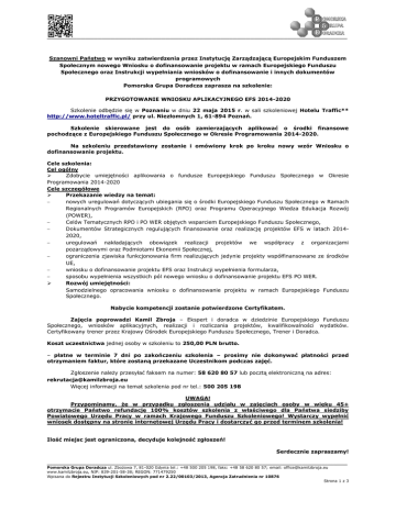 _______________________________________________________________________ Szanowni Państwo w wyniku zatwierdzenia przez Instytucję Zarządzającą Europejskim Funduszem Społecznym nowego Wniosku o dofinansowanie projektu w ramach Europejskiego Funduszu Społecznego oraz Instrukcji wypełniania wniosków o dofinansowanie i innych dokumentów programowych Pomorska Grupa Doradcza zaprasza na szkolenie: PRZYGOTOWANIE WNIOSKU APLIKACYJNEGO EFS 2014-2020 Szkolenie odbędzie się w Poznaniu w dniu 22 maja 2015 r. w sali szkoleniowej Hotelu Traffic** http://www.hoteltraffic.pl/ przy ul. Niezłomnych 1, 61-894 Poznań. Szkolenie skierowane jest do osób zamierzających aplikować o środki finansowe pochodzące z Europejskiego Funduszu Społecznego w Okresie Programowania 2014-2020. Na szkoleniu przedstawiony zostanie i omówiony krok po kroku nowy wzór Wniosku o dofinansowanie projektu. Cele szkolenia: Cel ogólny Zdobycie umiejętności aplikowania o fundusze Europejskiego Funduszu Społecznego w Okresie Programowania 2014-2020 Cele szczegółowe Przekazanie wiedzy na temat: nowych uregulowań dotyczących ubiegania się o środki Europejskiego Funduszu Społecznego w Ramach Regionalnych Programów Europejskich (RPO) oraz Programu Operacyjnego Wiedza Edukacja Rozwój (POWER), Celów Tematycznych RPO i PO WER objętych wsparciem Europejskiego Funduszu Społecznego, Dokumentów Strategicznych regulujących finansowanie oraz realizację projektów EFS w latach 20142020, uregulowań nakładających obowiązek realizacji projektów we współpracy z organizacjami pozarządowymi oraz Podmiotami Ekonomii Społecznej, ograniczenia zjawiska funkcjonowania firm realizujących jedynie projekty współfinansowane ze środków UE, wniosku o dofinansowanie projektu EFS oraz Instrukcji wypełnienia formularza, sposobu wypełnienia wszystkich pól nowego wniosku o dofinansowanie projektu EFS PO WER. Rozwój umiejętności: Samodzielnego opracowania wniosku o dofinansowanie projektu w ramach Europejskiego Funduszu Społecznego. Nabycie kompetencji zostanie potwierdzone Certyfikatem. Zajęcia poprowadzi Kamil Zbroja – Ekspert i doradca w dziedzinie Europejskiego Funduszu Społecznego, wniosków aplikacyjnych, realizacji i rozliczania projektów, kwalifikowalności wydatków. Certyfikowany trener przez Krajowy Ośrodek Europejskiego Funduszu Społecznego, Trener i Doradca. Koszt uczestnictwa jednej osoby w szkoleniu to 250,00 PLN brutto. – płatne w terminie 7 dni po zakończeniu szkolenia – prosimy nie dokonywać płatności przed otrzymaniem faktur, które zostaną przekazane Uczestnikom podczas zajęć. Zgłoszenie należy przesyłać faksem na numer: 58 620 80 57 lub pocztą elektroniczną na adres: [email protected] Więcej informacji na temat szkolenia pod nr tel.: 500 205 198 UWAGA! Przypominamy, że w przypadku zgłoszenia udziału w zajęciach osoby w wieku 45+ otrzymacie Państwo refundację 100% kosztów szkolenia z właściwego dla Państwa siedziby Powiatowego Urzędu Pracy w ramach Krajowego Funduszu Szkoleniowego! Wystarczy wypełnić wniosek dostępny na stronie internetowej Urzędu Pracy i dostarczyć go przed terminem szkolenia! Ilość miejsc jest ograniczona, decyduje kolejność zgłoszeń! Serdecznie zapraszamy! __________________________________________________________________________________________________________ Pomorska Grupa Doradcza ul. Zbożowa 7, 81-020 Gdynia tel.: +48 500 205 198, faks: +48 58 620 80 57; email: [email protected] www.kamilzbroja.eu, NIP: 839-201-58-38; REGON: 771479250 Wpisana do Rejestru Instytucji Szkoleniowych pod nr 2.22/00103/2013, Agencja Zatrudnienia nr 10876 Strona 1 z 3 _______________________________________________________________________ PROGRAM SZKOLENIA PRZYGOTOWANIE WNIOSKU APLIKACYJNEGO EFS 2014 -2020 Trener: Kamil Zbroja Dzień I Godzina 9.00 – 10.30 10.30 – 10.45 10.45 – 12.15 12.15 – 12.45 Temat Okres Programowania Europejskiego Funduszu Społecznego w Polsce 2014-2020 – wprowadzenie. Omówienie 8, 9, 10 i 11 Celu Tematycznego RPO i PO WER Obowiązek wniesienia wkładu własnego w projektach EFS w latach 2014-2020. Ograniczenie realizacji projektów przez podmioty niezwiązane z obszarem interwencji. Ograniczenie zjawiska funkcjonowania firm realizujących jedynie projekty współfinansowane ze środków UE. Deinstytucjonalizacja usług w dokumentach programowych jako podstawa realizacji projektów z Celów tematycznych 8 i 9. Definicja Podmiotu Ekonomii Społecznej. Uregulowania stawiające w wyjątkowo uprzywilejowanej sytuacji finansowej Podmioty Ekonomii Społecznej oraz NGO nienależące do tej grupy, Bezwzględny obowiązek zlecania przez beneficjentów należących do sektora publicznego zadań publicznych związanych z realizacja projektów organizacjom pozarządowym w trybie otwartych konkursów ofert. Obowiązek współpracy beneficjentów realizujących projekty w zakresie Celu Tematycznego 10 z przedsiębiorcami. Przerwa na kawę Wytyczne w zakresie kwalifikowania wydatków w ramach Europejskiego Funduszu Społecznego oraz Krajowe wytyczne dotyczące kwalifikowalności wydatków w ramach Europejskiego Funduszu Rozwoju Regionalnego, Europejskiego Funduszu Społecznego oraz Funduszu Spójności w okresie programowania 2014-2020: personel projektu w latach 2014-2020 (umowy cywilnoprawne, limit 276 godzin, centralna, elektroniczna baza personelu projektu agregująca ewidencje przepracowanych godzin i zadań), wkład własny niefinansowy, udzielanie zamówień o wartości przekraczającej 50 tys. zł., koszty zarządzania jako koszty pośrednie w projektach EFS 2014-2020, Nowy wniosek o dofinansowanie projektu w ramach PO WER krok po kroku: obligatoryjne wskaźniki realizacji celu, wskaźniki realizacji celu CREAM wartość bazowa w kontekście doświadczenia wnioskodawcy, zapisy wykluczające realizację projektów przez podmioty nieobecne wcześniej na obszarze realizacji przedsięwzięcia, kryterium formalne wykluczaj