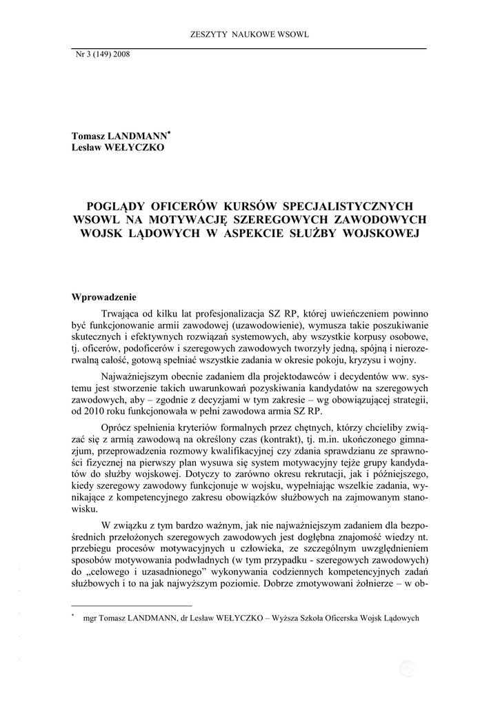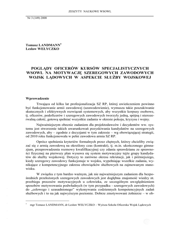 ZESZYTY NAUKOWE WSOWL Nr 3 (149) 2008 ISSN 1731-8157 Tomasz LANDMANN Lesław WEŁYCZKO POGLĄDY OFICERÓW KURSÓW SPECJALISTYCZNYCH WSOWL NA MOTYWACJĘ SZEREGOWYCH ZAWODOWYCH WOJSK LĄDOWYCH W ASPEKCIE SŁUŻBY WOJSKOWEJ Wprowadzenie Trwająca od kilku lat profesjonalizacja SZ RP, której uwieńczeniem powinno być funkcjonowanie armii zawodowej (uzawodowienie), wymusza takie poszukiwanie skutecznych i efektywnych rozwiązań systemowych, aby wszystkie korpusy osobowe, tj. oficerów, podoficerów i szeregowych zawodowych tworzyły jedną, spójną i nierozerwalną całość, gotową spełniać wszystkie zadania w okresie pokoju, kryzysu i wojny. Najważniejszym obecnie zadaniem dla projektodawców i decydentów ww. systemu jest stworzenie takich uwarunkowań pozyskiwania kandydatów na szeregowych zawodowych, aby – zgodnie z decyzjami w tym zakresie – wg obowiązującej strategii, od 2010 roku funkcjonowała w pełni zawodowa armia SZ RP. W związku z tym bardzo ważnym, jak nie najważniejszym zadaniem dla bezpośrednich przełożonych szeregowych zawodowych jest dogłębna znajomość wiedzy nt. przebiegu procesów motywacyjnych u człowieka, ze szczególnym uwzględnieniem sposobów motywowania podwładnych (w tym przypadku - szeregowych zawodowych) do „celowego i uzasadnionego” wykonywania codziennych kompetencyjnych zadań służbowych i to na jak najwyższym poziomie. Dobrze zmotywowani żołnierze – w ob- - - - - - Oprócz spełnienia kryteriów formalnych przez chętnych, którzy chcieliby związać się z armią zawodową na określony czas (kontrakt), tj. m.in. ukończonego gimnazjum, przeprowadzenia rozmowy kwalifikacyjnej czy zdania sprawdzianu ze sprawności fizycznej na pierwszy plan wysuwa się system motywacyjny tejże grupy kandydatów do służby wojskowej. Dotyczy to zarówno okresu rekrutacji, jak i późniejszego, kiedy szeregowy zawodowy funkcjonuje w wojsku, wypełniając wszelkie zadania, wynikające z kompetencyjnego zakresu obowiązków służbowych na zajmowanym stanowisku. mgr Tomasz LANDMANN, dr Lesław WEŁYCZKO – Wyższa Szkoła Oficerska Wojsk Lądowych POGLĄDY OFICERÓW KURSÓW SPECJALISTYCZNYCH WSOWL NA MOTYWACJĘ... szarze swojej działalności zadaniowej na zajmowanym stanowisku służbowym - w każdym przypadku są lepszymi żołnierzami pod każdym względem, zawsze widzą racjonalny cel wykonywanych czynności. Ma to ogromny wpływ na ich zdrowie psychiczne, osobiste cele i aspiracje, stabilizację zawodową, tym samym i życiową. Żołnierze, gdy widzą cel swojego codziennego trudu, lepiej podchodzą do wykonywania wszelkich zadań, a co ważniejsze, skutkuje to efektywnością całego pododdziału i nie tylko. System motywacyjny jest tym składnikiem osobowości, który (zdaniem wielu teoretyków i praktyków) wraz z charakterem jest kształtowany niemal przez całe życie u każdego człowieka. Oczywiście ww. czynniki są powiązane ze „stałymi” elementami osobowości – tj. inteligencją i całym zespołem czynników temperamentnych, wpływających na „kształtowanie się osobowości” i jej „podatność” na zmianę stylu i jakości postępowania, myślenia, funkcjonowania, rozumienia otaczającej rzeczywistości, ale także wykonywania codziennych zadań na określonym poziomie – w zależności od ukazywanych motywów (przesłanek), które ku temu prowadzą. Obecnie najważniejszym zadaniem wszystkich, którzy kierują (przewodzą, dowodzą) ludźmi (zarządzają zasobami ludzkimi) jest to, aby w określony sposób motywowali, pobudzali, tym samym aktywizowali ich do bardziej wytężonej pracy, nacechowanej często kreatywnością, a co ważniejsze – przynoszącej uzasadnioną satysfakcję i zadowolenie z uzyskanych końcowych efektów. Trudno zatem wyobrazić sobie dziś w wojsku żołnierzy – w tym przypadku szeregowych zawodowych – którzy nie posiadają takich motywów swojego postępowania, mogących w pełni zagwarantować sprawne funkcjonowanie struktur organizacyjnych wojska, w których na co dzień wykonują określoną pracę – służą - utożsamiając się z jej nadrzędnymi celami, dla których została ona powołana. O powyższe problemy zapytano 85 oficerów młodszych, będących na kursach specjalistycznych w WSOWL - pomiędzy styczniem a kwietniem 2008 r. (tj. 88,5% z ogółu 96 słuchaczy będących w tym czasie słuchaczami), z których: 20 osób (tj. 24,1%) dowodziło lub dowodzi aktualnie szeregowymi w strukturze 9 – miesięcznego cyklu szkolenia; - - - - - Autorzy niniejszego artykułu chcąc określić, jakie są rzeczywiste motywy i zaangażowanie szeregowych zasadniczej służby wojskowej (ZSW) i szeregowych zawodowych w codziennej służbie i pracy, ich zaangażowanie w zadania, jakie wykonują na co dzień na zajmowanym stanowisku - poprosili o wyrażenie w tym zakresie opinii przez grupę oficerów, którzy w miesiącach styczeń – kwiecień 2008 r. uczestniczyli w przeszkoleniu specjalistycznym na kursach młodszych oficerów w WSOWL. Zamierzano także uzyskać odpowiedź na nurtujące pytania – w aspekcie pełnej profesjonalizacji naszej armii i przejścia na system armii zawodowej – dotyczące różnicy w systemie motywacyjnym, zaangażowaniu, dyscyplinie, podejściu do szkolenia - pomiędzy szeregowymi, którzy są szkoleni w systemie 9 – miesięcznym (ZSW) oraz w systemie 18 – miesięcznym – jako szeregowi zawodowi. Ponadto zamierzono dociec, jakie są opinie o szeregowych ZSW i szeregowych zawodowych wyrażone przez dowódców najniższych szczebli dowodzenia (kompania, pluton) – w zakresie ich skuteczności zadaniowo-zawodowej na zajmowanym stanowisku. 131 Tomasz LANDMANN, Lesław WEŁYCZKO 15 osób (tj. 18,1%) dowodziło lub dowodzi aktualnie szeregowymi w strukturze 18 – miesięcznego cyklu szkolenia; 38 osób (tj. 45,75%) dowodziło lub dowodzi aktualnie zarówno szeregowymi zawodowymi w strukturze 9 – miesięcznego, jak i 18 – miesięcznego cykl