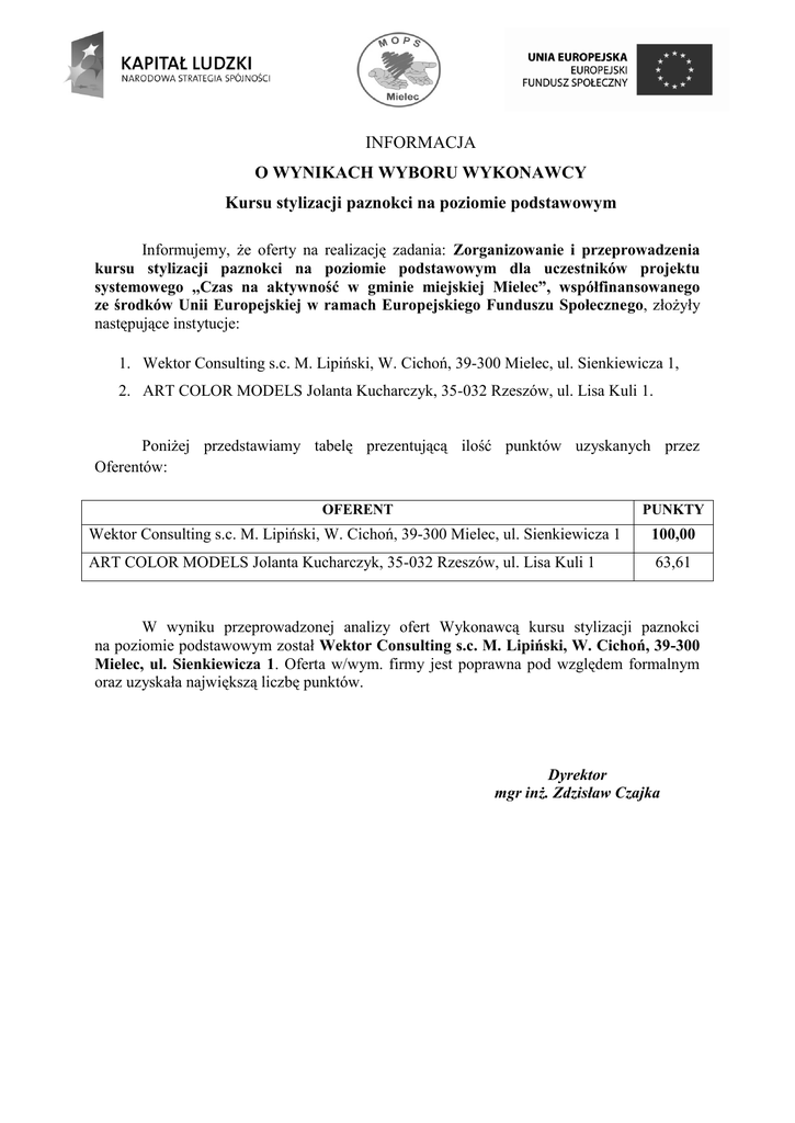 INFORMACJA O WYNIKACH WYBORU WYKONAWCY Kursu stylizacji paznokci na poziomie podstawowym Informujemy, że oferty na realizację zadania: Zorganizowanie i przeprowadzenia kursu stylizacji paznokci na poziomie podstawowym dla uczestników projektu systemowego ,,Czas na aktywność w gminie miejskiej Mielec”, współfinansowanego ze środków Unii Europejskiej w ramach Europejskiego Funduszu Społecznego, złożyły następujące instytucje: 1. Wektor Consulting s.c. M. Lipiński, W. Cichoń, 39-300 Mielec, ul. Sienkiewicza 1, 2. ART COLOR MODELS Jolanta Kucharczyk, 35-032 Rzeszów, ul. Lisa Kuli 1. Poniżej przedstawiamy tabelę prezentującą ilość punktów uzyskanych przez Oferentów: OFERENT PUNKTY Wektor Consulting s.c. M. Lipiński, W. Cichoń, 39-300 Mielec, ul. Sienkiewicza 1 100,00 ART COLOR MODELS Jolanta Kucharczyk, 35-032 Rzeszów, ul. Lisa Kuli 1 63,61 W wyniku przeprowadzonej analizy ofert Wykonawcą kursu stylizacji paznokci na poziomie podstawowym został Wektor Consulting s.c. M. Lipiński, W. Cichoń, 39-300 Mielec, ul. Sienkiewicza 1. Oferta w/wym. firmy jest poprawna pod względem formalnym oraz uzyskała największą liczbę punktów. Dyrektor mgr inż. Zdzisław Czajka