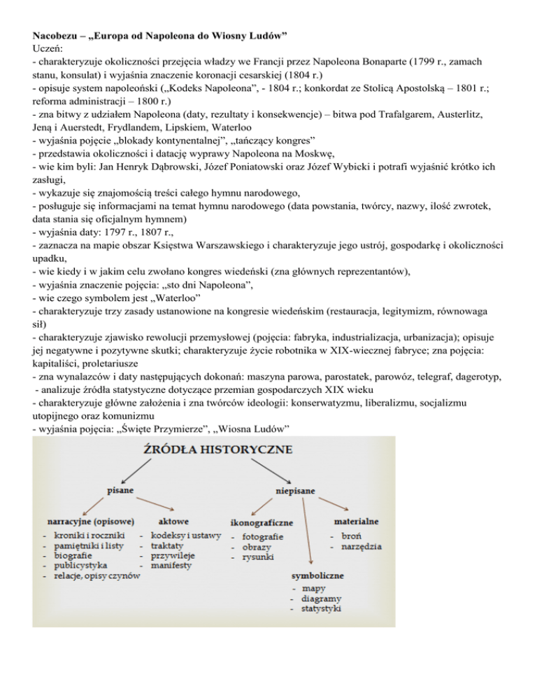 Nacobezu – „Europa od Napoleona do Wiosny Ludów” Uczeń: - charakteryzuje okoliczności przejęcia władzy we Francji przez Napoleona Bonaparte (1799 r., zamach stanu, konsulat) i wyjaśnia znaczenie koronacji cesarskiej (1804 r.) - opisuje system napoleoński („Kodeks Napoleona”, - 1804 r.; konkordat ze Stolicą Apostolską – 1801 r.; reforma administracji – 1800 r.) - zna bitwy z udziałem Napoleona (daty, rezultaty i konsekwencje) – bitwa pod Trafalgarem, Austerlitz, Jeną i Auerstedt, Frydlandem, Lipskiem, Waterloo - wyjaśnia pojęcie „blokady kontynentalnej”, „tańczący kongres” - przedstawia okoliczności i datację wyprawy Napoleona na Moskwę, - wie kim byli: Jan Henryk Dąbrowski, Józef Poniatowski oraz Józef Wybicki i potrafi wyjaśnić krótko ich zasługi, - wykazuje się znajomością treści całego hymnu narodowego, - posługuje się informacjami na temat hymnu narodowego (data powstania, twórcy, nazwy, ilość zwrotek, data stania się oficjalnym hymnem) - wyjaśnia daty: 1797 r., 1807 r., - zaznacza na mapie obszar Księstwa Warszawskiego i charakteryzuje jego ustrój, gospodarkę i okoliczności upadku, - wie kiedy i w jakim celu zwołano kongres wiedeński (zna głównych reprezentantów), - wyjaśnia znaczenie pojęcia: „sto dni Napoleona”, - wie czego symbolem jest „Waterloo” - charakteryzuje trzy zasady ustanowione na kongresie wiedeńskim (restauracja, legitymizm, równowaga sił) - charakteryzuje zjawisko rewolucji przemysłowej (pojęcia: fabryka, industrializacja, urbanizacja); opisuje jej negatywne i pozytywne skutki; charakteryzuje życie robotnika w XIX-wiecznej fabryce; zna pojęcia: kapitaliści, proletariusze - zna wynalazców i daty następujących dokonań: maszyna parowa, parostatek, parowóz, telegraf, dagerotyp, - analizuje źródła statystyczne dotyczące przemian gospodarczych XIX wieku - charakteryzuje główne założenia i zna twórców ideologii: konserwatyzmu, liberalizmu, socjalizmu utopijnego oraz komunizmu - wyjaśnia pojęcia: „Święte Przymierze”, „Wiosna Ludów”
