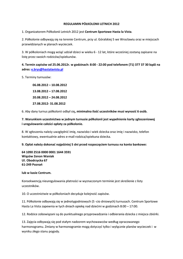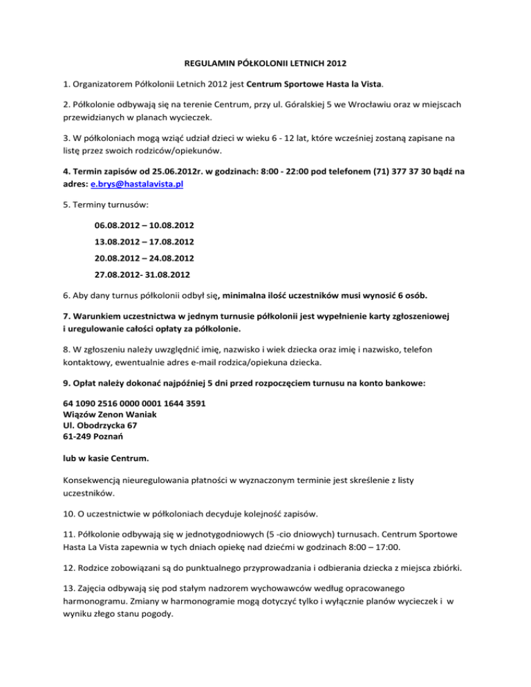 REGULAMIN PÓŁKOLONII LETNICH 2012 1. Organizatorem Półkolonii Letnich 2012 jest Centrum Sportowe Hasta la Vista. 2. Półkolonie odbywają się na terenie Centrum, przy ul. Góralskiej 5 we Wrocławiu oraz w miejscach przewidzianych w planach wycieczek. 3. W półkoloniach mogą wziąć udział dzieci w wieku 6 - 12 lat, które wcześniej zostaną zapisane na listę przez swoich rodziców/opiekunów. 4. Termin zapisów od 25.06.2012r. w godzinach: 8:00 - 22:00 pod telefonem (71) 377 37 30 bądź na adres: [email protected] 5. Terminy turnusów: 06.08.2012 – 10.08.2012 13.08.2012 – 17.08.2012 20.08.2012 – 24.08.2012 27.08.2012- 31.08.2012 6. Aby dany turnus półkolonii odbył się, minimalna ilość uczestników musi wynosić 6 osób. 7. Warunkiem uczestnictwa w jednym turnusie półkolonii jest wypełnienie karty zgłoszeniowej i uregulowanie całości opłaty za półkolonie. 8. W zgłoszeniu należy uwzględnić imię, nazwisko i wiek dziecka oraz imię i nazwisko, telefon kontaktowy, ewentualnie adres e-mail rodzica/opiekuna dziecka. 9. Opłat należy dokonać najpóźniej 5 dni przed rozpoczęciem turnusu na konto bankowe: 64 1090 2516 0000 0001 1644 3591 Wiązów Zenon Waniak Ul. Obodrzycka 67 61-249 Poznań lub w kasie Centrum. Konsekwencją nieuregulowania płatności w wyznaczonym terminie jest skreślenie z listy uczestników. 10. O uczestnictwie w półkoloniach decyduje kolejność zapisów. 11. Półkolonie odbywają się w jednotygodniowych (5 -cio dniowych) turnusach. Centrum Sportowe Hasta La Vista zapewnia w tych dniach opiekę nad dziećmi w godzinach 8:00 – 17:00. 12. Rodzice zobowiązani są do punktualnego przyprowadzania i odbierania dziecka z miejsca zbiórki. 13. Zajęcia odbywają się pod stałym nadzorem wychowawców według opracowanego harmonogramu. Zmiany w harmonogramie mogą dotyczyć tylko i wyłącznie planów wycieczek i w wyniku złego stanu pogody. 14. Organizatorzy nie odpowiadają za rzeczy zagubione przez uczestników podczas półkolonii oraz za zniszczenia rzeczy należących do dzieci, a dokonanych przez innych uczestników. 15. Zachęcamy do tego, aby nie przynosić na półkolonie cennych urządzeń, np. telefonów komórkowych, odtwarzaczy muzyki, itp., niekoniecznych do udziału w zajęciach. 16. Uczestnik półkolonii zobowiązany jest brać udział we wszystkich organizowanych zajęciach oraz stosować się do poleceń wychowawców i kierownika półkolonii. Uczestnicy półkolonii mają bezwzględny obowiązek stosowania się do poleceń instruktorów. 17. Uczestnik półkolonii bez wiedzy opiekuna nie może opuszczać budynku Centrum Sportowego Hasta La Vista. 18. Na półkolonii obowiązuje bezwzględny zakaz: palenia papierosów, picia alkoholu i zażywania narkotyków. Dotyczy to uczestników, instruktorów i opiekunów, a także rodziców uczestniczących w zajęciach. 19. Uczestnik półkolonii jest zobowiązany do przestrzegania aktualnie obowiązujących przepisów prawa oraz wszelkich regulaminów w miejscach pobytu. 20. W razie nagannego zachowania się uczestnika półkolonii (nie stosowanie się do poleceń opiekunów, wulgarne zachowanie itp.) zostanie on skreślony z listy uczestników półkolonii, bez zwrotu kosztów. 21. W przypadku wyrządzenia szkód materialnych przez uczestnika półkolonii jego Rodzice/Opiekunowie mogą zostać obciążeni kosztami naprawy wyrządzonej szkody. 22. Ubezpieczenie obejmuje dzieci tylko w godzinach zajęć. 23. Centrum Sportowe Hasta La Vista zastrzega sobie prawo do odwołania półkolonii z przyczyn niezależnych od Organizatora, tzw. siły wyższej lub w wyniku zapisania się nie wystarczającej ilości uczestników, aby dany turnus półkolonii mógł się odbyć. 24. Odwołanie półkolonii spowodowane okolicznościami rozumianymi jako siła wyższa (w tym również decyzje władz państwowych, samorządowych, strajki, itp.) wyłącza odpowiedzialność Organizatora. 25. Klient ma prawo do zwrotu wniesionych opłat (bez odsetek) w całości w przypadku odwołania półkolonii przed rozpoczęciem turnusu lub proporcjonalnie do niewykorzystanych dni pobytu z winy leżącej po stronie Organizatora. 26. Choroba dająca podstawę do rozliczenia lub zwrotu wniesionych opłat musi być udokumentowana zaświadczeniem lekarskim dostarczonym do siedziby firmy Hasta la Vista w terminie 7 od zakończenia leczenia. 27. W przypadku choroby dziecka uniemożliwiającej udział w półkoloniach, Klientowi w ramach wniesionych opłat przysługuje prawo do skorzystania z innego turnusu na zasadach pierwszeństwa. W przypadku braku możliwości skorzystania z innego turnusu, Klient ma prawo do zwrotu wniesionych opłat w wysokości 70% ceny za każdy niewykorzystany dzień pobytu. 28. W przypadku rezygnacji z półkolonii Centrum Sportowe Hasta La Vista jest uprawnione do dokonania potrącenia z wniesionych wpłat lub domagania się zapłaty kosztów rezygnacji (niezależnie) w wysokości 30% ceny półkolonii od osoby. 29. Rezygnacja z półkolonii po rozpoczęciu turnusu niezależnie od przyczyn nie uprawnia Klienta do żądania zwrotu wniesionych opłat. 30. Rezygnacja z udziału w półkoloniach następuje z dniem doręczenia/wpływu pisma zawierającego oświadczenie o rezygnacji z udziału w półkoloniach. 31. Klient ma prawo do zmiany osób zgłoszonych do udziału w półkoloniach najpóźniej na 3 dni przed rozpoczęciem turnusu. 32. Dziecko może być odebrane z półkolonii, jedynie przez osoby upoważnione w Formularzu Zgłoszeniowym. 33. Dziecko musi być odebrane najpóźniej o godzinie 17:00. Dotyczy to każdego dnia turnusu. Za każde spóźnienie klient zostaje obciążony karą pieniężną w wysokości 15 zł za każdą rozpoczętą godzinę. 34. Niniejszy Regulamin ma zastosowanie do wszystkich uczestników półkolonii, których rodzice / opiekunowie prawni wyrażą zgodę na uczestnictwo, poprzez wypełnienie i dostarczenie do Organizatora formularza zgłoszeniowego.