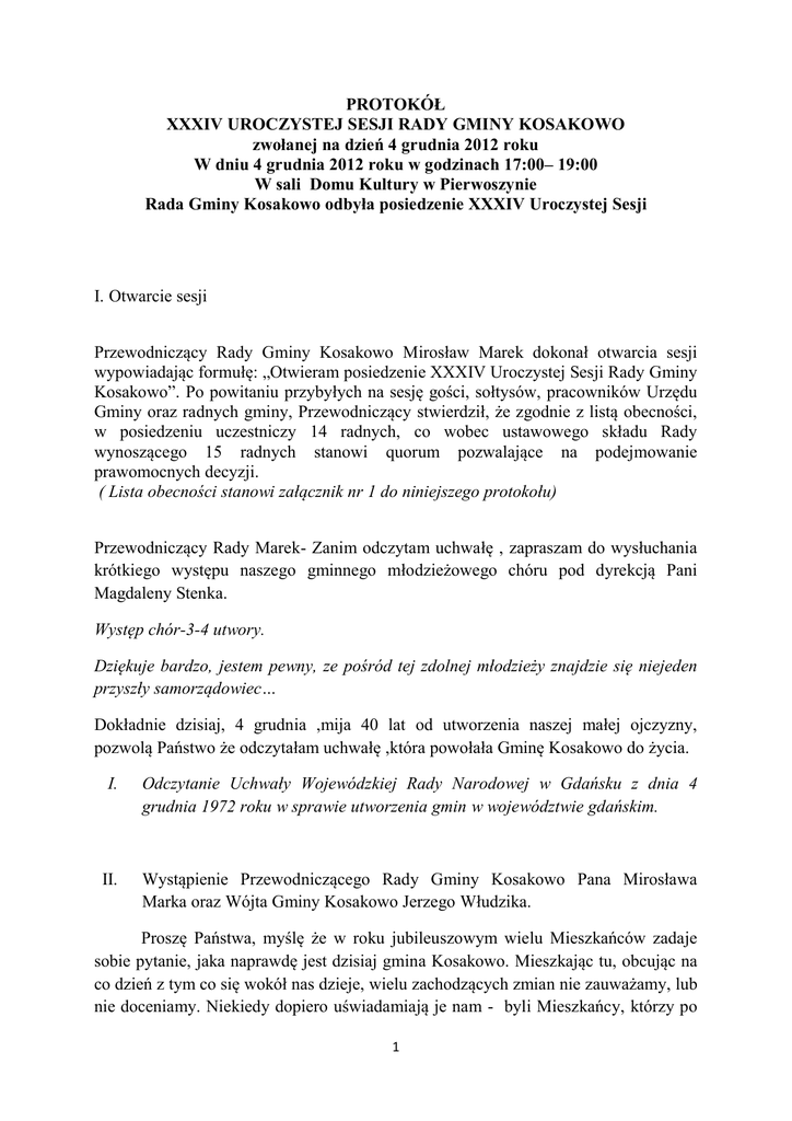 PROTOKÓŁ XXXIV UROCZYSTEJ SESJI RADY GMINY KOSAKOWO zwołanej na dzień 4 grudnia 2012 roku W dniu 4 grudnia 2012 roku w godzinach 17:00– 19:00 W sali Domu Kultury w Pierwoszynie Rada Gminy Kosakowo odbyła posiedzenie XXXIV Uroczystej Sesji I. Otwarcie sesji Przewodniczący Rady Gminy Kosakowo Mirosław Marek dokonał otwarcia sesji wypowiadając formułę: „Otwieram posiedzenie XXXIV Uroczystej Sesji Rady Gminy Kosakowo”. Po powitaniu przybyłych na sesję gości, sołtysów, pracowników Urzędu Gminy oraz radnych gminy, Przewodniczący stwierdził, że zgodnie z listą obecności, w posiedzeniu uczestniczy 14 radnych, co wobec ustawowego składu Rady wynoszącego 15 radnych stanowi quorum pozwalające na podejmowanie prawomocnych decyzji. ( Lista obecności stanowi załącznik nr 1 do niniejszego protokołu) Przewodniczący Rady Marek- Zanim odczytam uchwałę , zapraszam do wysłuchania krótkiego występu naszego gminnego młodzieżowego chóru pod dyrekcją Pani Magdaleny Stenka. Występ chór-3-4 utwory. Dziękuje bardzo, jestem pewny, ze pośród tej zdolnej młodzieży znajdzie się niejeden przyszły samorządowiec… Dokładnie dzisiaj, 4 grudnia ,mija 40 lat od utworzenia naszej małej ojczyzny, pozwolą Państwo że odczytałam uchwałę ,która powołała Gminę Kosakowo do życia. I. Odczytanie Uchwały Wojewódzkiej Rady Narodowej w Gdańsku z dnia 4 grudnia 1972 roku w sprawie utworzenia gmin w województwie gdańskim. II. Wystąpienie Przewodniczącego Rady Gminy Kosakowo Pana Mirosława Marka oraz Wójta Gminy Kosakowo Jerzego Włudzika. Proszę Państwa, myślę że w roku jubileuszowym wielu Mieszkańców zadaje sobie pytanie, jaka naprawdę jest dzisiaj gmina Kosakowo. Mieszkając tu, obcując na co dzień z tym co się wokół nas dzieje, wielu zachodzących zmian nie zauważamy, lub nie doceniamy. Niekiedy dopiero uświadamiają je nam - byli Mieszkańcy, którzy po 1 latach odwiedzają rodziny lub przyjeżdżaj, aby wziąć udział w imprezach sportowych czy kulturalnych. Szanowni Państwo! Pragnę wyrazić przekonanie, że w kolejnych latach ,dziesięcioleciach zarówno władze samorządowe , jak i organizacje działające w gminie- będą dążyć do tego, aby to wszystko, co teraz robimy dla gminy Kosakowo, spotkało się z aprobatą, z uznaniem, szacunkiem, aby w gminie Kosakowo pozostał po nas pozytywny i trwały ślad, aby ktoś w 100lecie powstania gminy Kosakowo zabierając glos na podobnej uroczystości, mógł powiedzieć: Oni zrobili dużo dla naszej gminy i mieszkańców! Spełnili oczekiwania! Tym się kierujemy w podejmowanych decyzjach i działaniach! Mamy świadomość że stajemy przed wieloma trudnymi wyzwaniami, zapewne nie grozi nam nadmiar środków budżetowych , jednak miejmy świadomość, że przyszłość tej gminy jest w naszych rękach, tak władz samorządowych, jak i zwykłych Mieszkańców. Co uda nam się zachować z dziedzictwa kulturowego naszych przodków, z dorobku poprzednich pokoleń, a co rozwiniemy sami, co nowego stworzymy- w dużym stopniu zależy od naszego wspólnego wysiłku, od harmonijnego współdziałania, od nas samych, od naszej inwencji i pomysłowości, a także od determinacji. Nie obawiajmy się śmiałych inicjatyw, byle by mieściły się w granicach rozsądku i finansowych możliwości i by dobrze służyły przyszłym pokoleniom. Proszę Państwa, historię tworzą ludzie, na Sali widzę znajome twarze, sprzed lat, wielu oddanych społeczników, nie będę cytował ich nazwisk bo jest ich zbyt wiele, nie chce też nikogo omyłkowo pominąć, chcę dziś ,podczas tej uroczystości podziękować im za ofiarną służbę naszej małej Ojczyźnie. Dziękuję. Proszę o zabranie głosu przez Wójta Jerzego Włudzika, który niedawno obchodził 10lecie pełnienia swojej funkcji . Proszę Państwa, rok 2012 jest rokiem jubileuszowym, zwieńczeniem tego okresu niech będzie wręczenie : III. Wręczenie jubileuszowych medali 40-lecia Gminy Kosakowo Radnym, Przewodniczącym Rad poprzednich kadencji, Wójtom poprzednich kadencji, byłym i obecnym Radnym powiatowym, byłym Sołtysom, Dyrektorom Szkół w Pogórzu i Dębogórzu oraz specjaliście ds. rady gminy w latach 1991-2007 Pani Iwonie Filocha. Zapraszam na scenę: 2 Radnych obecnej kadencji Brzozowska Alicja Elwart Waldemar Fifielska Marzena Gloza Beata Gutowski Marian Kierszka Wojciech Klimczyk Wojciech Marek Mirosław Merchel Alina Roszak Bożena Rzepa Marzena Sorn Lucyna Strzelec Antoni Śliwińska Wiktoria Tabakiernik Szymon 3 Radnych powiatu puckiego: Mirosław Busz Andrzej Dzienisz Byłych wójtów i byłych przewodniczących rad, byłych radnych powiatu puckiego Adam Miklaszewicz PR Zdzisław Miszewski PR Edward Młodnicki W Romuald Glapa W Andrzej Czaplicki W Anotni Strzelec PR Tadeusz Okulski PR Bolesław Bociąga W Mirosław Busz PR Wrona Ryszard W Grzegorz Kłos PR Szymański Zbigniew W Zbigniew Turzyński były radny powiatu puckiego iPR Antoni Pienczk PR Byłych sołtysów: Mosty Józef Karsznia Andrzej Kowalski Jan Sikorski Rewa Maria Zielińska Gołuński Henryk 4 Leon Joachimczyk Dębogórze Ryszard Lipkowski Romuald Glapa Kaszuba Jan Sławomir Dąbrowski Pierwoszyno Tadeusz Suzga Wanda Krause Zbigniew Konkol Mechelinki Antoni Kąkol Ireneusz Bober Jan Brzeziński Hanna Roszkowska Kazimierz Brechelke Urszula Leon Szreder Niemc Elżbieta 5 Zapraszam Panią Iwonę Filocha, pracownika biura rady w latach 1991-2007, która miała niejednokrotnie zapewne trudny orzech do zgryzienia tworząc skrupulatnie protokoły niełatwych posiedzeń sesji rady…. Bogdan Borusewicz wręcza dyplom od Marszałka Województwa Pomorskiego Prezesowi Stowarzyszeni Sołtysów- Panu Józefowi Melzer- za zasługi i działalność na rzecz lokalnej społeczności. Proszę Państwa, niedawno oddaliśmy do użytkowania 2 wspaniale obiekty przedszkole w Dębogórzu oraz salę gimnastyczna w Pogórzu. Zapraszam Panie Halinę Foltynowicz, dyrektor szkoły w Dębogórz