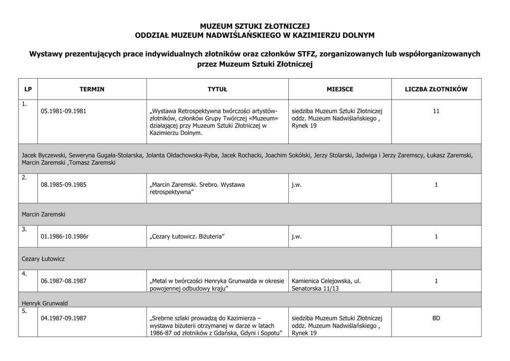 Złotnicy prezentowani na wystawach Muzeum Sztuki Złotniczej