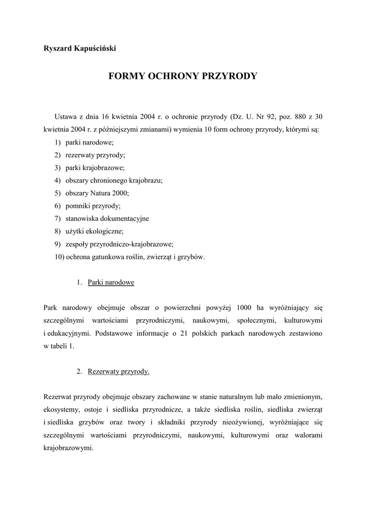 Ryszard Kapuściński FORMY OCHRONY PRZYRODY Ustawa z dnia 16 kwietnia 2004 r. o ochronie przyrody (Dz. U. Nr 92, poz. 880 z 30 kwietnia 2004 r. z późniejszymi zmianami) wymienia 10 form ochrony przyrody, którymi są: 1) parki narodowe; 2) rezerwaty przyrody; 3) parki krajobrazowe; 4) obszary chronionego krajobrazu; 5) obszary Natura 2000; 6) pomniki przyrody; 7) stanowiska dokumentacyjne 8) uŜytki ekologiczne; 9) zespoły przyrodniczo-krajobrazowe; 10) ochrona gatunkowa roślin, zwierząt i grzybów. 1. Parki narodowe Park narodowy obejmuje obszar o powierzchni powyŜej 1000 ha wyróŜniający się szczególnymi wartościami przyrodniczymi, naukowymi, społecznymi, kulturowymi i edukacyjnymi. Podstawowe informacje o 21 polskich parkach narodowych zestawiono w tabeli 1. 2. Rezerwaty przyrody. Rezerwat przyrody obejmuje obszary zachowane w stanie naturalnym lub mało zmienionym, ekosystemy, ostoje i siedliska przyrodnicze, a takŜe siedliska roślin, siedliska zwierząt i siedliska grzybów oraz twory i składniki przyrody nieoŜywionej, wyróŜniające się szczególnymi wartościami przyrodniczymi, naukowymi, kulturowymi oraz walorami krajobrazowymi. Tabela 1. Informacje turystyczne i dydaktyczne (wg stanu na 31.12.2001 r.) Szlaki Liczba Goście Liczba L.p. Park narodowy turystyczne turystów muzeum ścieŜek [km] [tys.] [tys.] dydaktycznych 1. Babiogórski 52,0 60 12,0 Periodyk _ 1 Parki Narodowe i Rezerwaty Przyrody _ 2. Białowieski 24,5 90 43,1 _ 3. Biebrzański 490,7 54 _ 3 4. Bieszczadzki 206,0 300 32,8 9 "Bory Tucholskie" 107,0 20 _ 1 _ 6. Drawieński 77,0 25 _ 2 _ 7. Gorczański 74,0 45 _ 8 _ 8. Gór Stołowych 100,0 215 9,0 2 Szczeliniec 9. Kampinoski 357,8 1 000 26,9 1 10. Karkonoski 112,0 1 500 7,1 8 Puszcza Kampinoska _ 11. Magurski 75,0 40 _ _ _ _ 5 4,0 1 _ 13. Ojcowski 23,0 400 31,5 2 Prądnik 14. Pieniński 34,7 585 300,2 _ Pieniny - przyroda i człowiek 15. Poleski 78,0 9 7,3 5 _ 16. Roztoczański 53,3 100 30,6 7 _ 17. Słowiński 140,0 282 40,8 5 _ 18. Świętokrzyski 41,0 400 39,9 1 _ 19. Tatrzański 245,0 2 460 20,0 1 - 10 - 2 21. Wielkopolski 87,5 1 200 10,9 3 Morena 22. Wigierski 190,0 60 7,4 4 Wigry 23. Woliński 44,0 1 500 52,4 5 Klify Krajowy Zarząd Parków Narodowych _ _ _ _ Parki Narodowe RAZEM 2 612,5 10 360 675,9 71 5. 12. Narwiański 20. "Ujście Warty" Roczniki Bieszczadzkie Tatry - Uznanie za rezerwat danego obszaru następuje w drodze rozporządzenia wojewody. W Polsce mamy 1385 rezerwatów, które zajmują powierzchnię 162435 ha (wg stanu na 31 grudnia 2004 r.). Najwięcej rezerwatów przyrody mamy w województwie mazowieckim (175), pomorskim (118) i warmińsko-mazurskim (102). 3. Parki krajobrazowe Park krajobrazowy obejmuje obszar chroniony ze względu na wartości przyrodnicze, historyczne i kulturowe oraz walory krajobrazowe w celu zachowania, popularyzacji tych wartości w warunkach zrównowaŜonego rozwoju. W Polsce mamy 120 parków krajobrazowych, które zajmują powierzchnię 2603683, 6 ha (wg stanu na 31 grudnia 2004 r.). Najwięcej parków krajobrazowych mamy w województwie lubelskim (16) i dolnośląskim (12). 4. Obszary chronionego krajobrazu Obszar chronionego krajobrazu obejmuje tereny chronione ze względu na wyróŜniający się krajobraz o zróŜnicowanych ekosystemach, wartościowe ze względu na moŜliwość zaspokajania potrzeb związanych z turystyką i wypoczynkiem lub pełnioną funkcją korytarzy ekologicznych. W Polsce mamy 445 tego rodzaju obiektów, które zajmują powierzchnię 7129228,6 ha (wg stanu na 31 grudnia 2004 r.). Najwięcej obszarów chronionego krajobrazu mamy w województwie warmińsko-mazurskim (65) i pomorskim (53). 5. Obszary Natura 2000 Natura 2000 – program ochrony przyrody w krajach Unii Europejskiej. Podstawą tego programu jest wspólny system obszarów (sieci) obejmujących określone typy siedlisk przyrodniczych oraz gatunków, które uznane są za cenne i zagroŜone w całej Europie. W ramach tego programu wyznaczone są tzw. Obszary Specjalnej Ochrony Ptaków oraz Specjalne Obszary Ochrony Siedlisk. W Polsce utworzono dotychczas 72 obszary specjalnej ochrony ptaków. Poza tym polski rząd zgłosił Komisji Europejskiej zamiar utworzenia 184 specjalnych obszarów ochrony siedlisk. Istniejące i proponowane obszary Natura 2000 nie wyczerpują jeszcze naszych moŜliwości i potrzeb ochrony. Kolejne propozycje obszarów, po uprzednich konsultacjach społecznych, zostały juŜ przesłane do Komisji Europejskiej. 6. Pomniki przyrody Pomnikami przyrody są pojedyncze twory przyrody Ŝywej i nieoŜywionej lub ich skupiska o szczególnej wartości przyrodniczej, naukowej, kulturowej, historycznej lub krajobrazowej oraz odznaczające się indywidualnymi cechami, wyróŜniającymi je wśród innych tworów, okazałych rozmiarów drzewa, krzewy gatunków rodzimych lub obcych, źródła, wodospady, wywierzyska, skałki, jary, głazy narzutowe oraz jaskinie. W Polsce mamy 34385 pomników przyrody (wg stanu na 31 grudnia 2004 r.) w tym: - 26716 pojedynczych drzew; - 4886 grup drzew; - 1215 głazów narzutowych; - 758 skałek, grot i jaskiń; - 811 alej. Najwięcej pomników przyrody mamy w województwie mazowieckim (4222),wielkopolski (3623) i łódzkim (3498). 7. Stanowiska dokumentacyjne Stanowiskami dokumentacyjnymi są niewyodrębniające się na powierzchni lub moŜliwe do wyodrębnienia, waŜne pod względem naukowym i dydaktycznym, miejsca występowania formacji geologicznych, nagromadzeń skamieniałości lub tworów mineralnych, jaskinie lub schroniska podskalne wraz z namuliskami oraz fragmenty eksploatowanych lub nieczynnych wyrobisk powierzchniowych i podziemnych. W Polsce mamy 115 stanowisk dokumentacyjnych, które zajmują powierzchnię 783,7 ha (wg stanu na 31 grudnia 2004 r.). Najwięcej stanowisk dokumentacyjnych jest w województwie małopolskim (53 obiekty). 8. UŜytki ekologiczne UŜytkami ekologicznymi są zasługujące na ochronę pozostałości ekosystemów mających znaczenie dla zach