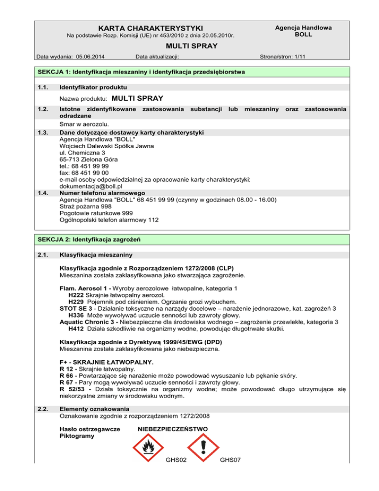 KARTA CHARAKTERYSTYKI Na podstawie Rozp. Komisji (UE) nr 453/2010 z dnia 20.05.2010r. Agencja Handlowa BOLL MULTI SPRAY Data wydania: 05.06.2014 Data aktualizacji: Strona/stron: 1/11 SEKCJA 1: Identyfikacja mieszaniny i identyfikacja przedsiębiorstwa 1.1. Identyfikator produktu Nazwa produktu: 1.2. 1.3. 1.4. MULTI SPRAY Istotne zidentyfikowane zastosowania substancji lub mieszaniny odradzane Smar w aerozolu. Dane dotyczące dostawcy karty charakterystyki Agencja Handlowa "BOLL" Wojciech Dalewski Spółka Jawna ul. Chemiczna 3 65-713 Zielona Góra tel.: 68 451 99 99 fax: 68 451 99 00 e-mail osoby odpowiedzialnej za opracowanie karty charakterystyki: [email protected] Numer telefonu alarmowego Agencja Handlowa "BOLL" 68 451 99 99 (czynny w godzinach 08.00 - 16.00) Straż pożarna 998 Pogotowie ratunkowe 999 Ogólnopolski telefon alarmowy 112 oraz zastosowania SEKCJA 2: Identyfikacja zagrożeń 2.1. Klasyfikacja mieszaniny Klasyfikacja zgodnie z Rozporządzeniem 1272/2008 (CLP) Mieszanina została zaklasyfikowana jako stwarzająca zagrożenie. Flam. Aerosol 1 - Wyroby aerozolowe łatwopalne, kategoria 1 H222 Skrajnie łatwopalny aerozol. H229 Pojemnik pod ciśnieniem. Ogrzanie grozi wybuchem. STOT SE 3 - Działanie toksyczne na narządy docelowe – narażenie jednorazowe, kat. zagrożeń 3 H336 Może wywoływać uczucie senności lub zawroty głowy. Aquatic Chronic 3 - Niebezpieczne dla środowiska wodnego – zagrożenie przewlekłe, kategoria 3 H412 Działa szkodliwie na organizmy wodne, powodując długotrwałe skutki. Klasyfikacja zgodnie z Dyrektywą 1999/45/EWG (DPD) Mieszanina została zaklasyfikowana jako niebezpieczna. F+ - SKRAJNIE ŁATWOPALNY. R 12 - Skrajnie łatwopalny. R 66 - Powtarzające się narażenie może powodować wysuszanie lub pękanie skóry. R 67 - Pary mogą wywoływać uczucie senności i zawroty głowy. R 52/53 - Działa toksycznie na organizmy wodne; może powodować długo utrzymujące się niekorzystne zmiany w środowisku wodnym. 2.2. Elementy oznakowania Oznakowanie zgodnie z rozporządzeniem 1272/2008 Hasło ostrzegawcze Piktogramy NIEBEZPIECZEŃSTWO GHS02 GHS07 Agencja Handlowa BOLL KARTA CHARAKTERYSTYKI Na podstawie Rozp. Komisji (UE) nr 453/2010 z dnia 20.05.2010r. MULTI SPRAY Data wydania: 05.06.2014 Data aktualizacji: Strona/stron: 2/11 Zwroty wskazujące rodzaj zagrożenia H222 Skrajnie łatwopalny aerozol. H229 Pojemnik pod ciśnieniem. Ogrzanie grozi wybuchem. H336 Może wywoływać uczucie senności lub zawroty głowy. H412 Działa szkodliwie na organizmy wodne, powodując długotrwałe skutki. Zwroty wskazujące środki ostrożności Ogólne P102 Chronić przed dziećmi. Zapobieganie P210 Przechowywać z dala od źródeł ciepła, gorących powierzchni, źródeł iskrzenia, otwartego ognia i innych źródeł zapłonu. Nie palić. P211 Nie rozpylać nad otwartym ogniem lub innym źródłem zapłonu. P251 Pojemnik pod ciśnieniem. Nie przekłuwać ani nie spalać, nawet po zużyciu. P261 Unikać wdychania mgły/par/rozpylonej cieczy. P271 Stosować wyłącznie na zewnątrz lub w dobrze wentylowanym miejscu. P273 Unikać uwolnienia do środowiska. Reagowanie P304+P340 W PRZYPADKU DOSTANIA SIĘ DO DRÓG ODDECHOWYCH: wyprowadzić lub wynieść poszkodowanego na świeże powietrze i zapewnić mu warunki do swobodnego oddychania. P312 W przypadku złego samopoczucia skontaktować się z OŚRODKIEM ZATRUĆ/ lekarzem. Przechowywanie P405 Przechowywać pod zamknięciem. P410+P412 Chronić przed światłem słonecznym. Nie wystawiać na działanie temperatury przekraczającej 50°C. Usuwanie P501 Zawartość / pojemnik usuwać do: składowisk substancji niebezpiecznych. Informacje uzupełniające EUH066 Powtarzające się narażenie może powodować wysuszanie lub pękanie skóry. 2.3. Inne zagrożenia Wyrób aerozolowy. Może powodować efekt narkotyczny. Produkt nie zawiera składników spełniających kryteria PBT lub vPvB. SEKCJA 3: Skład/informacja o składnikach 3.2. Mieszaniny Charakter chemiczny: mieszanina aktywnych składników z propelentem. Propelent: propan – butan. Nazwa substancji Identyfikator Klasyfikacja 67/548/EWG Klasyfikacja 1272/2008 Destylaty ciężkie parafinowe z odparafinowania rozpuszczalnikowego (ropa naftowa) Olej bazowy – niespecyfikowany [zawiera < 3 % ekstraktu DMSO] Indeks 649-474-00-6 CAS 64742-65-0 WE 265-169-7 Nr rejestracyjny 01-2119471299-27 Xn; R65 Asp. Tox. 1 H304 25 - <50 Destylaty lekkie obrabiane wodorem (ropa naftowa) Indeks --CAS 64742-47-8 WE 926-141-6 Nr rejestracyjny Xn; R65 R66 Asp. Tox. 1 H304 10 - <25 % wag KARTA CHARAKTERYSTYKI Na podstawie Rozp. Komisji (UE) nr 453/2010 z dnia 20.05.2010r. Agencja Handlowa BOLL MULTI SPRAY Data wydania: 05.06.2014 Data aktualizacji: Strona/stron: 3/11 01-2119456620-43 Węglowodory, C9-C12, nalkany, izoalkeny, pierścieniowe, aromatyczne (2-25%) Indeks 649-328-00-1 CAS 64742-82-1 WE 919-446-0 Nr rejestracyjny 01-2119458049-33 R10 Xn; R65 N; R51/53 R66 R67 Flam. Liq. 3 Asp. Tox. 1 STOT SE 3 Aquatic Chronic2 H226 H304 H336 H411 15 - <20 butan [zawiera <0,1% buta-1,3dienu (WE 203-450-8)] Indeks 601-004-00-0 CAS 106-97-8 WE 203-448-7 Nr rejestracyjny 01-2119474691-32 F+; R12 Flam. Gas 1 Press. Gas H220 H280 10 - <25 propan Indeks: 601-003-00-5 CAS: 74-98-6 WE: 200-827-9 Nr rejestracyjny 01-2119486944-21 F+; R12 Flam. Gas 1 Press. Gas H220 H280 3 - <10 1,2,4-trimetylobenzen Indeks 601-043-00-3 CAS 95-63-6 WE 202-436-9 R10 Xn; R20 Xi; R36/37/38 N; R51/53 Flam. Liq. 3 Acute Tox. 4 Eye Irrit. 2 STOT SE 3 Skin Irrit. 2 Aquatic Chronic2 H226 H332 H319 H335 H315 H411 0,3 -< 1 etoksylowany nonylofenol Indeks --CAS 9016-45-9 WE 500-024-6 Xi; R36/38 N; R51/53 Eye Irrit. 2 Skin Irrit. 2 Acute Tox. 4 Aquatic Chronic2 H319 H315 H302 H411 0,3 -< 1 mezytylen Indeks 601-025-00-5 CAS 108-67-8 WE 203-604-4 R10 Xi; R37 N; R51/53 Flam. Liq. 3 STOT SE 3 Aquatic Chronic2 H226 H335 H411 0,1 -< 0,3 Pełne znaczenie zwrotów zagrożenia R i H ujęto w sekcji 16 SEKCJA 4: Środki pierwszej pomoc