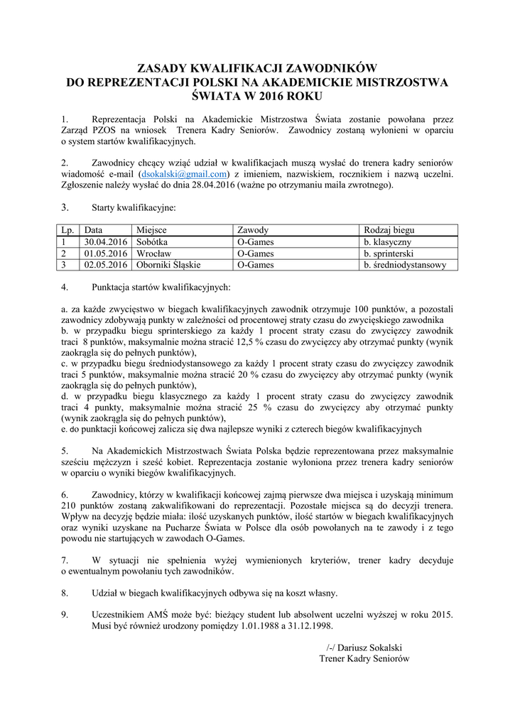 ZASADY KWALIFIKACJI ZAWODNIKÓW DO REPREZENTACJI POLSKI NA AKADEMICKIE MISTRZOSTWA ŚWIATA W 2016 ROKU 1. Reprezentacja Polski na Akademickie Mistrzostwa Świata zostanie powołana przez Zarząd PZOS na wniosek Trenera Kadry Seniorów. Zawodnicy zostaną wyłonieni w oparciu o system startów kwalifikacyjnych. 2. Zawodnicy chcący wziąć udział w kwalifikacjach muszą wysłać do trenera kadry seniorów wiadomość e-mail ([email protected]) z imieniem, nazwiskiem, rocznikiem i nazwą uczelni. Zgłoszenie należy wysłać do dnia 28.04.2016 (ważne po otrzymaniu maila zwrotnego). 3. Lp. 1 2 3 4. Starty kwalifikacyjne: Data 30.04.2016 01.05.2016 02.05.2016 Miejsce Sobótka Wrocław Oborniki Śląskie Zawody O-Games O-Games O-Games Rodzaj biegu b. klasyczny b. sprinterski b. średniodystansowy Punktacja startów kwalifikacyjnych: a. za każde zwycięstwo w biegach kwalifikacyjnych zawodnik otrzymuje 100 punktów, a pozostali zawodnicy zdobywają punkty w zależności od procentowej straty czasu do zwycięskiego zawodnika b. w przypadku biegu sprinterskiego za każdy 1 procent straty czasu do zwycięzcy zawodnik traci 8 punktów, maksymalnie można stracić 12,5 % czasu do zwycięzcy aby otrzymać punkty (wynik zaokrągla się do pełnych punktów), c. w przypadku biegu średniodystansowego za każdy 1 procent straty czasu do zwycięzcy zawodnik traci 5 punktów, maksymalnie można stracić 20 % czasu do zwycięzcy aby otrzymać punkty (wynik zaokrągla się do pełnych punktów), d. w przypadku biegu klasycznego za każdy 1 procent straty czasu do zwycięzcy zawodnik traci 4 punkty, maksymalnie można stracić 25 % czasu do zwycięzcy aby otrzymać punkty (wynik zaokrągla się do pełnych punktów), e. do punktacji końcowej zalicza się dwa najlepsze wyniki z czterech biegów kwalifikacyjnych 5. Na Akademickich Mistrzostwach Świata Polska będzie reprezentowana przez maksymalnie sześciu mężczyzn i sześć kobiet. Reprezentacja zostanie wyłoniona przez trenera kadry seniorów w oparciu o wyniki biegów kwalifikacyjnych. 6. Zawodnicy, którzy w kwalifikacji końcowej zajmą pierwsze dwa miejsca i uzyskają minimum 210 punktów zostaną zakwalifikowani do reprezentacji. Pozostałe miejsca są do decyzji trenera. Wpływ na decyzję będzie miała: ilość uzyskanych punktów, ilość startów w biegach kwalifikacyjnych oraz wyniki uzyskane na Pucharze Świata w Polsce dla osób powołanych na te zawody i z tego powodu nie startujących w zawodach O-Games. 7. W sytuacji nie spełnienia wyżej wymienionych kryteriów, trener kadry decyduje o ewentualnym powołaniu tych zawodników. 8. Udział w biegach kwalifikacyjnych odbywa się na koszt własny. 9. Uczestnikiem AMŚ może być: bieżący student lub absolwent uczelni wyższej w roku 2015. Musi być również urodzony pomiędzy 1.01.1988 a 31.12.1998. /-/ Dariusz Sokalski Trener Kadry Seniorów