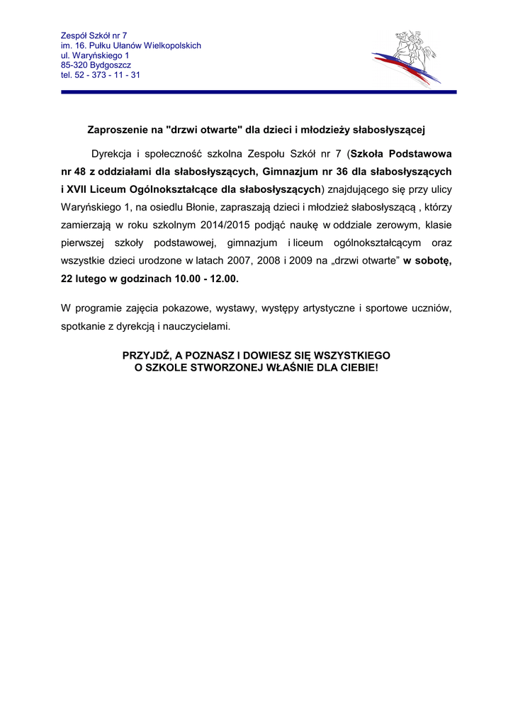 Zespół Szkół nr 7 im. 16. Pułku Ułanów Wielkopolskich ul. Waryńskiego 1 85-320 Bydgoszcz tel. 52 - 373 - 11 - 31 Zaproszenie na "drzwi otwarte" dla dzieci i młodzieży słabosłyszącej Dyrekcja i społeczność szkolna Zespołu Szkół nr 7 (Szkoła Podstawowa nr 48 z oddziałami dla słabosłyszących, Gimnazjum nr 36 dla słabosłyszących i XVII Liceum Ogólnokształcące dla słabosłyszących) znajdującego się przy ulicy Waryńskiego 1, na osiedlu Błonie, zapraszają dzieci i młodzież słabosłyszącą , którzy zamierzają w roku szkolnym 2014/2015 podjąć naukę w oddziale zerowym, klasie pierwszej szkoły podstawowej, gimnazjum i liceum ogólnokształcącym oraz wszystkie dzieci urodzone w latach 2007, 2008 i 2009 na „drzwi otwarte” w sobotę, 22 lutego w godzinach 10.00 - 12.00. W programie zajęcia pokazowe, wystawy, występy artystyczne i sportowe uczniów, spotkanie z dyrekcją i nauczycielami. PRZYJDŹ, A POZNASZ I DOWIESZ SIĘ WSZYSTKIEGO O SZKOLE STWORZONEJ WŁAŚNIE DLA CIEBIE!