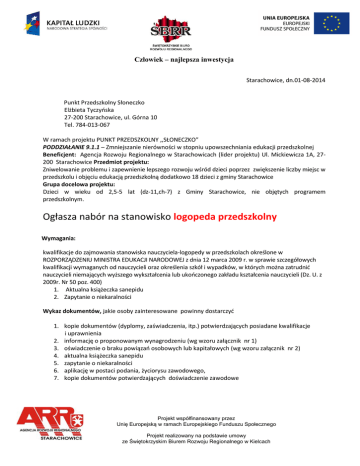 Człowiek – najlepsza inwestycja Starachowice, dn.01-08-2014 Punkt Przedszkolny Słoneczko Elżbieta Tyczyńska 27-200 Starachowice, ul. Górna 10 Tel. 784-013-067 W ramach projektu PUNKT PRZEDSZKOLNY ,,SŁONECZKO” PODDZIAŁANIE 9.1.1 – Zmniejszanie nierówności w stopniu upowszechniania edukacji przedszkolnej Beneficjent: Agencja Rozwoju Regionalnego w Starachowicach (lider projektu) Ul. Mickiewicza 1A, 27200 Starachowice Przedmiot projektu: Zniwelowanie problemu i zapewnienie lepszego rozwoju wśród dzieci poprzez zwiększenie liczby miejsc w przedszkolu i objęciu edukacją przedszkolną dodatkowo 18 dzieci z gminy Starachowice Grupa docelowa projektu: Dzieci w wieku od 2,5-5 lat (dz-11,ch-7) z Gminy Starachowice, nie objętych programem przedszkolnym. Ogłasza nabór na stanowisko logopeda przedszkolny Wymagania: kwalifikacje do zajmowania stanowiska nauczyciela-logopedy w przedszkolach określone w ROZPORZĄDZENIU MINISTRA EDUKACJI NARODOWEJ z dnia 12 marca 2009 r. w sprawie szczegółowych kwalifikacji wymaganych od nauczycieli oraz określenia szkół i wypadków, w których można zatrudnić nauczycieli niemających wyższego wykształcenia lub ukończonego zakładu kształcenia nauczycieli (Dz. U. z 2009r. Nr 50 poz. 400) 1. Aktualna książeczka sanepidu 2. Zapytanie o niekaralności Wykaz dokumentów, jakie osoby zainteresowane powinny dostarczyć 1. kopie dokumentów (dyplomy, zaświadczenia, itp.) potwierdzających posiadane kwalifikacje i uprawnienia 2. informację o proponowanym wynagrodzeniu (wg wzoru załącznik nr 1) 3. oświadczenie o braku powiązań osobowych lub kapitałowych (wg wzoru załącznik nr 2) 4. aktualna książeczka sanepidu 5. zapytanie o niekaralności 6. aplikację w postaci podania, życiorysu zawodowego, 7. kopie dokumentów potwierdzających doświadczenie zawodowe Projekt współfinansowany przez Unię Europejską w ramach Europejskiego Funduszu Społecznego Projekt realizowany na podstawie umowy ze Świętokrzyskim Biurem Rozwoju Regionalnego w Kielcach Człowiek – najlepsza inwestycja Zakres obowiązków Logopeda odpowiedzialny/a będzie za: 1. przeprowadzenie diagnozy logopedycznej dzieci oraz odpowiednio do jego wyników organizowanie pomocy logopedycznej; 2. opracowanie programu zajęć dla dzieci w wieku 2,5-5 lat; 3. prowadzenie zajęć indywidualnych wśród dzieci ze zdiagnozowaną wadą wymowy , rozwijających umiejętność mówienia i wysławiania się o charakterze profilaktycznym lub korekcyjnym; 4. prowadzenie zajęć w formie m.in. gier i zabaw; 5. prowadzenie obserwacji rozwoju mowy dzieci; 6. przekazywanie rodzicom na bieżąco informacji o postępach dzieci; 7. prowadzenie dokumentacji przebiegu zajęć 8. ścisła współpraca z dyrektorem punktu przedszkolnego , nauczycielem wychowania przedszkolnego , kadrą projektu i rodzicami dzieci Miejsce składania dokumentów : Punkt Przedszkolny Słoneczko27-200 Starachowice ul. Górna 10 Termin składania dokumentów 01-08-2014 do 18-08-2014 do godziny 9:00 I. Termin podpisania umowy: 28.08. 2014 r. II. Termin realizacji zamówienia/usługi przez wykonawcę: 01.09.2014r. – 30.06.2015r. IV Rodzaj zatrudnienia – umowa zlecenie Zajęcia odbywać się będą 2 razy w tygodniu po 30 minut ( pół godziny) w I i II semestrze roku szkolnego 2014/2015 W celu weryfikacji zostanie przeprowadzona rozmowa rekrutacyjna z wybranymi osobami Załączniki: 1. 2. Informacja o proponowanym wynagrodzeniu Oświadczenie o braku powiązań osobowych lub kapitałowych Projekt współfinansowany przez Unię Europejską w ramach Europejskiego Funduszu Społecznego Projekt realizowany na podstawie umowy ze Świętokrzyskim Biurem Rozwoju Regionalnego w Kielcach Człowiek – najlepsza inwestycja Załącznik nr 1 Informacja o proponowanym wynagrodzeniu na stanowisku logopeda przedszkolny Imię i nazwisko…………………………………………………………….. Adres …………………………………………………….……………………. NIP ………………………………………………….…………………………… PESEL……………………………………………….…………………………... Ja niżej podpisany ……………………………………………………………………………………………………………..…………… (imię i nazwisko) Wyrażam chęć podjęcia pracy na stanowisku logopeda przedszkolny za stawkę godzinową wynoszącą ……………………… zł brutto (słownie ………………………………………………………………………………………………..) 2 Zobowiązuję się wykonać przedmiot zamówienia w następującym terminie: 01.09.2014r. – 30.06.2015r. 3 W razie wybrania mojej oferty zobowiązuję się do podpisania umowy w terminie określonym przez Zamawiającego ……………………………….… dnia …………………. (miejscowość) ………………………………………. podpis Projekt współfinansowany przez Unię Europejską w ramach Europejskiego Funduszu Społecznego Projekt realizowany na podstawie umowy ze Świętokrzyskim Biurem Rozwoju Regionalnego w Kielcach Człowiek – najlepsza inwestycja Załącznik nr 2 Oświadczenie o braku powiązań osobowych lub kapitałowych Ja niżej podpisany ……………………………………………………………………………………………………….……………………… (imię i nazwisko) Adres ………………………………………………………………………. NIP ………………………………………………………………………… PESEL……………………………………………………….……………... Oświadczam, że nie jestem powiązany z Zamawiającym osobowo lub kapitałowo. Przez powiązania kapitałowe lub osobowe rozumie się wzajemne powiązania między Zamawiającym lub osobami upoważnionymi do zaciąga
