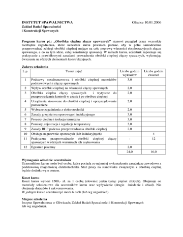 INSTYTUT SPAWALNICTWA Gliwice 10.01.2006 Zakład Bada Spawalno ci i Konstrukcji Spawanych Program kursu pt.: „Obróbka cieplna zł czy spawanych” stanowi przegl d przez wszystkie niezb dne zagadnienia, które uczestnik kursu powinien pozna , aby w pełni samodzielnie przeprowadza zabiegi obróbki cieplnej maj ce na celu popraw własno ci eksploatacyjnych zł cza spawanego, a co za tym idzie, całej konstrukcji spawanej. W ramach kursu, uczestnik zapoznaje si praktycznie z prawidłowymi zasadami prowadzenia obróbki cieplnej zł czy spawanych, wykonuj c wiczenia na ró nych elementach konstrukcyjnych. Zakres szkolenia L.p. Temat zaj Liczba godzin wykładów 1 Podstawy metaloznawstwa i obróbki cieplnej materiałów podstawowych i zł czy spawanych 3,0 2 Wpływ obróbki cieplnej na własno ci zł czy spawanych 2,0 3 Obróbka cieplna zł czy spawanych i wytyczne do przeprowadzania kontroli w czasie i po obróbce cieplnej 2,0 4 Urz dzenia stosowane do obróbki cieplnej i oprzyrz dowanie pomocnicze 2,0 5 Wybrane zagadnienia z elektrotechniki 2,0 6 Zasady grzejnictwa oporowego i indukcyjnego 3,0 7 Procesy cieplne i izolacja termiczna 3,0 8 Pomiary, rejestracja i regulacja temperatury 3,0 9 Zasady BHP podczas przeprowadzania obróbki cieplnej 2,0 10 Obsługa nagrzewnic oporowych (lub indukcyjnych) 11 Praktyczne przeprowadzanie obróbki cieplnej spawanych w ró nych warunkach ich usytuowania 12 Egzamin pisemny zł czy Liczba godzin wicze - 4 - 12 2,0 24,0 16,0 Wymagania odno nie uczestników Uczestnikiem kursu mo e by osoba, która posiada co najmniej wykształcenie zasadnicze zawodowe z podstawow znajomo ci elektrotechniki. Sta pracy na stanowisku zwi zanym z obróbk ciepln b dzie dodatkowym atutem. Koszt kursu Koszt kursu wynosi 1500,- zł. za 1 osob (słownie: jeden tysi c pi set złotych). Obejmuje on materiały szkoleniowe dla uczestników kursu oraz wy ywienie (drugie niadanie i obiad). Nie obejmuje dojazdów i zakwaterowania. W jednym kursie uczestniczy mo e 6 osób (lub wg uzgodnie ). Miejsce szkolenia Instytut Spawalnictwa w Gliwicach; Zakład Bada Spawalno ci i Konstrukcji Spawanych lub wg uzgodnie . Termin zorganizowania kursu musi by ustalony pomi dzy zainteresowan stron a organizatorem co najmniej 3 tygodnie przed rozpocz ciem szkolenia. Nie organizujemy szkolenia w miesi cu lipcu i sierpniu Informacji dodatkowych udzielaj : dr in . Marian Szubryt (tel. 0-32 231 00 11 wewn. 203) lub doc. dr in . Jerzy Brózda (tel. 0-32 231 00 11 wewn. 264) Z powa aniem