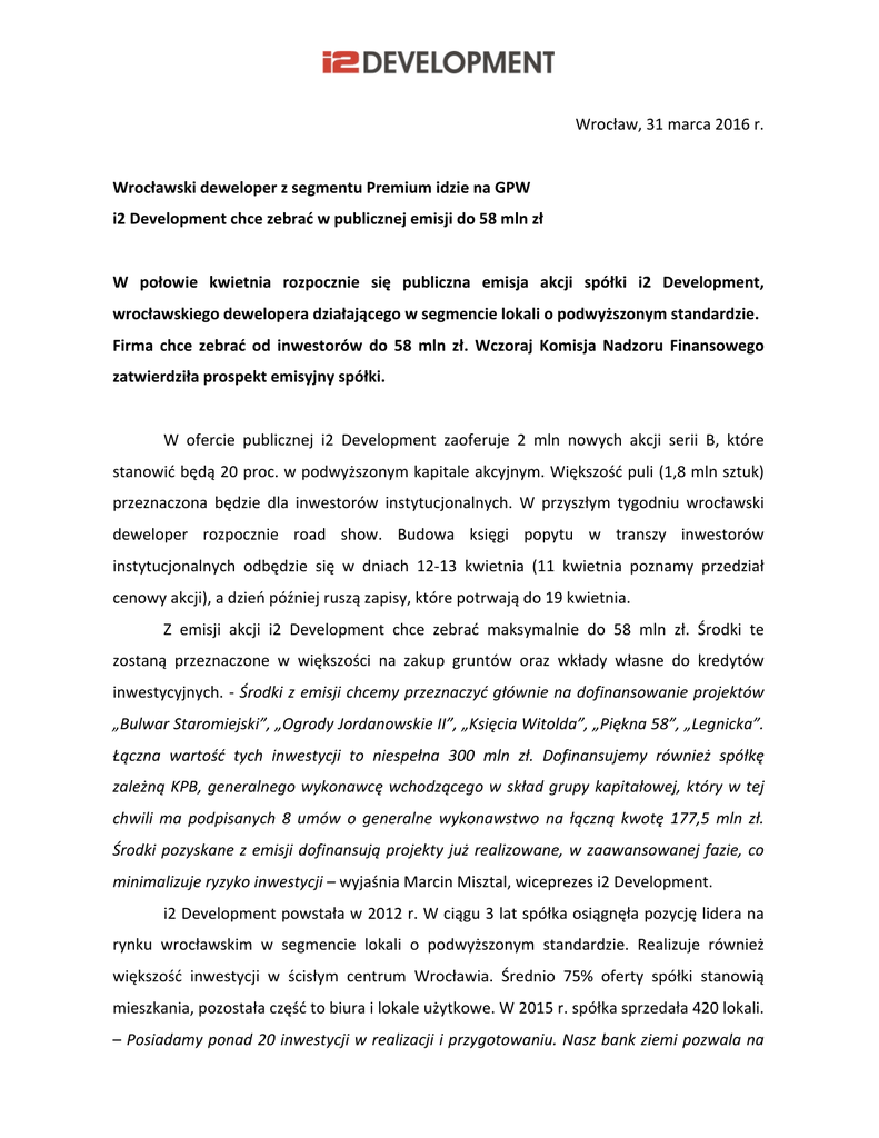 Wrocław,31marca2016r. WrocławskideweloperzsegmentuPremiumidzienaGPW i2Developmentchcezebraćwpublicznejemisjido58mlnzł W połowie kwietnia rozpocznie się publiczna emisja akcji spółki i2 Development, wrocławskiegodeweloperadziałającegowsegmencielokaliopodwyższonymstandardzie. Firma chce zebrać od inwestorów do 58 mln zł. Wczoraj Komisja Nadzoru Finansowego zatwierdziłaprospektemisyjnyspółki. W ofercie publicznej i2 Development zaoferuje 2 mln nowych akcji serii B, które stanowićbędą20proc.wpodwyższonymkapitaleakcyjnym.Większośćpuli(1,8mlnsztuk) przeznaczona będzie dla inwestorów instytucjonalnych. W przyszłym tygodniu wrocławski deweloper rozpocznie road show. Budowa księgi popytu w transzy inwestorów instytucjonalnych odbędzie się w dniach 12-13 kwietnia (11 kwietnia poznamy przedział cenowyakcji),adzieńpóźniejruszązapisy,którepotrwajądo19kwietnia. Z emisji akcji i2 Development chce zebrać maksymalnie do 58 mln zł. Środki te zostaną przeznaczone w większości na zakup gruntów oraz wkłady własne do kredytów inwestycyjnych.-Środkizemisjichcemyprzeznaczyćgłównienadofinansowanieprojektów „BulwarStaromiejski”,„OgrodyJordanowskieII”,„KsięciaWitolda”,„Piękna58”,„Legnicka”. Łączna wartość tych inwestycji to niespełna 300 mln zł. Dofinansujemy również spółkę zależnąKPB,generalnegowykonawcęwchodzącegowskładgrupykapitałowej,którywtej chwili ma podpisanych 8 umów o generalne wykonawstwo na łączną kwotę 177,5 mln zł. Środkipozyskanezemisjidofinansująprojektyjużrealizowane,wzaawansowanejfazie,co minimalizujeryzykoinwestycji–wyjaśniaMarcinMisztal,wiceprezesi2Development. i2Developmentpowstaław2012r.Wciągu3latspółkaosiągnęłapozycjęliderana rynku wrocławskim w segmencie lokali o podwyższonym standardzie. Realizuje również większość inwestycji w ścisłym centrum Wrocławia. Średnio 75% oferty spółki stanowią mieszkania,pozostałaczęśćtobiurailokaleużytkowe.W2015r.spółkasprzedała420lokali. –Posiadamyponad20inwestycjiwrealizacjiiprzygotowaniu.Naszbankziemipozwalana realizację w latach 2016-2018 ponad 1600 mieszkań oraz około 30 tys. mkw powierzchni komercyjnej–podkreślaMarcinMisztal.Spółkaposiadaniemal200mlnkapitałówwłasnych, zatrudnia 80 osób, a kolejnych 600 pracuje przy realizowanych inwestycjach. - Co ważne jesteśmy „samowystarczalni”. Rozumiem przez to, że w ramach grupy działa deweloper, generalny wykonawca i biuro architektoniczne. To znacznie redukuje koszty i przyspiesza procesinwestycyjny,acozatymidziepodnosimarżęnasprzedaży–zaznaczawiceprezes. Obecnie sztandarową inwestycją spółki jest „Bulwar Staromiejski” położony w centrumWrocławia.Nadziałcemieszcząsiębudynkipodawnymszpitalu.Komplekszakłada stworzenie zespołu 14 projektów deweloperskich o przeznaczeniu mieszkalno-biurowym wraz z usługami, kompleksowym zagospodarowaniem terenu oraz podziemnymi miejscami postojowymi. Inwestycja pochłonie 120 mln zł. Będzie składała się z około 20 tys. mkw powierzchnimieszkalnejiprawie9tys.mkw powierzchniusługowo-biurowej. .................................................................. i2 Development to grupa spółek realizujących inwestycje mieszkaniowe i komercyjne na terenie Wrocławia. W 2012 roku do dewelopera – i2 Development Sp. z o.o. dołączył generalny wykonawca – KPB Sp. z o.o., a w 2014 roku skład dynamicznie rozwijającej się grupy uzupełniło biuro architektoniczne – Chamielec Architekci Sp.zo.o. Od 2015 roku spółki tworzą formalną Grupę i2 Development, prowadzącą inwestycje mieszkaniowe i komercyjne w ścisłym centrum oraz w prestiżowych dzielnicach Wrocławia. Za realizację projektówwnętrzodpowiadaspółkacelowaConceptSp.zo.o. Kontaktdlamediów:BarbaraBrozda,mail:[email protected],tel.518734141
