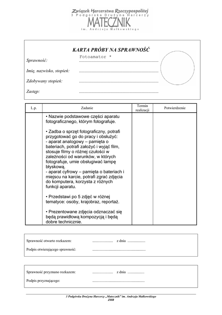 KARTA PRÓBY NA SPRAWNOŚĆ Sprawność: Fotoamator * ....................................................................... Imię, nazwisko, stopień: ....................................................................... Zdobywany stopień: ....................................................................... Zastęp: ....................................................................... L.p. Termin realizacji Zadanie • Nazwie podstawowe części aparatu fotograficznego, którym fotografuje. • Zadba o sprzęt fotograficzny, potrafi przygotować go do pracy i obsłużyć: - aparat analogowy – pamięta o bateriach, potrafi założyć i wyjąć film, stosuje filmy o różnej czułości w zależności od warunków, w których fotografuje, umie obsługiwać lampę błyskową. - aparat cyfrowy – pamięta o bateriach i miejscu na karcie, potrafi zgrać zdjęcia do komputera, korzysta z różnych funkcji aparatu. • Przedstawi po 5 zdjęć w różnej tematyce: osoby, krajobraz, reportaż. • Prezentowane zdjęcia odznaczać się będą prawidłową kompozycją i będą dobre technicznie. Sprawność otwarto rozkazem: ...................... z dnia ................... Podpis otwierającego sprawność: ......................................................... Sprawność przyznano rozkazem: ...................... Podpis przyznającego: ........................................................ z dnia .................. 3 Podgórska DruŜyna Harcerzy „Matecznik” im. Andrzeja Małkowskiego ZHR Potwierdzenie