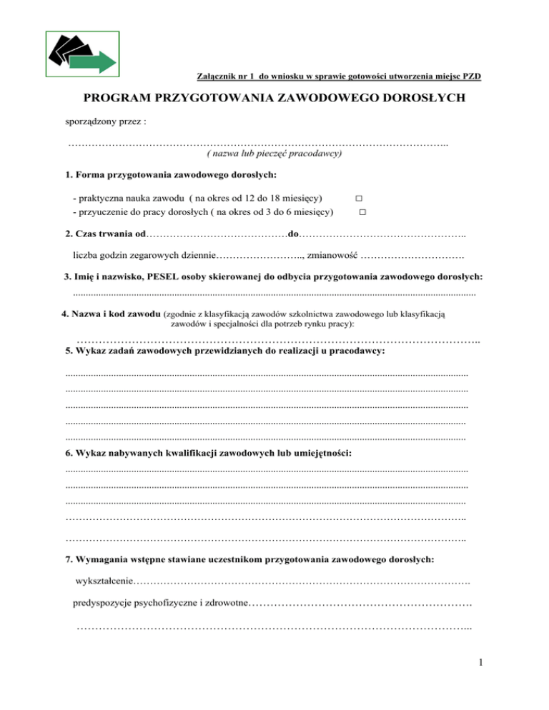 Załącznik nr 1 do wniosku w sprawie gotowości utworzenia miejsc PZD PROGRAM PRZYGOTOWANIA ZAWODOWEGO DOROSŁYCH sporządzony przez : ………………………………………………………………………………………………….. ( nazwa lub pieczęć pracodawcy) 1. Forma przygotowania zawodowego dorosłych: - praktyczna nauka zawodu ( na okres od 12 do 18 miesięcy) - przyuczenie do pracy dorosłych ( na okres od 3 do 6 miesięcy) □ □ 2. Czas trwania od……………………………………do………………………………………….. liczba godzin zegarowych dziennie…………………….., zmianowość …………………………. 3. Imię i nazwisko, PESEL osoby skierowanej do odbycia przygotowania zawodowego dorosłych: ............................................................................................................................................................... 4. Nazwa i kod zawodu (zgodnie z klasyfikacją zawodów szkolnictwa zawodowego lub klasyfikacją zawodów i specjalności dla potrzeb rynku pracy): ……………………………………………………………………………………………….. 5. Wykaz zadań zawodowych przewidzianych do realizacji u pracodawcy: ............................................................................................................................................................... ............................................................................................................................................................... ............................................................................................................................................................... .............................................................................................................................................................. .............................................................................................................................................................. 6. Wykaz nabywanych kwalifikacji zawodowych lub umiejętności: ............................................................................................................................................................... ............................................................................................................................................................... .............................................................................................................................................................. ……………………………………………………………………………………………………….. ……………………………………………………………………………………………………….. 7. Wymagania wstępne stawiane uczestnikom przygotowania zawodowego dorosłych: wykształcenie………………………………………………………………………………………. predyspozycje psychofizyczne i zdrowotne……………………………………………………. ……………………………………………………………………………………………... 1 8. Plan nauczania Lp. Tematy zajęć edukacyjnych Wymiar godzin zajęć praktycznych zajęć teoretycznych Ogółem liczba godzin 9. Miejsce nabywania: - umiejętności praktycznych przez uczestników przygotowania zawodowego: …………………………………………………………………………………………… - wiedzy teoretycznej przez uczestników przygotowania zawodowego: ……………………………………………………………………………………………. 10. Wykaz literatury oraz niezbędnych środków i materiałów dydaktycznych: …………………………………………………………………………………………………………… …………………………………………………………………………………………………………… …………………………………………………………………………………………………………… …………………………………………………………………………………………………………… 11. Sposób sprawdzania efektów przygotowania zawodowego dorosłych: ………………………………………………………………………………………………… ………………………………………………………………………………………………… ………………………………………………………………………………………………… …………………………............................................................................................................. …………………………………………………………………………………………………………. 2 12. Wymiar nieobecności na zajęciach przygotowania zawodowego dorosłych umożliwiający uczestnikowi realizację programu, wyrażony udziałem procentowym maksymalnej dopuszczalnej liczby godzin nieobecności na zajęciach w stosunku do całkowitej liczby godzin zajęć przewidzianych programem. Zajęcia teoretyczne oraz zajęcia praktyczne - dopuszczalna liczba godzin nieobecności wynosi … %, tj. liczba godzin…….. 13. Program przygotowania zawodowego dorosłych został opracowany przez: Imię i nazwisko: …………………………………………………………………………………... na podstawie ……………………………………………………………………………………… (należy wymienić, opisać, wskazać obowiązujące w danym zakresie przepisy, itp.) ………………………………………………………………………………………………… ………………………………………………………