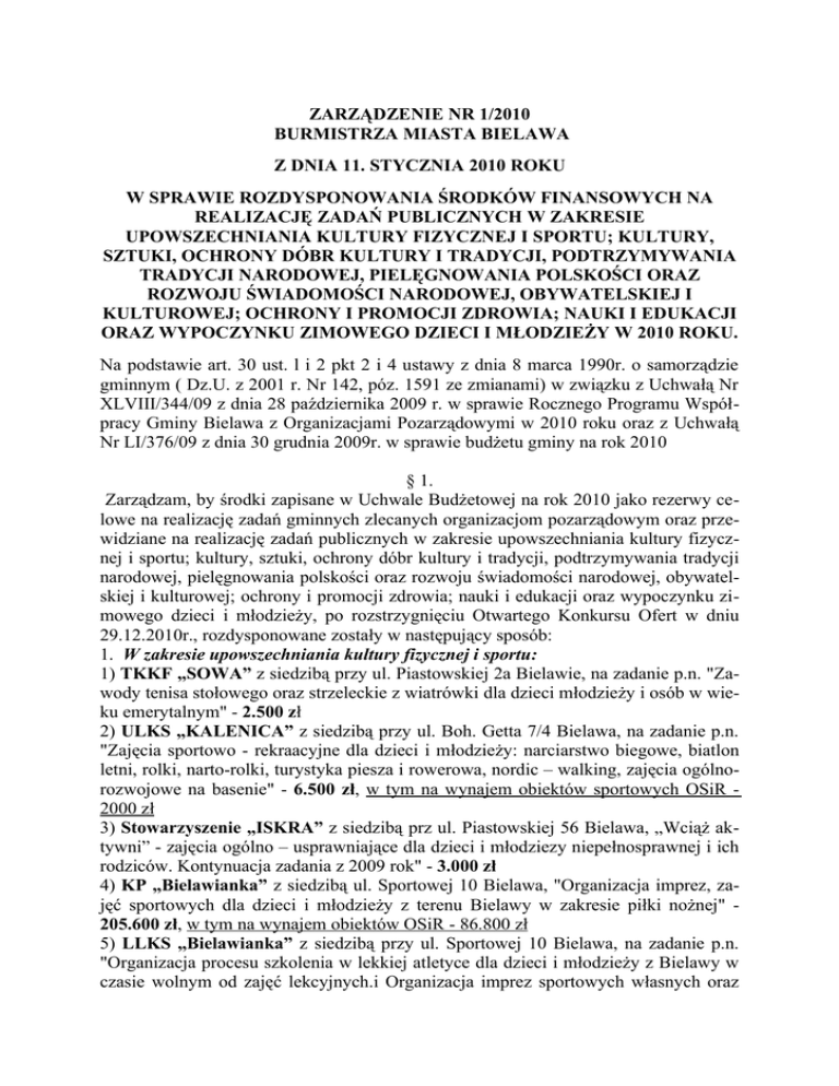 ZARZĄDZENIE NR 1/2010 BURMISTRZA MIASTA BIELAWA Z DNIA 11. STYCZNIA 2010 ROKU W SPRAWIE ROZDYSPONOWANIA ŚRODKÓW FINANSOWYCH NA REALIZACJĘ ZADAŃ PUBLICZNYCH W ZAKRESIE UPOWSZECHNIANIA KULTURY FIZYCZNEJ I SPORTU; KULTURY, SZTUKI, OCHRONY DÓBR KULTURY I TRADYCJI, PODTRZYMYWANIA TRADYCJI NARODOWEJ, PIELĘGNOWANIA POLSKOŚCI ORAZ ROZWOJU ŚWIADOMOŚCI NARODOWEJ, OBYWATELSKIEJ I KULTUROWEJ; OCHRONY I PROMOCJI ZDROWIA; NAUKI I EDUKACJI ORAZ WYPOCZYNKU ZIMOWEGO DZIECI I MŁODZIEŻY W 2010 ROKU. Na podstawie art. 30 ust. l i 2 pkt 2 i 4 ustawy z dnia 8 marca 1990r. o samorządzie gminnym ( Dz.U. z 2001 r. Nr 142, póz. 1591 ze zmianami) w związku z Uchwałą Nr XLVIII/344/09 z dnia 28 października 2009 r. w sprawie Rocznego Programu Współpracy Gminy Bielawa z Organizacjami Pozarządowymi w 2010 roku oraz z Uchwałą Nr LI/376/09 z dnia 30 grudnia 2009r. w sprawie budżetu gminy na rok 2010 § 1. Zarządzam, by środki zapisane w Uchwale Budżetowej na rok 2010 jako rezerwy celowe na realizację zadań gminnych zlecanych organizacjom pozarządowym oraz przewidziane na realizację zadań publicznych w zakresie upowszechniania kultury fizycznej i sportu; kultury, sztuki, ochrony dóbr kultury i tradycji, podtrzymywania tradycji narodowej, pielęgnowania polskości oraz rozwoju świadomości narodowej, obywatelskiej i kulturowej; ochrony i promocji zdrowia; nauki i edukacji oraz wypoczynku zimowego dzieci i młodzieży, po rozstrzygnięciu Otwartego Konkursu Ofert w dniu 29.12.2010r., rozdysponowane zostały w następujący sposób: 1. W zakresie upowszechniania kultury fizycznej i sportu: 1) TKKF „SOWA” z siedzibą przy ul. Piastowskiej 2a Bielawie, na zadanie p.n. "Zawody tenisa stołowego oraz strzeleckie z wiatrówki dla dzieci młodzieży i osób w wieku emerytalnym" - 2.500 zł 2) ULKS „KALENICA” z siedzibą przy ul. Boh. Getta 7/4 Bielawa, na zadanie p.n. "Zajęcia sportowo - rekraacyjne dla dzieci i młodzieży: narciarstwo biegowe, biatlon letni, rolki, narto-rolki, turystyka piesza i rowerowa, nordic – walking, zajęcia ogólnorozwojowe na basenie" - 6.500 zł, w tym na wynajem obiektów sportowych OSiR 2000 zł 3) Stowarzyszenie „ISKRA” z siedzibą prz ul. Piastowskiej 56 Bielawa, „Wciąż aktywni” - zajęcia ogólno – usprawniające dla dzieci i młodziezy niepełnosprawnej i ich rodziców. Kontynuacja zadania z 2009 rok" - 3.000 zł 4) KP „Bielawianka” z siedzibą ul. Sportowej 10 Bielawa, "Organizacja imprez, zajęć sportowych dla dzieci i młodzieży z terenu Bielawy w zakresie piłki nożnej" 205.600 zł, w tym na wynajem obiektów OSiR - 86.800 zł 5) LLKS „Bielawianka” z siedzibą przy ul. Sportowej 10 Bielawa, na zadanie p.n. "Organizacja procesu szkolenia w lekkiej atletyce dla dzieci i młodzieży z Bielawy w czasie wolnym od zajęć lekcyjnych.i Organizacja imprez sportowych własnych oraz umożliwienie udziału w innych zawodach lekkoatletycznych zainteresowanym mieszkańcom Bielawy" - 15.800,w tym na wynajem obiektów sportowych OSiR - 4.800 zł 6) LUKS „STO” z siedzibą przy ul. Żeromskiego 1 Bielawa, na zadanie p.n. "Organizacja imprez, zajęć sportowo – rekreacyjnych dla dzieci i młodzieży z tereny Bielawy w zakresie piłki nożnej, pływania oraz narciarstwa zjazdowego" - 4.500 zł 7) Klub Futbolu Amerykańskiego”BIELAWA OWLS” z siedzibą OS. XXV-LECIA PRL 11A/3 Bielawa, na zadanie p.n. "Organizacja zajęć futbolu amerykańskiego na terenie miasta Bielawy" - 15.000 zł, w tym na wynajem obiektów OSiR - 7.000 zł 8) Polski Związek Wędkarski z siedzibą przy ul. Piastowskiej 19B Bielawa, na zadanie p.n. "Propagowanie wędkarstwa przez organizowanie szkolenia zawodów wedkarskich, popularyzowanie idei wędkarstwa wśród dzieci i młodzieży" - 1.200 zł 9) Stowarzyszenie Spółdzielcza Animacja Kulturalna z siedzibą przy os. Włókniarzy 1 Bielawa, na zadanie p.n. "Przygotowanie Sekcji Modelarstwa Lotniczego „SKRA” do zawodów oraz organizacja drugicz ogólnopolskich zawodów szybowcowych modeli F.3.F w Bielawie" - 2.000 zł 10) BKŻ „WIELKA SOWA” z siedzibą przy ul. Boh. Getta 17 Bielawa, "Organizacja zajęć sportowo – rekreacyjnych dla uczniów bielawskich szkół i członków (w tym osób w wieku emerytalnym)stowarzyszenia BKŻ „WIELKA SOWA” - 4.550 zł , w tym na wynajem obiektów sportowych OSiR - 800 zł 11) UKS „Dziesiątka” z siedzibą przy ul. Grota Roweckiego 6 Bielawa, na zadanie p.n. "Organizacja imprez i zajęć sportowo – rekreacyjnych dla dzieci i młodzieży z terenu Bielawy w zakresie piłki nożnej i koszykówki" - 10.000 zł 12) KS „Bielawianka – BESTER”z siedzibą przy ul. Sportowej 10 Bielawa, na zadanie p.n. "Popularyzacja piłki siatkowej wśród dzieci i młodzieży" - 58.000 zł, w tym na wynajem obiektów ssportowych OSiR - 6.000 zł 13) Sportowy Klub TAEKWON-DO TIGER z siedzibą os. Błekitne 20B/3 Dzierżoniów, na zadanie p.n. "Organizacja i udział dzieci i młodzieży z Bielawy w turniejach i treningach taekwon-do w roku 2010" - 3.000 zł 14) Stowarzyszenie BUIIIW z siedzibą przy ul. Piastowskiej 19a Bielawa, na zadanie p.n. "Upowszechnianie kultury fizycznej i sportu" - 4.500 zł,w tym na wynajem obiektów sportowych OSiR - 1.500 zł 15) UKS „CHAMPION” z siedzibą przy ul. Westerplatte 46 Bielawa na zadanie p.n. "Organizowanie i koordynacja sportowych zajęć pozalekcyjnych" - 27.000 zł, w tym na wynajem obiektów sportowych OSiR - 12.000 zł 16) Stowarzyszenie Amatorska Liga Koszykówki z siedzibą przy ul. Grota Roweckiego 16/20 Bielawa, na zadanie p.n. "Treningi i mecze piłki koszykowej i nożnej w ramach rozgrywek amatorskich" - 4.000 zł 17) MUKS „AQUARIUS” z siedzibą przy ul. Grota Roweckiego 8 Bielawa, na zadanie p.n. "Organizacja zajęć sportowo – rekreacyjnych i współzawodnictwa dla członków stowarzyszenia" - 97.500 zł,w tym na wynajem obiektów sportowych OSiR 60.000 zł 18) Fundacja Edukacji Obywatelskiej i Rozwoju Sportu z sied
