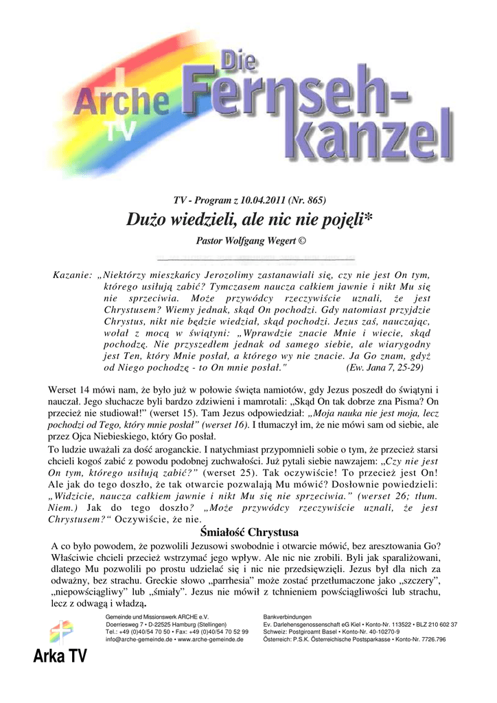 TV - Program z 10.04.2011 (Nr. 865) Dużo wiedzieli, ale nic nie pojęli* Pastor Wolfgang Wegert © Kazanie: „Niektórzy mieszkańcy Jerozolimy zastanawiali się, czy nie jest On tym, którego usiłują zabić? Tymczasem naucza całkiem jawnie i nikt Mu się nie sprzeciwia. Może przywódcy rzeczywiście uznali, że jest Chrystusem? Wiemy jednak, skąd On pochodzi. Gdy natomiast przyjdzie Chrystus, nikt nie będzie wiedział, skąd pochodzi. Jezus zaś, nauczając, wołał z mocą w świątyni: „Wprawdzie znacie Mnie i wiecie, skąd pochodzę. Nie przyszedłem jednak od samego siebie, ale wiarygodny jest Ten, który Mnie posłał, a którego wy nie znacie. Ja Go znam, gdyż od Niego pochodzę - to On mnie posłał." (Ew. Jana 7, 25-29) Werset 14 mówi nam, że było już w połowie święta namiotów, gdy Jezus poszedł do świątyni i nauczał. Jego słuchacze byli bardzo zdziwieni i mamrotali: „Skąd On tak dobrze zna Pisma? On przecież nie studiował!” (werset 15). Tam Jezus odpowiedział: „Moja nauka nie jest moja, lecz pochodzi od Tego, który mnie posłał” (werset 16). I tłumaczył im, że nie mówi sam od siebie, ale przez Ojca Niebieskiego, który Go posłał. To ludzie uważali za dość aroganckie. I natychmiast przypomnieli sobie o tym, że przecież starsi chcieli kogoś zabić z powodu podobnej zuchwałości. Już pytali siebie nawzajem: „Czy nie jest On tym, którego usiłują zabić?” (werset 25). Tak oczywiście! To przecież jest On! Ale jak do tego doszło, że tak otwarcie pozwalają Mu mówić? Dosłownie powiedzieli: „Widzicie, naucza całkiem jawnie i nikt Mu się nie sprzeciwia.” (werset 26; tłum. Niem.) Jak do tego doszło? „Może przywódcy rzeczywiście uznali, że jest Chrystusem?“ Oczywiście, że nie. Śmiałość Chrystusa A co było powodem, że pozwolili Jezusowi swobodnie i otwarcie mówić, bez aresztowania Go? Właściwie chcieli przecież wstrzymać jego wpływ. Ale nic nie zrobili. Byli jak sparaliżowani, dlatego Mu pozwolili po prostu udzielać się i nic nie przedsięwzięli. Jezus był dla nich za odważny, bez strachu. Greckie słowo „parrhesia” może zostać przetłumaczone jako „szczery”, „niepowściągliwy” lub „śmiały”. Jezus nie mówił z tchnieniem powściągliwości lub strachu, lecz z odwagą i władzą. Gemeinde und Missionswerk ARCHE e.V. Doerriesweg 7 • D-22525 Hamburg (Stellingen) Tel.: +49 (0)40/54 70 50 • Fax: +49 (0)40/54 70 52 99 [email protected] • www.arche-gemeinde.de Arka TV Bankverbindungen Ev. Darlehensgenossenschaft eG Kiel • Konto-Nr. 113522 • BLZ 210 602 37 Schweiz: Postgiroamt Basel • Konto-Nr. 40-10270-9 Österreich: P.S.K. Österreichische Postsparkasse • Konto-Nr. 7726.796 Strona 2 - TV-Program /865 „Dużo wiedzieli, ale nie pojęli“ Czasami, gdy głoszę biblijną prawdę jest tak, że jestem zakłopotany z powodu tych, którzy mnie krytykują - mimo, że mnie nie aresztowali i nie zabijają. Jednak boję się ich i pozwalam wewnątrz mnie zniechęcić. To wielokrotnie okradło moją moc i moje pełnomocnictwo. Jezus był inny. Mówił swobodnie, bez strachu i w wielkiej pewności! Jeśli zwiastując będziemy we wszystkim brać Jezusa za wzór, wtedy będziemy też odważnie stać dla wiecznej prawdy Ewangelii i nie pozwolimy aby nas zdezorientowano. Ale co robimy? Jakakolwiek prawda, jakiekolwiek przykazanie Boże nie jest już oportunizmem, coś się nie układa i już jesteśmy tchórzliwi. My nie chcemy wywoływać zgorszenia i postępować nieuprzejmie. Chcemy pokoju za wszelką cenę - nawet za cenę prawdy. Takim Jezus nie był. Nawet w godzinie zagrożenia życia nie odstąpił ani jednego milimetra od swego nauczania, lecz głosił z otwartą przyłbicą, po prostu całkowicie szczerze i prosto. Dlatego już w Starym Testamencie jest powiedziane o Nim: „Mój grzbiet nadstawiam tym, którzy biją. Mojej twarzy nie zasłaniam przed obelgami i pluciem. Lecz Wszechmocny Pan pomaga mi, dlatego nie zostałem zhańbiony, dlatego uczyniłem moja twarz twardą jak krzemień; wiedziałem bowiem, że nie będę zawstydzony” (Izajasz 50, 6-7). Jeżeli jako chrześcijanie żyjemy tak blisko z Jezusem jak On z Ojcem, to Jego odwaga będzie też naszą odwagą. I to objawi się wcześniej czy później, czy jego nauka jest z Boga lub nie. Tą otwartość do Ewangelii mieli również Apostołowie. Ap. Paweł pisze: „Bo ja nie wstydzę się Ewangelii. Ona jest mocą Boga dla zbawienia każdego, kto wierzy.” (Rzymian 1, 16). Również ty nie wstydź się Ewangelii, nawet jeśli wszyscy są przeciwko tobie. Uczyń również swoje czoło tak twarde jak krzemień. Przyznaj się do Słowa Pana i nie odstępuj ani jednego kroku w tył! Pan Bóg pomoże tobie i nie będziesz zawstydzony. Gdyż: „Bóg bowiem nie dał nam ducha bojaźni, ale mocy, miłości i opanowania (zdrowego rozsądku)” (Tymoteusz 1,7). Wiedzieć, ale nic nie rozpoznać Podczas, gdy słuchacze jeszcze zastanawiali się, za kogo prawdopodobnie uważają Jezusa starsi, rozważali sami w swoich myślach o Nim: „Wiemy jednak, skąd On pochodzi. Gdy natomiast przyjdzie Chrystus, nikt nie będzie wiedział, skąd pochodzi” (Ew. Jana 7, 27). Dla nich to było jasne, że Jezus, który właśnie mówił do nich, nie może być prawdziwym Mesjaszem. Ponieważ każdy wiedział skąd był. Ta opinia opiera się na tradycji wśród Żydów, że Mesjasz przyjdzie nagle, jak grom z jasnego nieba na ziemię. Do tego błędna interpretacja fragmentów Biblii, takich jak te: „Potem nagle przyjdzie do swej świątyni Pan, którego oczekujecie” (Malachiasz 3, 1). Oni mieli jakby pomysł, że prawdziwy Chrystus jakimś sposobem przyleci z nieba i nikt nie będzie wiedział, skąd przyszedł. Z tym Jezusem, z którym teraz mieli do czynienia, było inaczej. Oni znali Go od wczesnego dzieciństwa. Był przecież Synem Marii i Józefa, cieśli. Pochodził z Nazaretu, o czym wszyscy wiedzieli. „Tego m