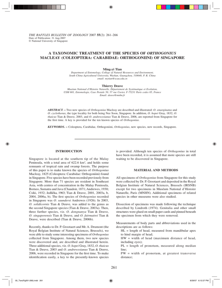 THE RAFFLES BULLETIN OF ZOOLOGY 2007 THE RAFFLES BULLETIN OF ZOOLOGY 2007 55(2): 261–266 Date of Publication: 31 Aug.2007 © National University of Singapore A TAXONOMIC TREATMENT OF THE SPECIES OF ORTHOGONIUS MACLEAY (COLEOPTERA: CARABIDAE: ORTHOGONIINI) OF SINGAPORE Ming-yi Tian Department of Entomology, College of Natural Resources and Environment, South China Agricultural University, Wushan, Guangzhou, 510640, P. R. China email: [email protected] Thierry Deuve Muséum National d’Histoire Naturelle, Département de Systématique et Evolution, USM 601, Entomologie, Case Postale 50, 57 rue Cuvier, F-75231 Paris cedex 05, France Email: [email protected] ABSTRACT. – Two new species of Orthogonius Macleay are described and illustrated: O. emarginatus and O. cyclothorax, the type locality for both being Nee Soon, Singapore. In addition, O. hopei Gray, 1832, O. thaicus Tian & Deuve, 2003, and O. andrewesianus Tian & Deuve, 2006, are reported from Singapore for the first time. A key is provided for the ten known species of Orthogonius. KEYWORDS. – Coleoptera, Carabidae, Orthogoniini, Orthogonius, new species, new records, Singapore. INTRODUCTION Singapore is located at the southern tip of the Malay Peninsula, with a total area of 622.6 km2, and holds some remnants of tropical rain and swamp forests. The purpose of this paper is to make known the species of Orthogonius Macleay, 1825 (Coleoptera: Carabidae: Orthogoniini) found in Singapore. Five species have been recorded previously from Singapore. More than 71 species are resident in Southeast Asia, with centres of concentration in the Malay Peninsula, Borneo, Sumatra and Java (Chaudoir, 1871; Andrewes, 1930; Csiki, 1932; Jedlicka, ˇ 1963; Tian & Deuve, 2001, 2003a, b, 2004, 2006a, b). The first species of Orthogonius recorded in Singapore was O. saundersi Andrewes (1926). In 2003, O. solidicornis Tian & Deuve, was added to the genus as the second Singapore species (Tian & Deuve, 2003a). Then, three further species, viz. O. dongnanya Tian & Deuve, O. singaporensis Tian & Deuve, and O. fairmairei Tian & Deuve, were described (Tian & Deuve, 2006b). Recently, thanks to Dr. P. Grootaert and Mr. A. Drumont (the Royal Belgian Institute of Natural Sciences, Brussels), we were able to study some interesting specimens of Orthogonius collected from Singapore. Among them, two new species were discovered and, are described and illustrated herein. Three additional species, viz. O. hopei Gray, 1832, O. thaicus Tian & Deuve, 2003 and O. andrewesianus Tian & Deuve, 2006, were recorded in Singapore for the first time. To make identification easily, a key to the presently-known species is provided. Although ten species of Orthogonius in total have been recorded, it is assumed that more species are still waiting to be discovered in Singapore. MATERIAL AND METHODS All specimens of Orthogonius from Singapore for this study were collected by Dr. P. Grootaert and deposited in the Royal Belgian Institute of Natural Sciences, Brussels (IRSNB) except for two specimens in Muséum National d’Histoire Naturelle, Paris (MNHN). Additional specimens of related species in other museums were also studied. Dissection of specimens was made following the technique described by Lindroth (1974). Genitalia and other small structures were glued on small paper cards and pinned beneath the specimen from which they were removed. Measurements of body parts and abbreviations used in the descriptions are as follows: HL = length of head, measured from mandibular apex to hind margin of head; HW = width of head (maximum distance of head, including eyes); PL = length of pronotum, measured along median line; PW = width of pronotum, at greatest transverse distance; 261 05_Tian(Pg261-266).indd 261 8/29/07 6:12:27 PM Tian & Deuve: Orthogonius of Singapore EL = length of elytra, from base to apex of right elytron, measured along suture; EW = width of elytra, greatest transverse distance across both elytra. Length of body was measured directly from mandibular apex to elytral apex. Orthogonius emarginatus, new species (Figs. 1–6) Type material. – Holotype: male, labeled “Coll. I. R. Sc. N. B. / Singapore, Nee Soon, Mal trap 1, Swamp forest, Station 25046. 5 Apr. 2005. P. Grootaert coll.”, collected at Nee Soon, Singapore (type locality) and deposited in IRSNB. Description. – Body: Length 15.0 mm; width 6.0 mm. Form stout; surface markedly shiny. Color: Body black; antennae, palpi, legs and ventral surface reddish dark brown. Macrosculpture. Head: dorsal surface without striation, but densely and moderately punctate; base of neck and median portion of vertex impunctate. Pronotum smooth, glabrous, shallowly striate. Elytra with intervals very shallowly and sparsely punctate. Ventral surface smooth and glabrous. Microsculpture: Mesh pattern isodiametric on dorsal surface of head, but densely and moderately transverse on pronotum and elytra. Head: Slightly wider than long (HW/HL = 1.15), convex. Frontal impressions large and deep, fovea-like, not extended to level of anterior pair of supraorbital setae; clypeus bisetose, surface uneven, slightly raised at base. Eyes very large and Figs. 1–6. Line drawings of structural features of Orthogonius emarginatus, new species: 1, left fore tibia, dorsal view; 2, left mid femur, ventral view; 3, apex of right elytron; 4, abdominal ventrite VII of male, ventral view; 5, aedeagus, right lateral view; 6. apical portion of aedeagus, dorsal view. Scale bars: 1 mm. A for Figs. 3–4; B for Figs. 1–2 and 5–6. 262 05_Tian(Pg261-266).indd 262 8/29/07 6:12:27 PM THE RAFFLES BULLETIN OF ZOOLOGY 2007 markedly prominent, longitudinal diameter of eye about twothirds distance between eyes. Antennae rather long, slightly extended over base of elytra; antennomere 4 longer than antennomere 3, almost twice as long as antennomere 2. Mouthparts: Labrum six setose, straight at front margin. Comparisons. – This new species is closely resembles to O. andrewes