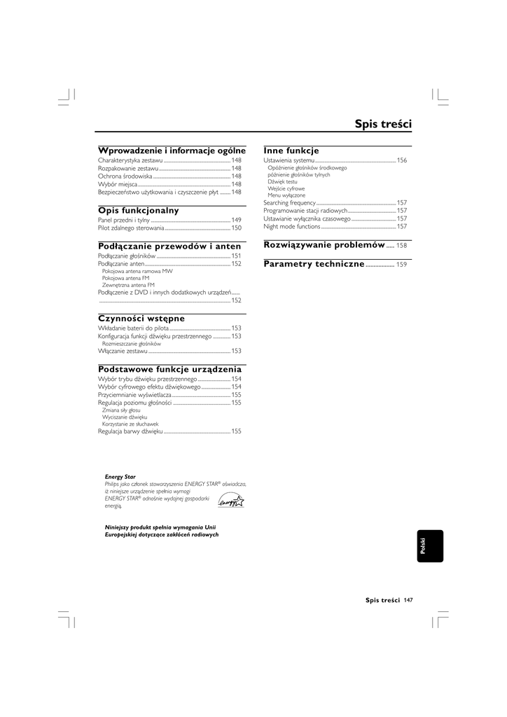 Spis treści Wprowadzenie i informacje ogólne Inne funkcje Charakterystyka zestawu ......................................................... 148 Rozpakowanie zestawu ............................................................. 148 Ochrona środowiska .................................................................. 148 Wybór miejsca ............................................................................... 148 Bezpieczeństwo użytkowania i czyszczenie płyt ......... 148 Ustawienia systemu ..................................................................... 156 Opóźnienie głośników środkowego późnienie głośników tylnych Dźwięk testu Wejście cyfrowe Menu wyłączone Panel przedni i tylny .................................................................... 149 Pilot zdalnego sterowania ........................................................ 150 Searching frequency .................................................................... 157 Programowanie stacji radiowych ......................................... 157 Ustawianie wyłącznika czasowego ...................................... 157 Night mode functions ................................................................ 157 Podłączanie przewodów i anten Rozwiązywanie problemów ..... 158 Podłączanie głośników ............................................................... 151 Podłączanie anten ......................................................................... 152 Parametry techniczne .................. 159 Opis funkcjonalny Pokojowa antena ramowa MW Pokojowa antena FM Zewnętrzna antena FM Podłączenie z DVD i innych dodatkowych urządzeń....... ................................................................................................................ 152 Czynności wstępne Wkładanie baterii do pilota .................................................... 153 Konfiguracja funkcji dźwięku przestrzennego ............... 153 Rozmieszczanie głośników Włączanie zestawu ...................................................................... 153 Podstawowe funkcje urządzenia Wybór trybu dźwięku przestrzennego ............................ 154 Wybór cyfrowego efektu dźwiękowego ......................... 154 Przyciemnianie wyświetlacza .................................................. 155 Regulacja poziomu głośności ................................................. 155 Zmiana siły głosu Wyciszanie dźwięku Korzystanie ze słuchawek Regulacja barwy dźwięku ......................................................... 155 Energy Star Philips jako członek stowarzyszenia ENERGY STAR® oświadcza, iż niniejsze urządzenie spełnia wymogi ENERGY STAR® odnośnie wydajnej gospodarki energią. Polski Niniejszy produkt spełnia wymagania Unii Europejskiej dotyczące zakłóceń radiowych Spis treści 147 Wprowadzenie i informacje ogólne Charakterystyka zestawu Ochrona środowiska Cyfrowy system kina domowego LX700 zapewnia taka samą jakość dźwięku jaką spotykamy w dobrze wyposażonych kinach i wykorzystuje niektóre z najlepszych funkcji technologii kina domowego. Produkt opakowany został z użyciem minimalnej ilości środków pakunkowych. W tym celu wykorzystano trzy rodzaje materiałów: tektura (karton), styropian (wkładki amortyzujące) i polietylen (torebki foliowe, folia zabezpieczająca). Obejmują one: Wbudowane dekodery DTS i Dolby® Digital oraz obsługa Dolby® Pro Logic II i wirtualnego dźwięku przestrzennego Pozwala doświadczyć charakterystycznego dla kin dźwięku przestrzennego w warunkach domowych. Możliwość podłączenia urządzeń zewnętrznych Umożliwia podłączenie do zestawu innych urządzeń audio lub audio/wideo i odsłuchiwanie odtwarzanego przez nie dźwięku przy użyciu głośników zestawu. Zestaw wykonano z materiałów, które mogą być utylizowane i wykorzystane do powtórnej obróbki przez specjalistyczne firmy. Prosimy o przestrzeganie lokalnych przepisów dotyczących pozbywania się materiałów pakunkowych, rozładowanych baterii oraz urządzeń elektronicznych. Wybór miejsca Tryb nocny Pozwala uzyskać optymalną dynamikę dźwięku przy niskim poziomie głośności. Jeżeli zamierzamy ustawić razem kilka komponentów wieży hi-fi, niniejszy odbiornik musi znajdować się na górze. Odbiornik powinien znajdować się na twardym, stabilnym podłożu. Nie wolno zasłaniać żadnych otworów wentylacyjnych, należy również pozostawić 50 cm przestrzeni nad odbiornikiem oraz 10 cm z prawej i lewej strony odbiornika dla zapewnienia odpowiedniej wentylacji. Wyłącznik czasowy Umożliwia automatyczne przełączenie zestawu w tryb gotowości po upływie czasu określonego przez użytkownika. Bezpieczeństwo użytkowania i czyszczenie płyt Rozpakowanie zestawu – – – – – – – – – – Pilot zdalnego sterowania z dwiema bateriami AA. Ramowa antena MW oraz przewodowa antena FM. kable podłączeń audio. Pięć głośników satelitarnych wraz z pięcioma. przewodami głośnikowymi. Aktywny subwoofer wraz z przewodem połączeniowym i zasilającym. Przewód zasilający jednostki centralnej. 4 podstawki głośników i 4 śruby 4 mini stojaki pod głośniki i 8 śrub Instrukcja Przewodnik skróconej obsługi W przypadku braku lub uszkodzenia któregokolwiek z elementów należy skontaktować się ze sprzedawcą lub firmą Philips. Polski 148 Wprowadzenie i informacje ogólne ● Odtwarzacz, baterie oraz płyty należy zabezpieczyć przed wilgocią, deszczem, piaskiem oraz wysokimi temperaturami (grzejniki, bezpośrednie światło słoneczne). Szuflada odtwarzacza powinna być zawsze zamknięta, co zapobiega zbieraniu się kurzu na soczewce. ● Nie należy używać benzyny, rozpuszczalników ani ogólnie dostępnych preparatów czyszczących i antystatycznych w sprayu przeznaczonych do płyt analogowych. Opis funkcjonalny Panel przedni i tylny 1 2 34 C 6 CHANNEL INPUT 5 6 7 1 SURROUND – – 7 PROGRAM 2 – 3 – 4 – 5 